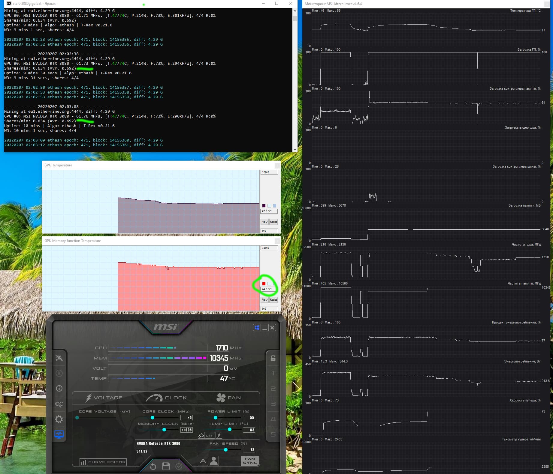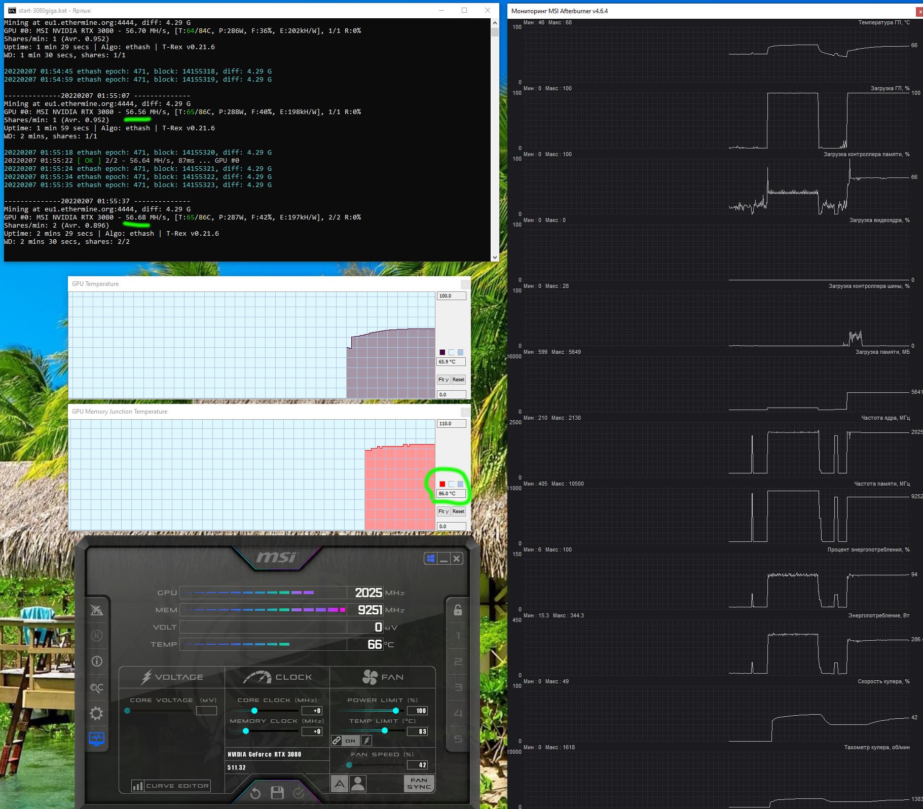 Оптимизация настроек работы видеокарт под майнинг в нашем случае не предусматривает сильного разгона видеопамяти, также обязательным является внешний обдув видеокарт. Особо тщательно надо следить за нагревом GDDR6X, ибо максимум для этой памяти — 110 градусов, и она долго не проживет, постоянно работая в условиях нагрева выше 100 °C.