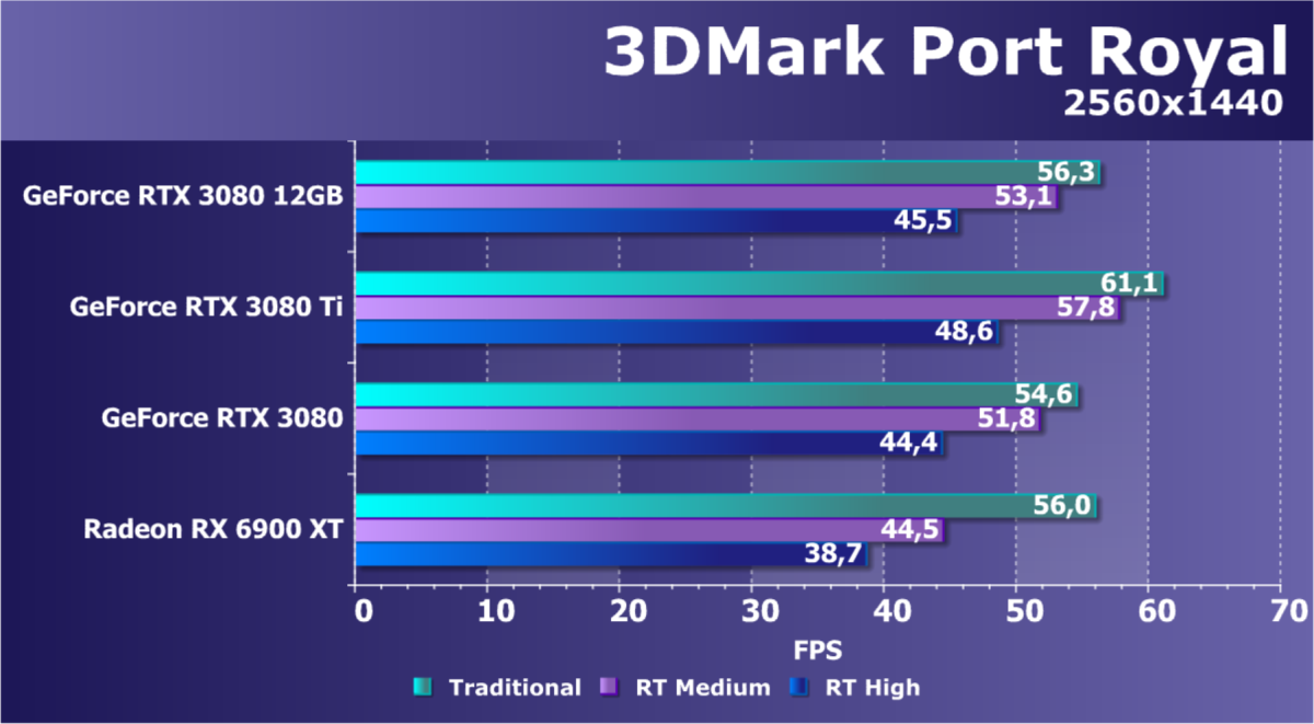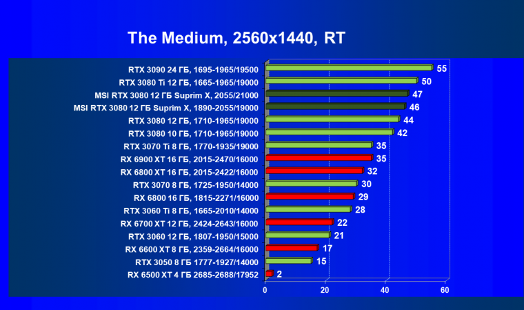 Что касается именно RTX 3080 12 ГБ, то ее рейтинг в играх с RT лишь ненамного снизился по сравнению с классическими играми: даже с RT (+DLSS/FSR) такой ускоритель очень хорошо подходит для игр в разрешении 4К. Карта MSI немного быстрее референс-аналога, поэтому выводы по ней еще более оптимистичны.
