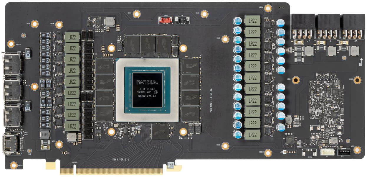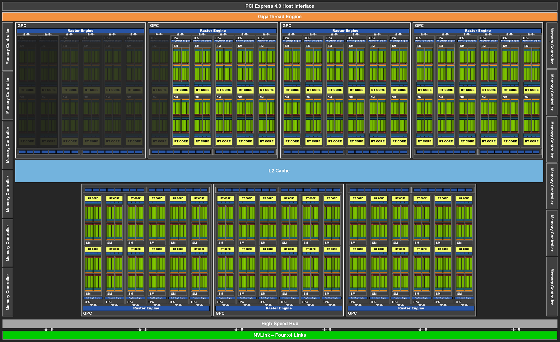 Полный чип GA102 содержит семь кластеров GPC и 84 мультипроцессора SM — по 12 штук на каждый кластер. Каждый GPC содержит по шесть кластеров TPC, состоящих из пары мультипроцессоров SM, пары RT-ядер и одного движка PolyMorph Engine для работы с геометрией. И всего полная версия графического процессора GA102 содержит 10752 потоковых CUDA-ядра, 84 RT-ядра второго поколения и 336 тензорных ядер третьего поколения.