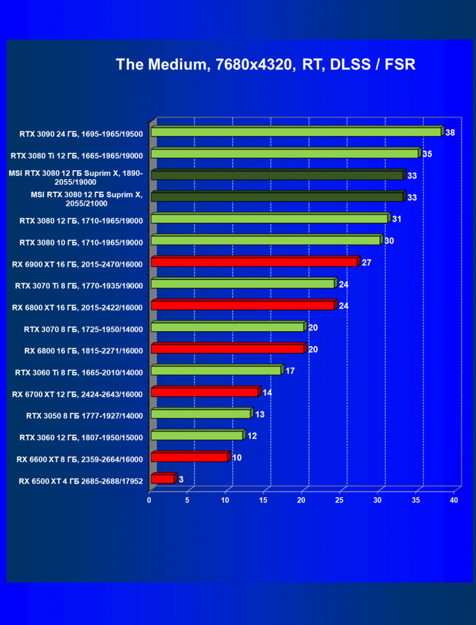 Результаты тестов с включенной аппаратной трассировкой лучей (и DLSS/FSR) в разрешении 7680×4320 (8К)
