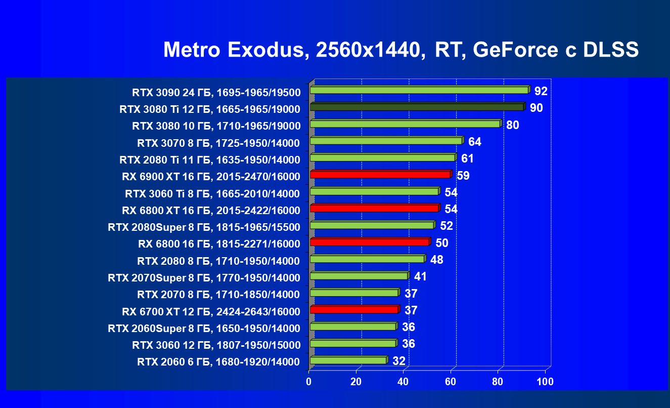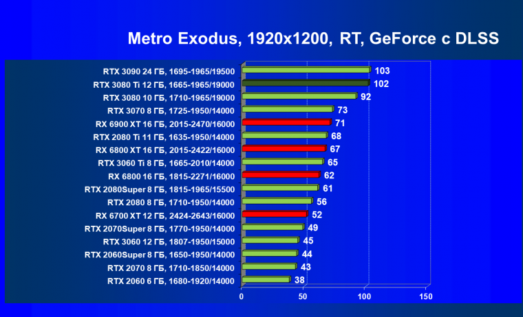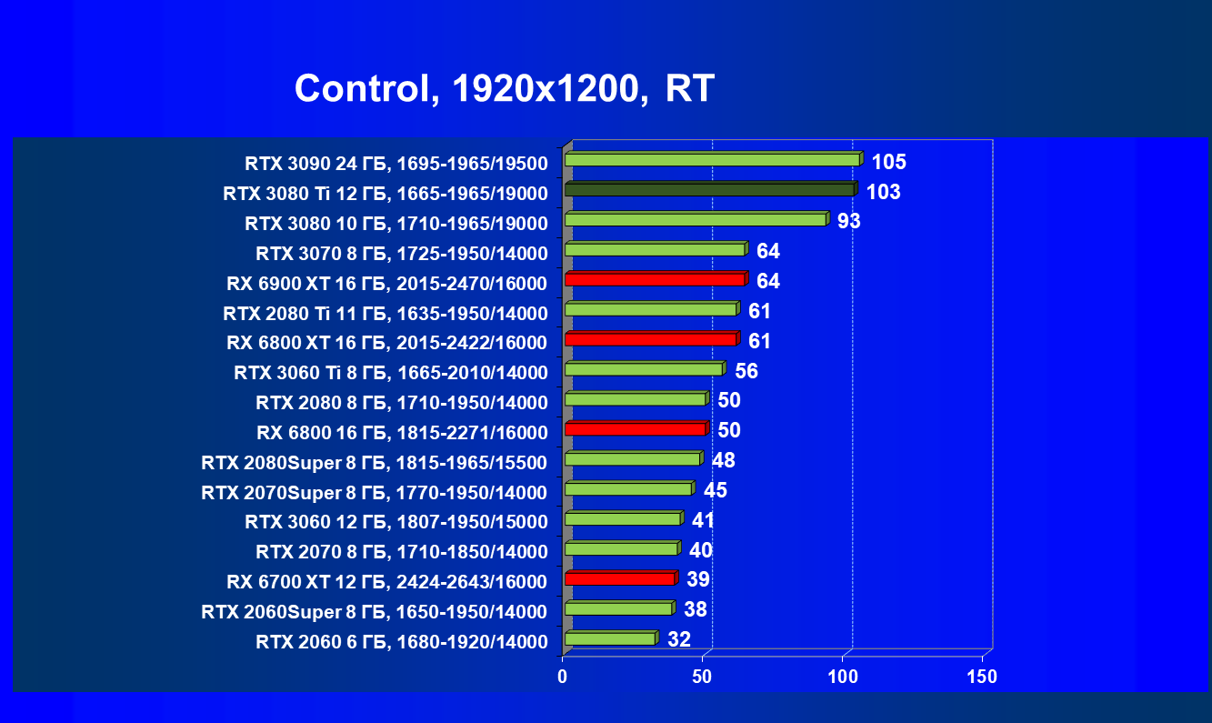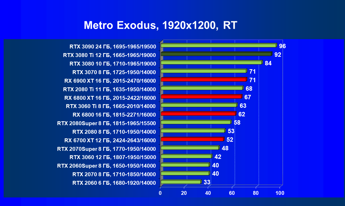 Зато у решений AMD больше видеопамяти — 16 ГБ против 12 ГБ, хотя в играх в обозримом будущем это вряд ли как-то скажется. В отличие от профессионального применения для создания цифрового контента, в которых каждый гигабайт на счету. Но у Nvidia там есть более мощная RTX 3090 с 24 ГБ памяти, лучше подходящая для профессиональных задач. Ну а 12 ГБ в случае RTX 3080 Ti можно считать оптимальным объемом видеопамяти, с учетом ширины шины.