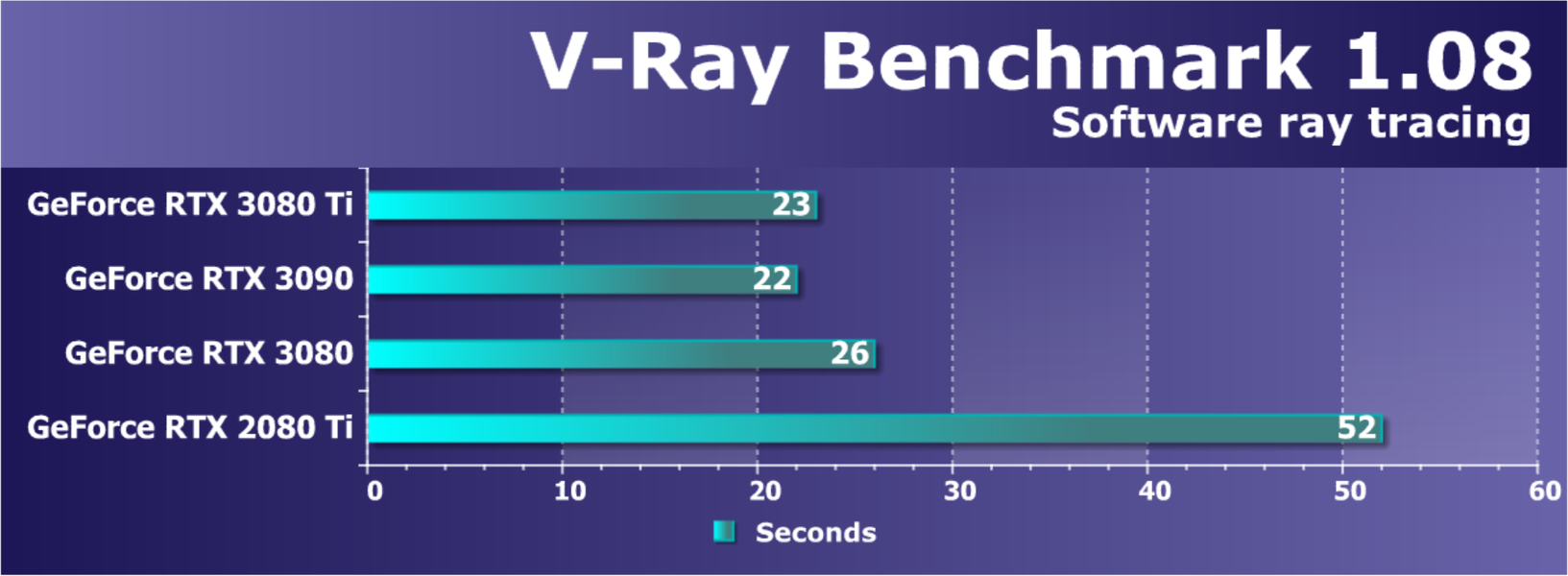 Также новый GPU до двух раз быстрее RTX 2080 Ti в трассировке лучей, а сочетание работы RT-ядер и тензорных ядер обеспечивает еще большее качество картинки при помощи эффективного шумоподавления Optix AI Denoising, использующего искусственный интеллект. Такой шумодав поддерживается в приложениях: Autodesk Arnold, REDSHIFT, Chaos V-ray, OTOY OctaneRender и Blender Cycles. Все это позволяет получить на RTX 3080 Ti очень быстрый рендеринг сцен при предпросмотре и в рабочей среде 3D-приложений, что увеличивает удобство работы и ускоряет весь процесс.