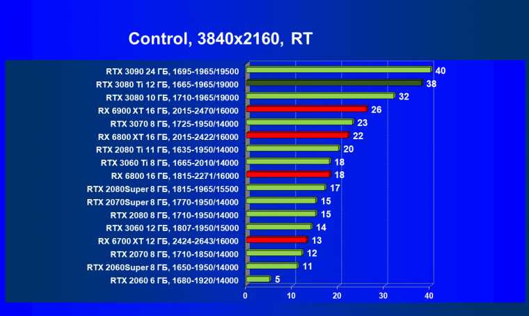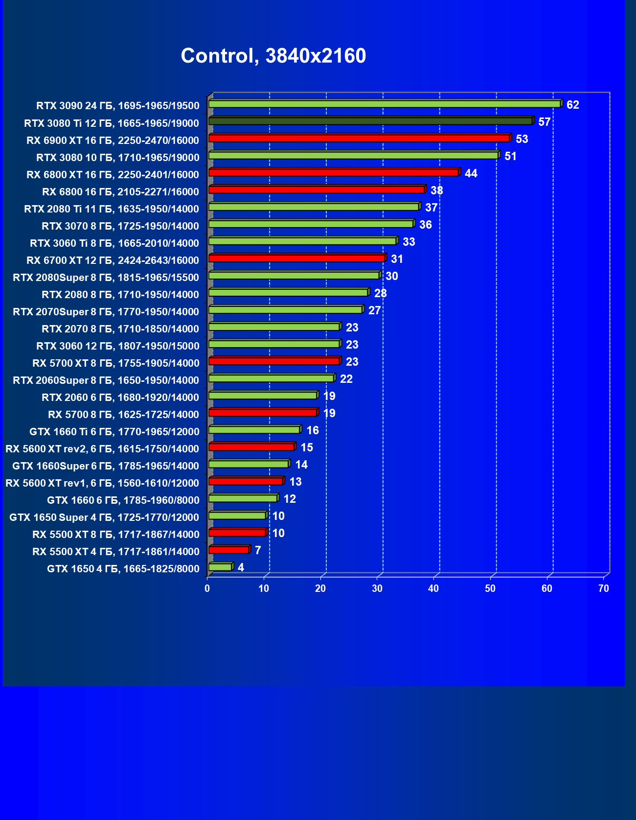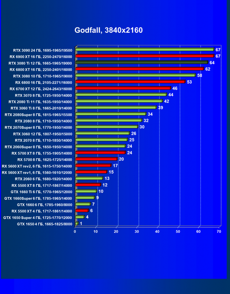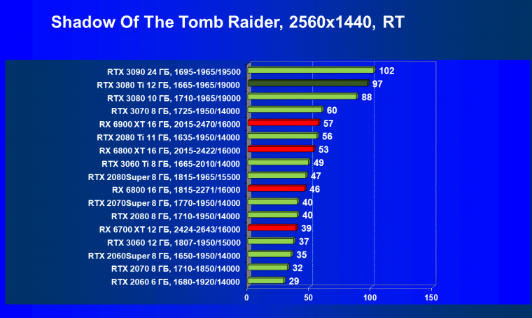 Ничего нового мы тут не скажем. В играх с трассировкой лучей соперничество новых Radeon с GeForce RTX происходит на уровень ниже: даже RTX 3080 сильно выше по рейтингу, чем топовый RX 6900 XT.