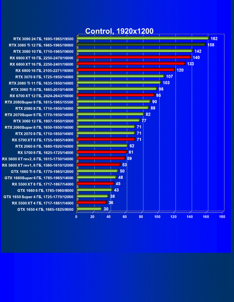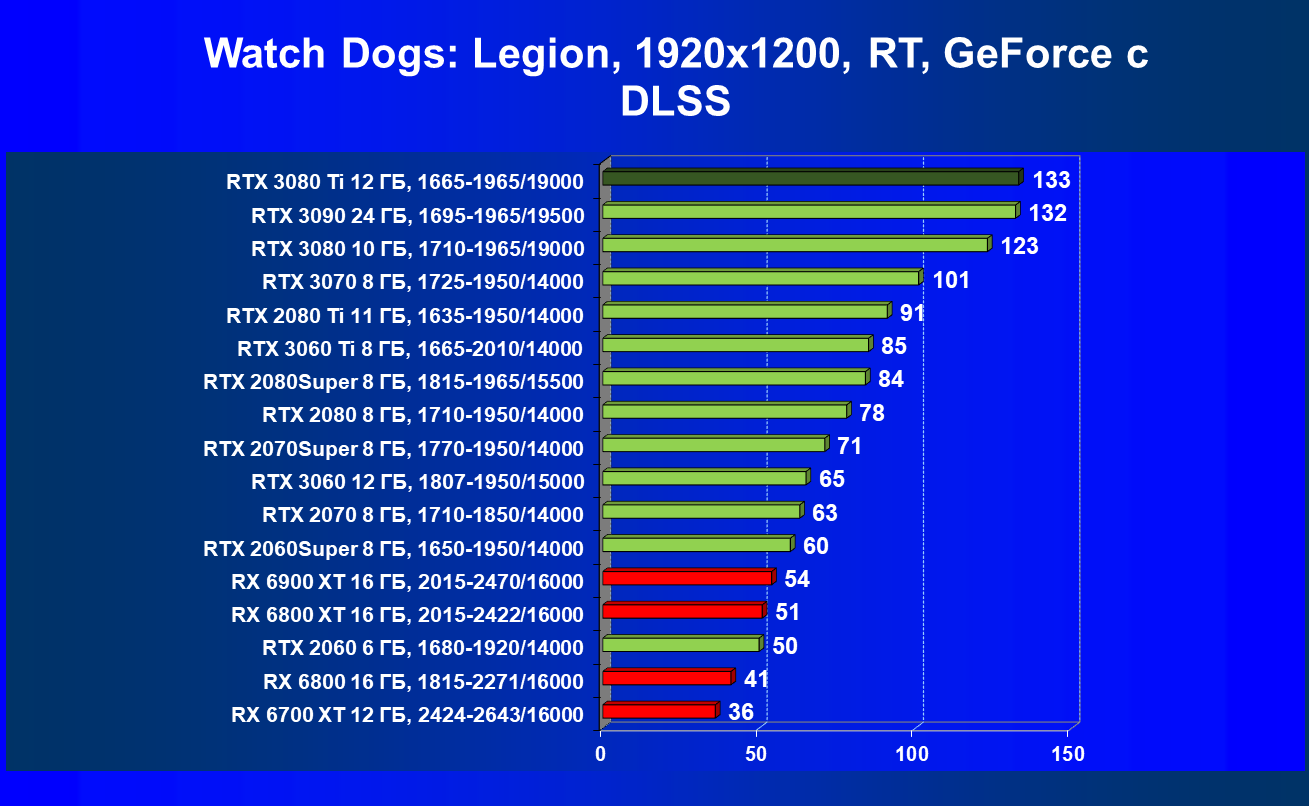 Если мы рассматриваем классические игры (без трассировки лучей и/или DLSS), то прекрасно видно, что RTX 3080 Ti прилично оторвался от RTX 3080, обошел соперника в лице RX 6800 XT и практически догнал RX 6900 XT. Да и до RTX 3090 не так много осталось (интересно будет посмотреть, что покажут нереференсные версии карт от партнеров Nvidia с фабрично повышенными частотами: по идее и RTX 3090 должен быть поверженным, иначе смысла не будет в разгоне).