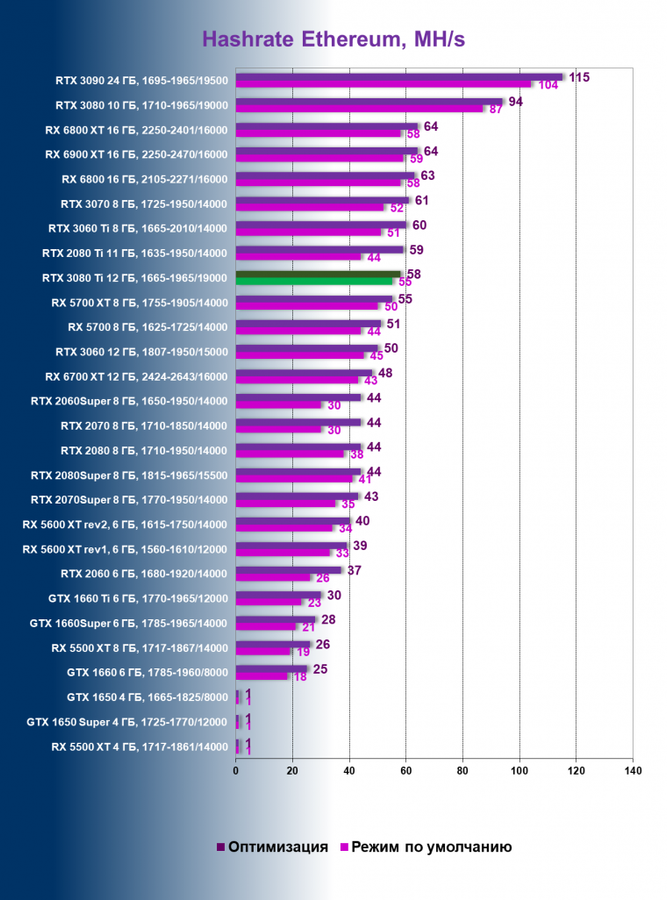 Тесты наглядно показали, что защита от майнинга по алгоритму ethash реально работает, сбрасывая хэшрейт в 2 раза (то есть 3080 Ti демонстрирует эффективность майнинга ETH/ETC на уровне RTX 3060Ti, Radeon RX 5700, имея при этом явно более высокую стоимость) на скринах ниже отмечено зеленым.