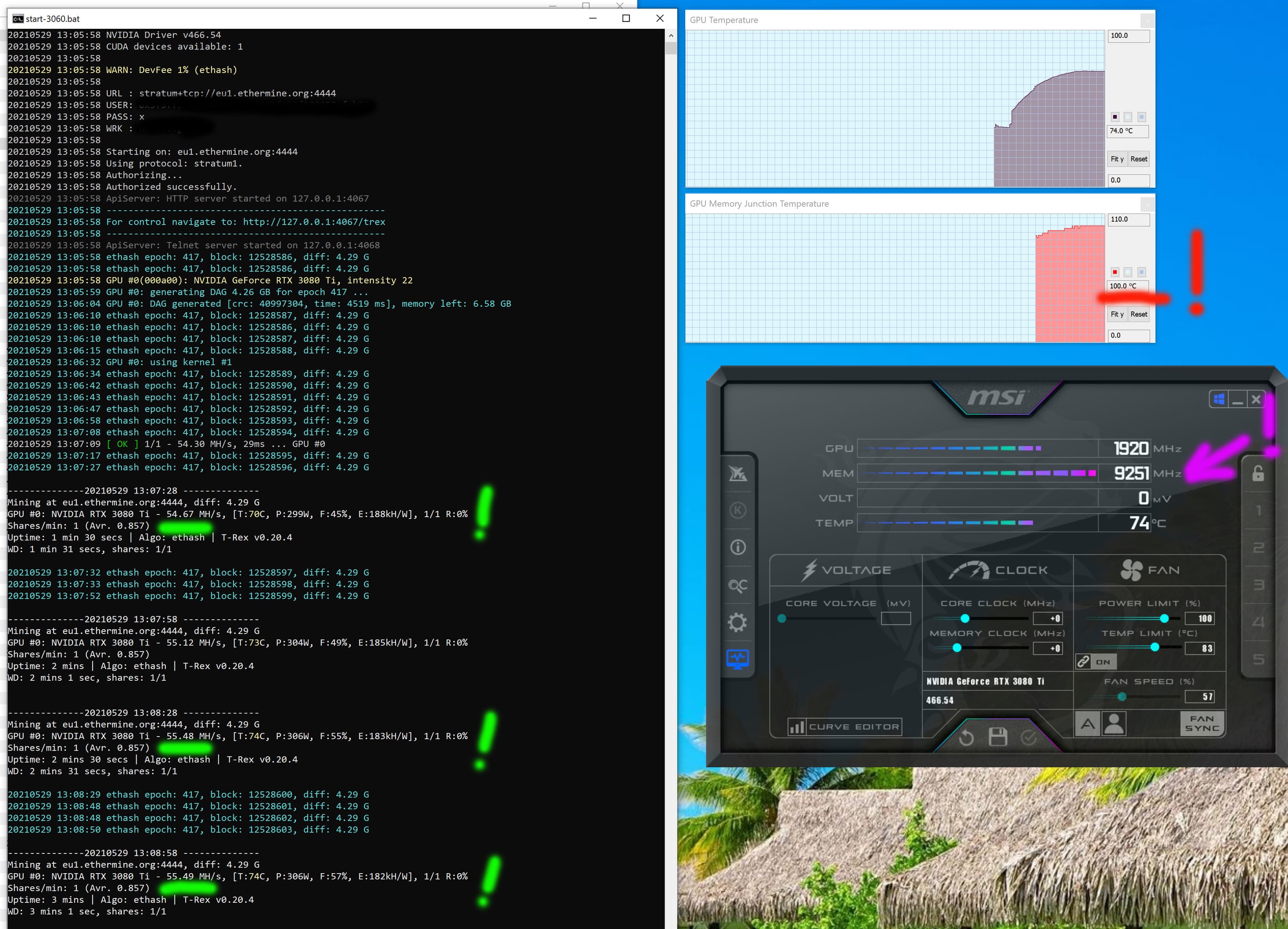 Оптимизация настроек работы видеокарт под майнинг в нашем случае не предусматривает сильного разгона видеопамяти, также обязательным является внешний обдув видеокарт. Особо тщательно надо следить за нагревом GDDR6X у GeForce RTX 3080/3090, ибо максимум для этой памяти — 110 градусов, и она долго не проживет, постоянно работая в условиях нагрева выше 100 °C.