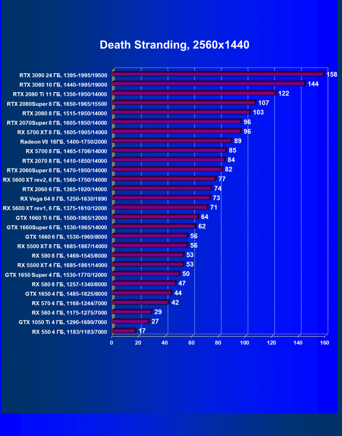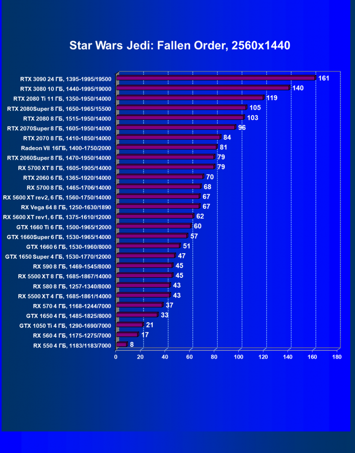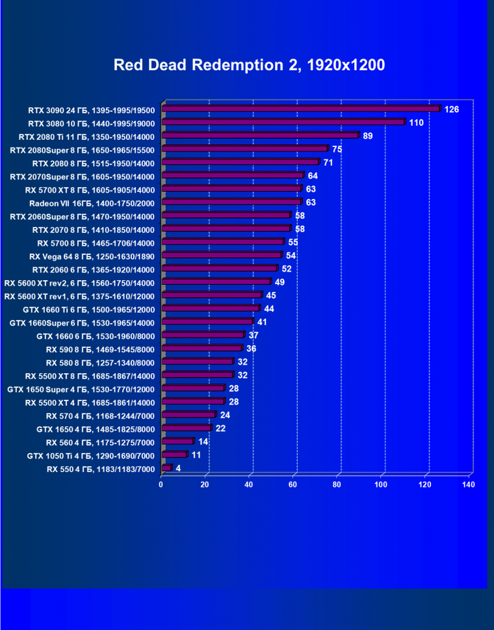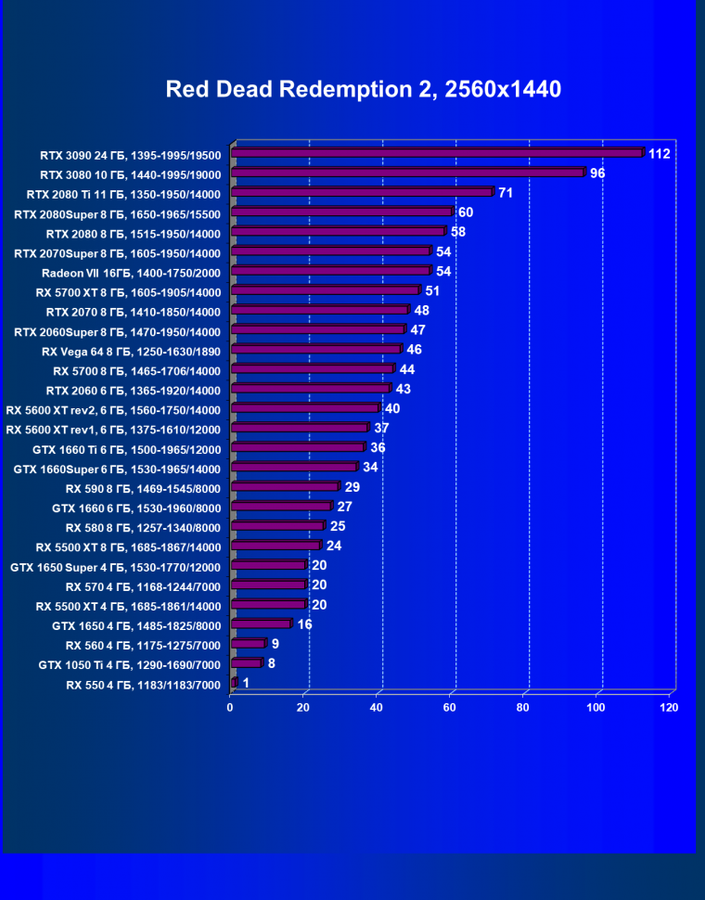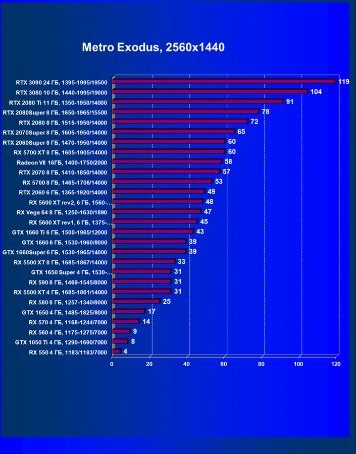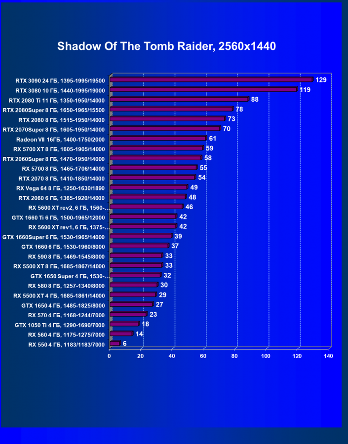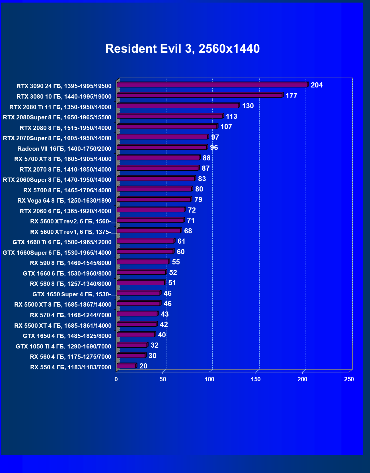 - Стандартные результаты тестов без использования аппаратной трассировки лучей в разрешениях 1920×1200, 2560×1440 и 3840×2160