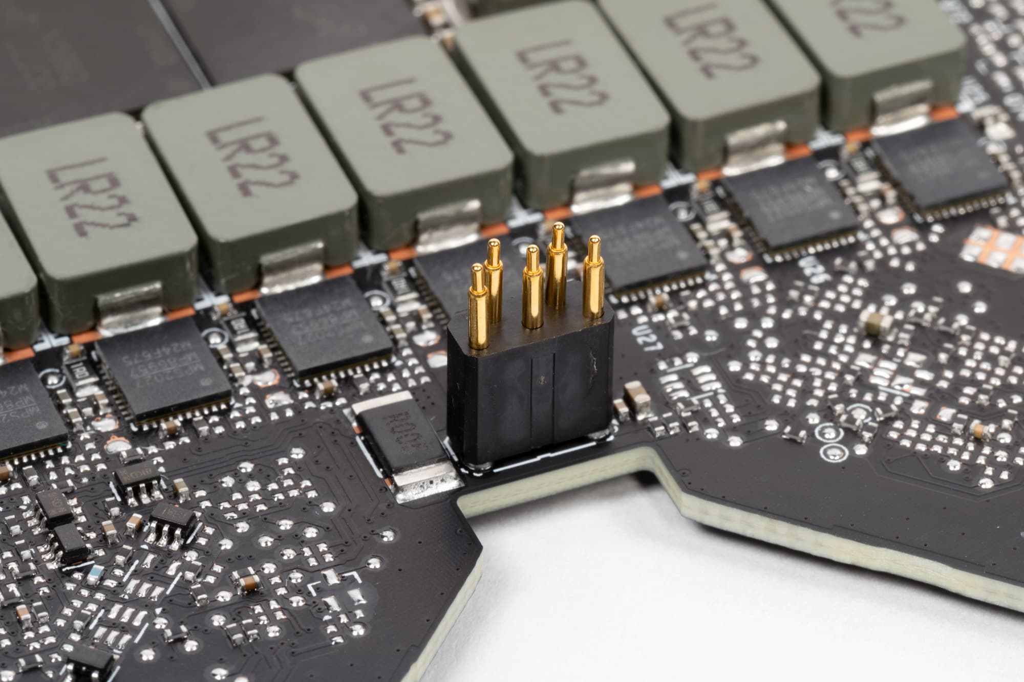 Подобное решение заставило инженеров менять всю конструкцию. Если обычные печатные платы проходят во всю длину видеокарт, то в случае продувного вентилятора пришлось разработать короткую печатную плату, с уменьшенным слотом NVLink, новыми разъемами питания (переходник на два обычных 8-контактных PCI-E прилагается). При этом, разместить на карте большое количество фаз для питания и микросхем памяти, было очень непросто. Но эти изменения дали возможность большого выреза для вентилятора на печатной плате, чтобы потоку воздуха ничего не мешало.