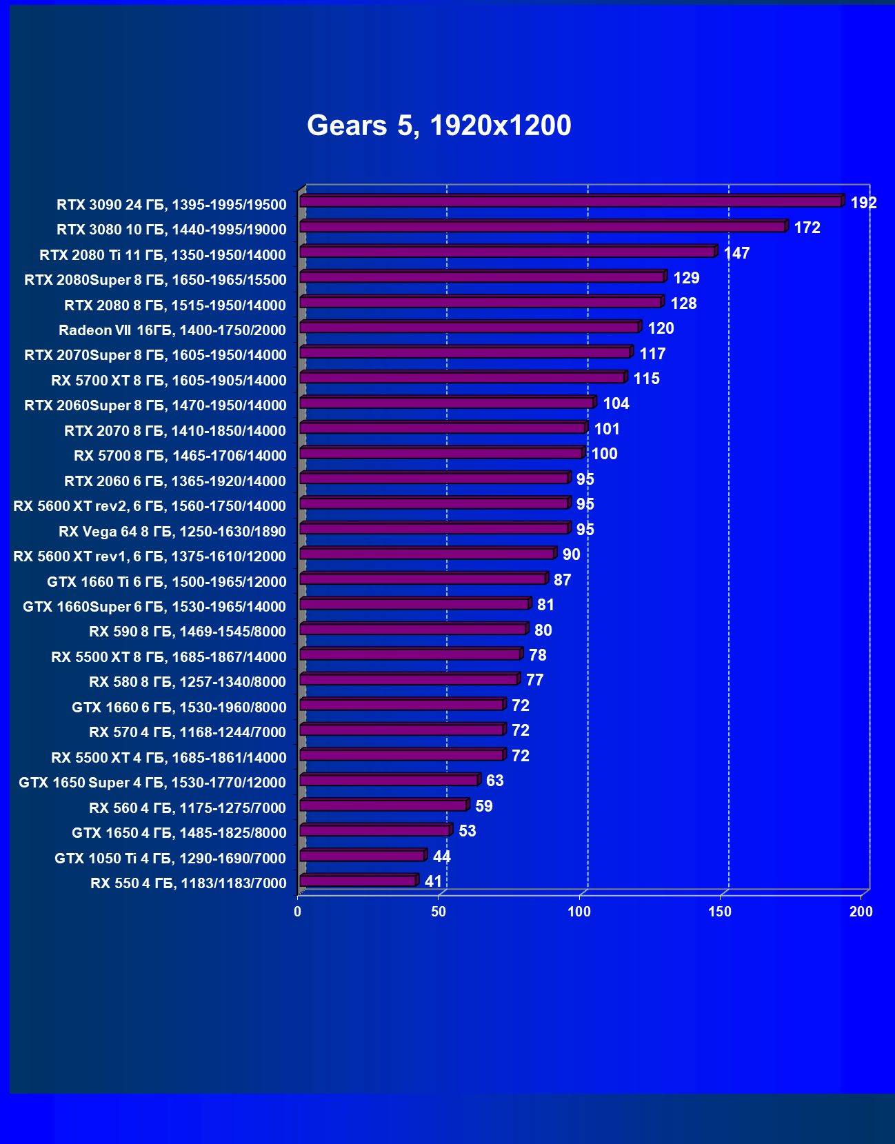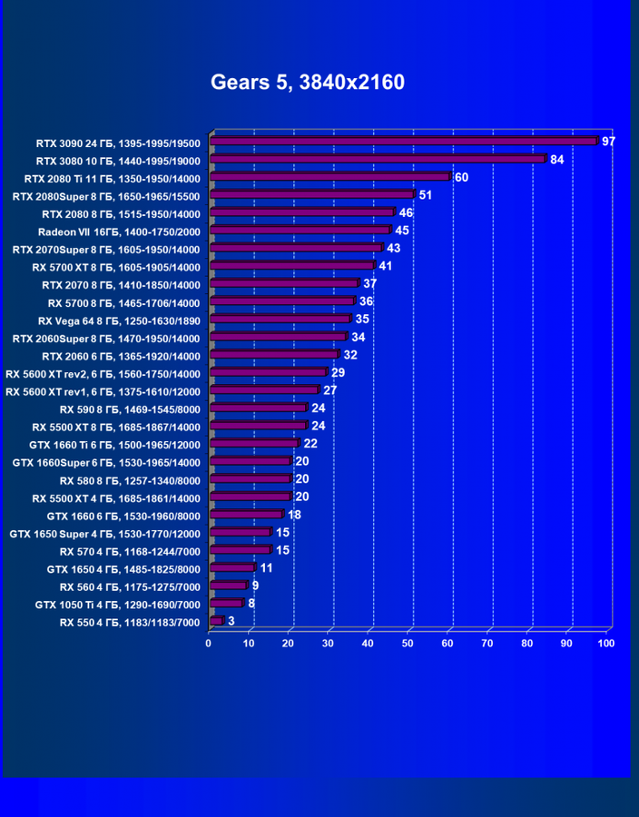 Рейтинг ускорителей iXBT.com демонстрирует нам функциональность видеокарт друг относительно друга и нормирован по самому слабому ускорителю — Radeon RX 550 (то есть сочетание скорости и функций Radeon RX 550 приняты за 100%). Рейтинги ведутся по 28 ежемесячно исследуемым нами акселераторам в рамках проекта Лучшая видеокарта месяца. В данном случае из общего списка выбрана группа карт для анализа, в которую входят GeForce RTX 3090 и его конкуренты.