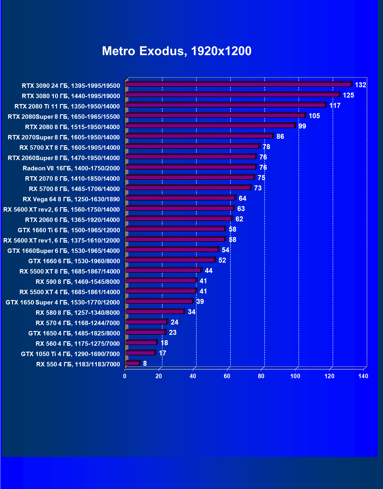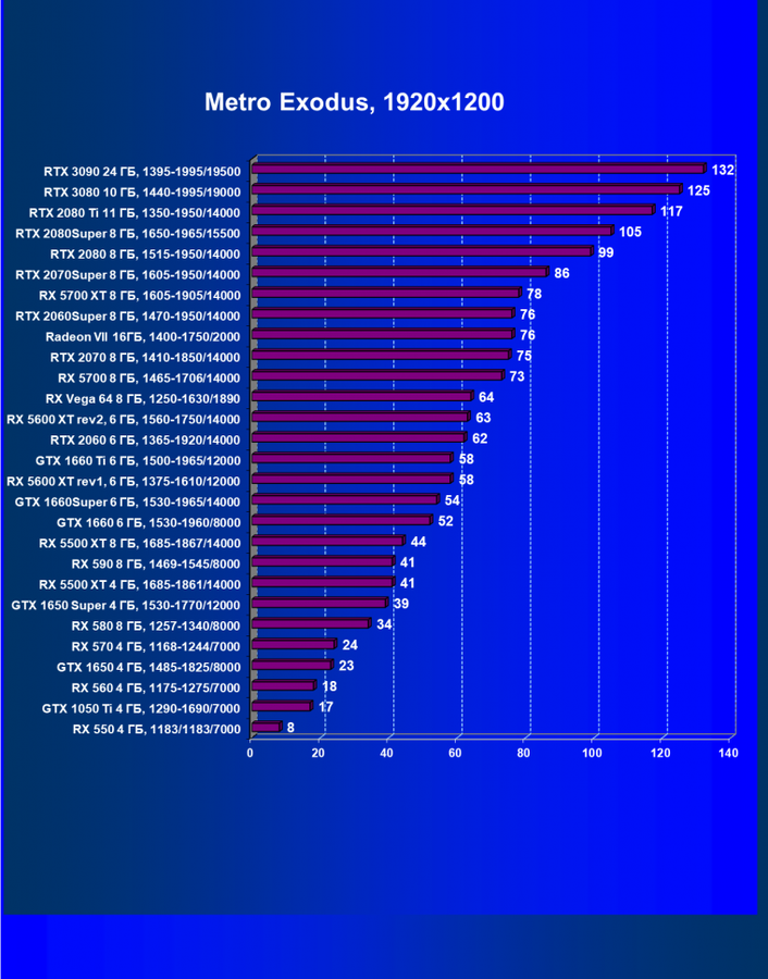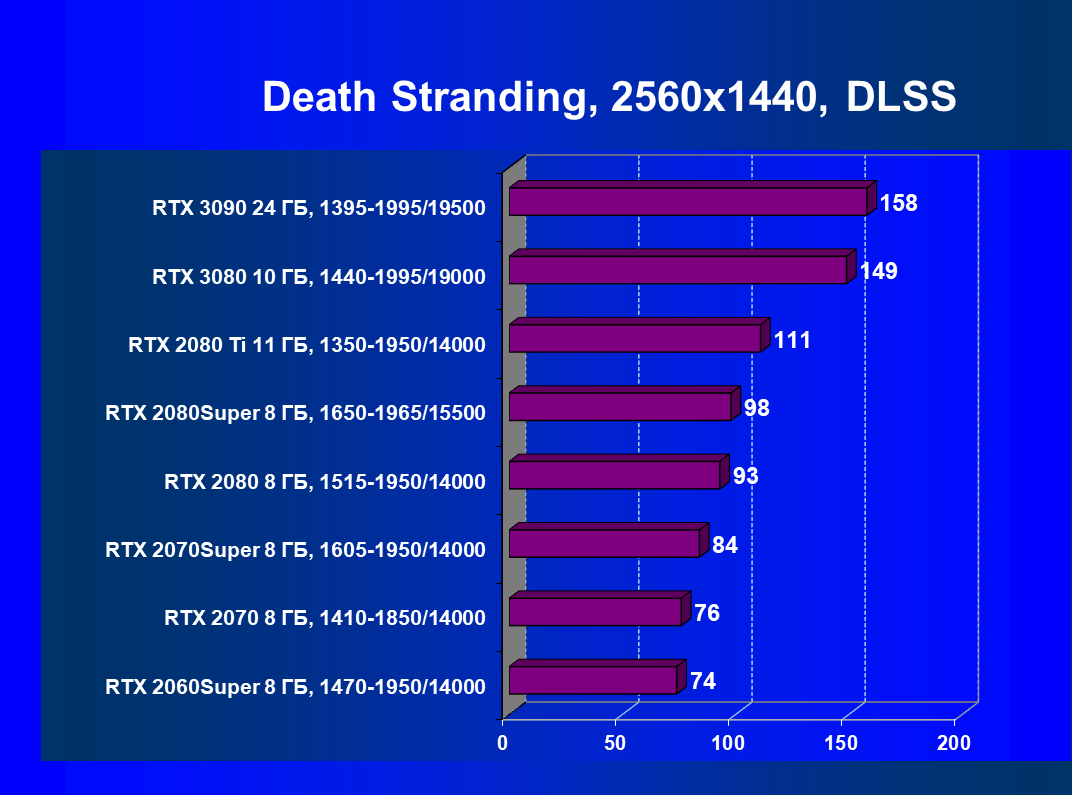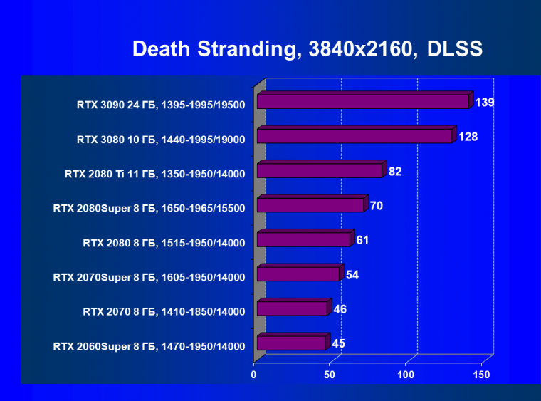 Изюминка нового ускорителя — реальная поддержка разрешения 8К, поскольку GeForce RTX 3090 обладает достаточной производительностью, чтобы некоторые игры с использованием DLSS обеспечивали игроку приемлемый комфорт на максимальных настройках графики в 8К. А объем памяти у новинки позволит свободно хранить необходимые текстуры и данные даже для столь высокого разрешения. От GeForce RTX 3080, как и от GeForce RTX 2080 Ti, такого ждать не приходится, их производительность в 8K будет на грани минимальной играбельности — в том числе из-за ограничения локальной видеопамяти объемом 10-11 ГБ. В видеоролике выше можно в конце увидеть всего 25-28 fps в 8К — это был запуск Metro Exodus без DLSS, с которым производительность вырастает более чем в 2 раза (как мы показали выше).