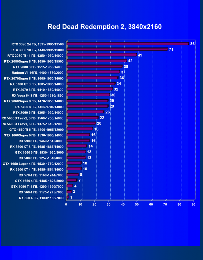 У компании AMD соперников для GeForce RTX 3090 в нашем сегодняшнем сравнении снова просто не существует. Ждем конца октября, когда новые Radeon будут объявлены, а скорее даже ноября, когда они появятся у нас на тестах. Ну а пока нам ничего не остается, кроме как снова сравнивать новинки Nvidia с парой видеокарт: результаты Radeon VII присутствуют в качестве самого быстрого решения, хоть уже и давно исчезнувшего из продажи, а также есть Radeon RX 5700 XT — наиболее производительный графический процессор архитектуры RDNA первого поколения.