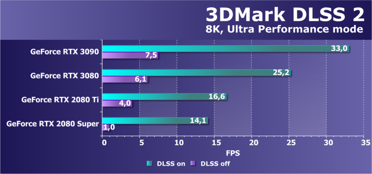 Совсем недавно вышли обновления драйверов, добавившие поддержку DLSS в 8К, так что мы провели тестирование в трех играх с участием RTX/DLSS (8К-телевизор был в нашем распоряжении не так долго, времени на большее число тестов просто не хватило).
