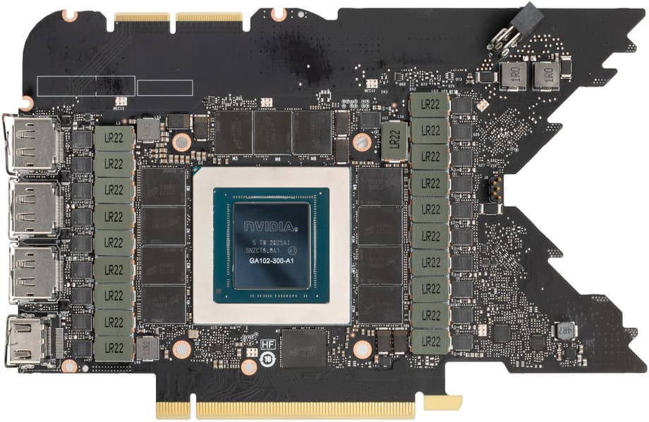 При производстве GA102 используется техпроцесс 8 нм компании Samsung, он дополнительно оптимизирован именно для Nvidia. Старший игровой чип Ampere содержит 28,3 миллиарда транзисторов и имеет площадь 628,4 мм² — это хороший шаг вперед по сравнению с 12 нм у Turing, но тот же техпроцесс 7 нм на TSMC по плотности все же превосходит 8 нм у Samsung, если судить по чипам одной архитектуры Ampere, сравнивая игровой GA102 и большой чип GA100, который производится именно на тайваньских фабриках.