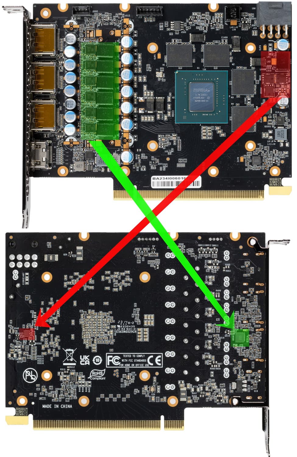 GeForce RTX 4060 Ti существует также и в виде Founders Edition. Вариант исполнения самой Nvidia сохранил двухвентиляторную сквозную конструкцию системы охлаждения Founders Edition последних поколений. Эффективность охлаждения хорошая, кулер очень похож на систему охлаждения RTX 4070 FE, за исключением некоторых внешних деталей. Холодный воздух поступает от одного вентилятора, проходит через радиаторы и выбрасывается вторым вентилятором. На видеокарте Founders Edition используется новый 16-контактный разъем питания ATX 12VHPWR, который упрощает подключение питания, но имеет свои недостатки. Впрочем, в случае не слишком мощной видеокарты они проявиться не должны. Для подключения старых БП в поставке есть переходник, преобразующий питание с двух привычных 8-контактных разъемов PCIe.