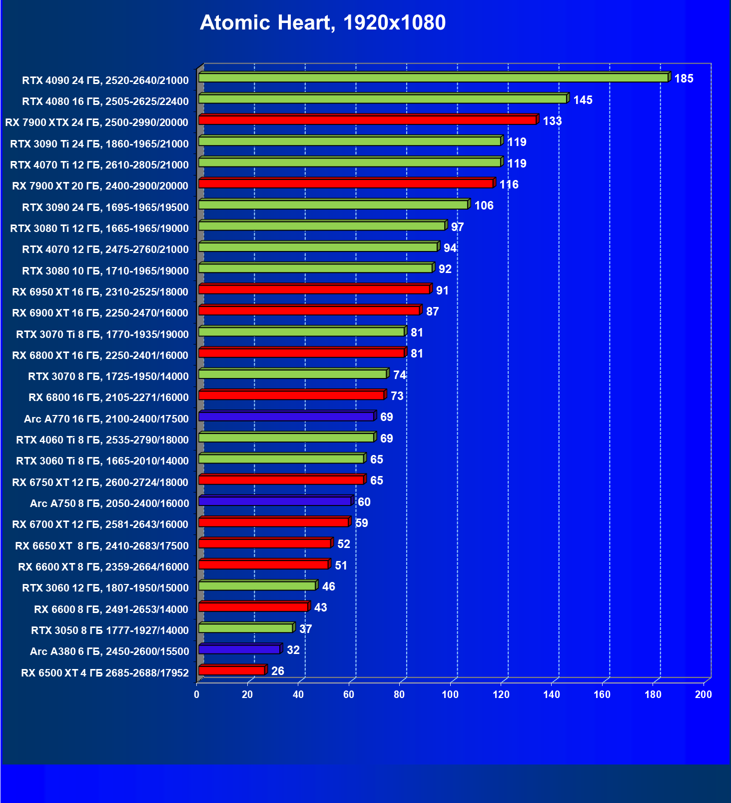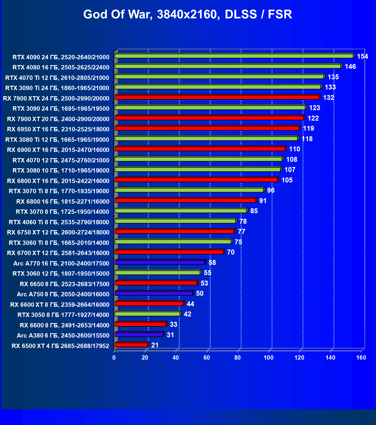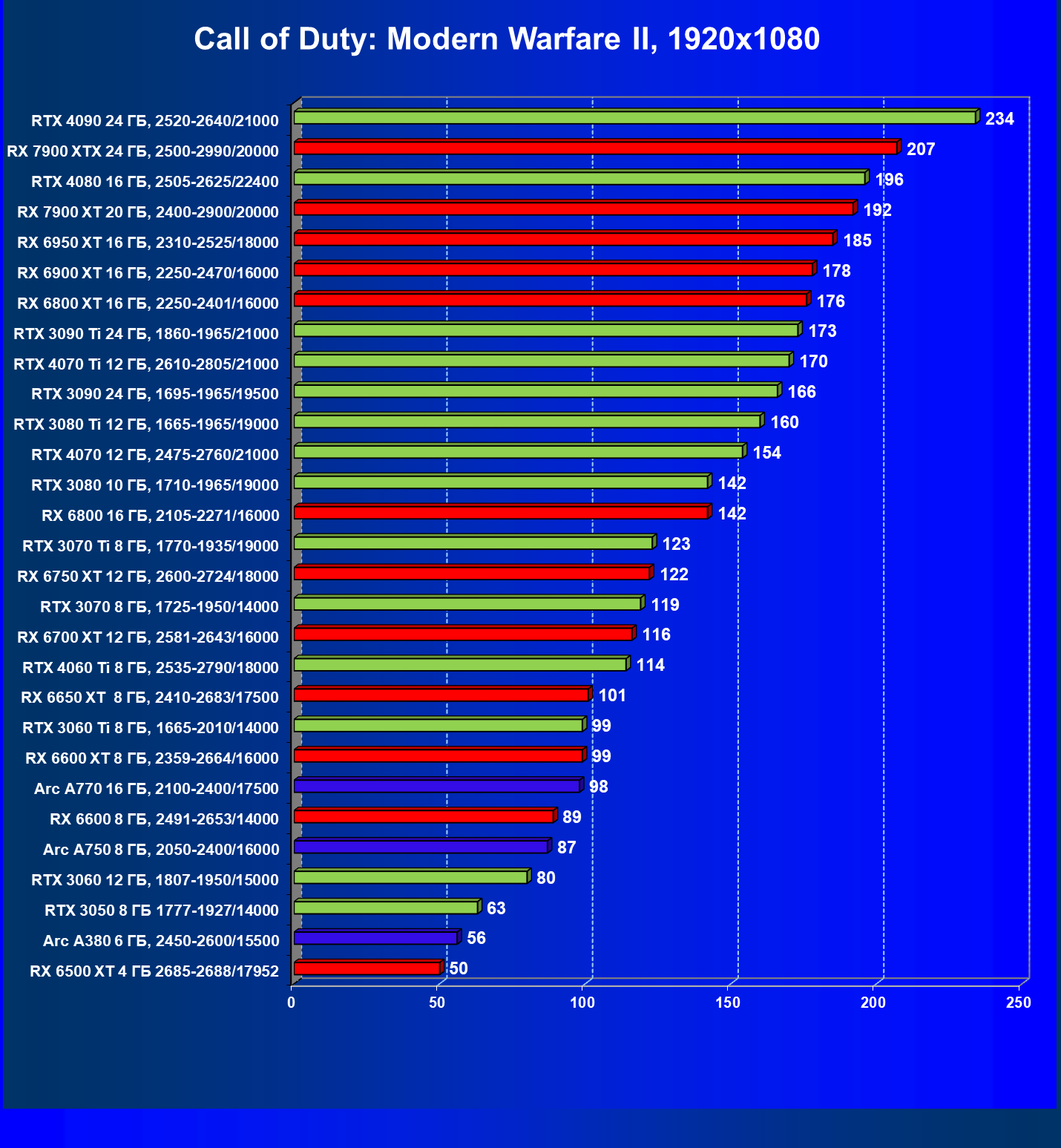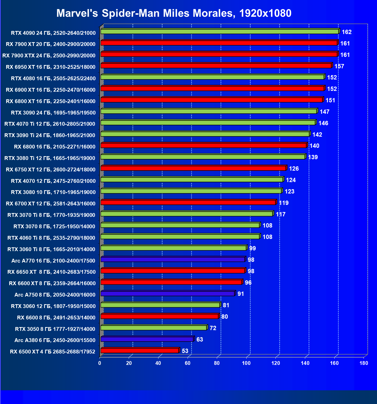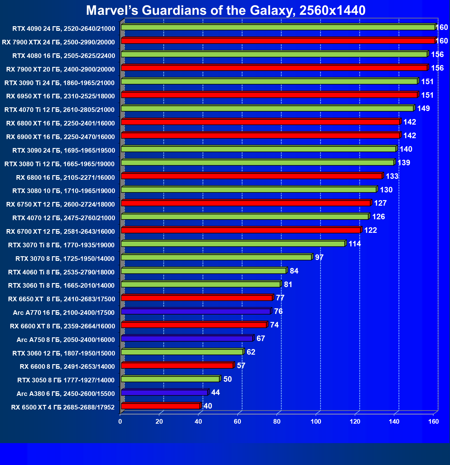 | 19 | Arc A770 16 ГБ, 2100—2400/17500 | 447 | 159 | 28 000 |