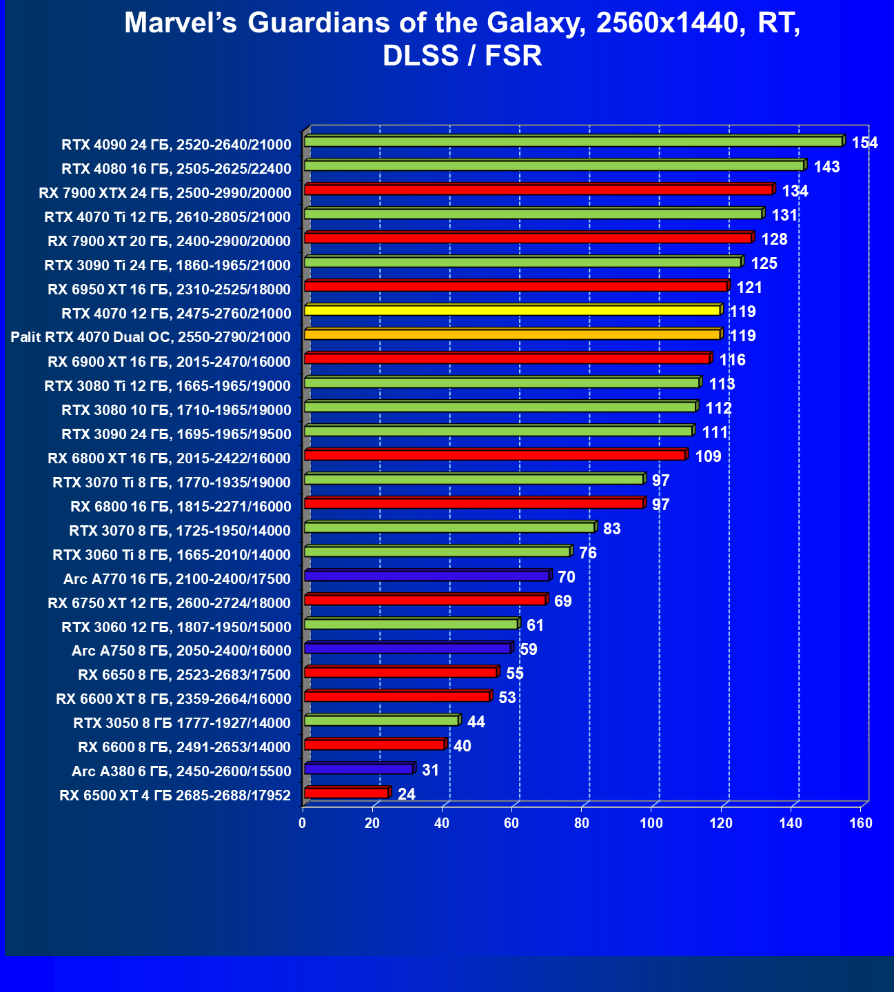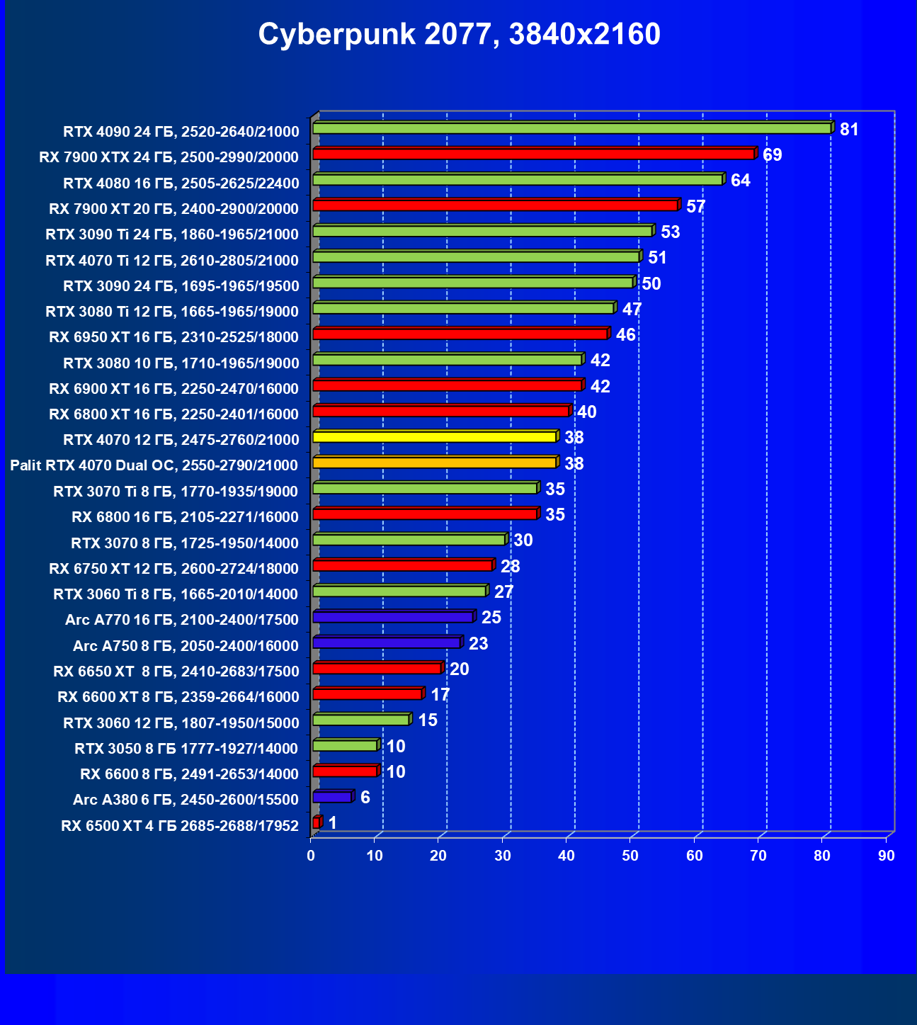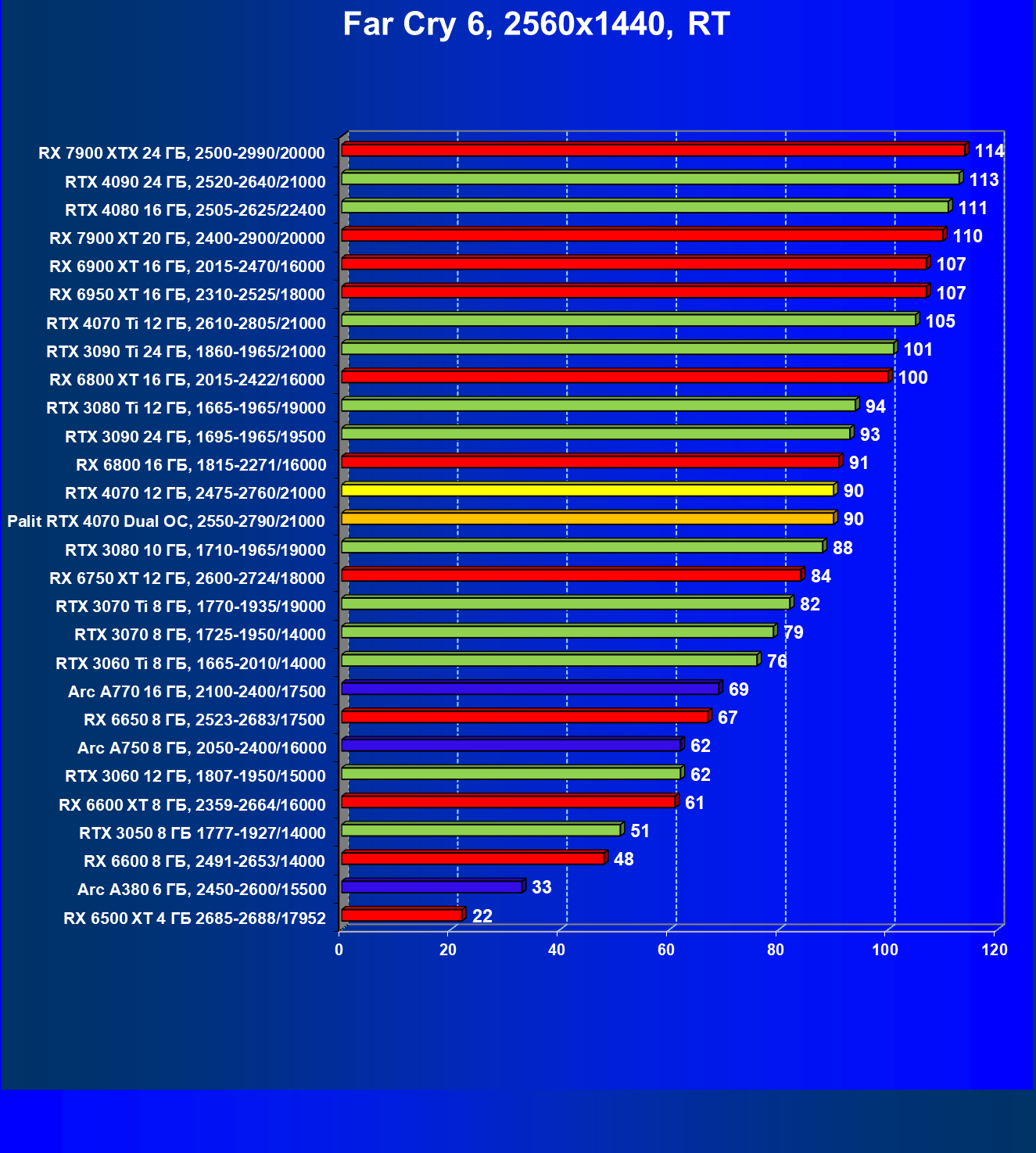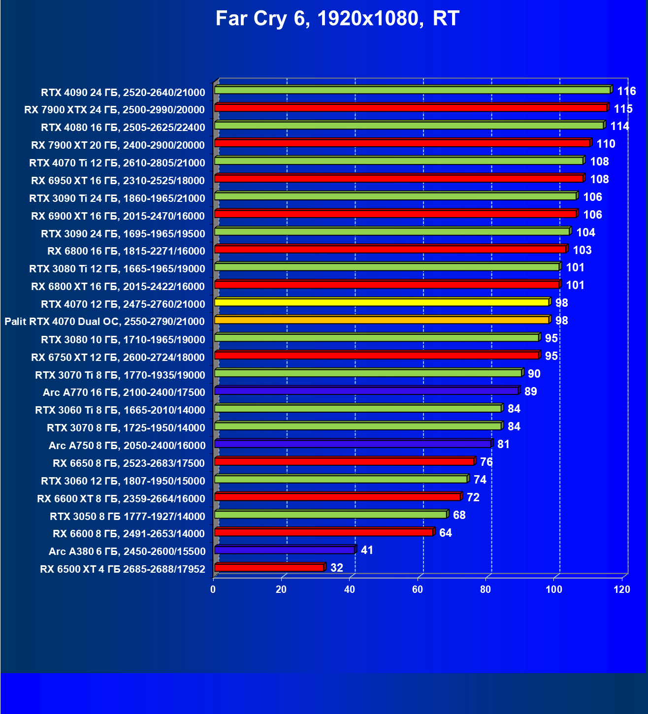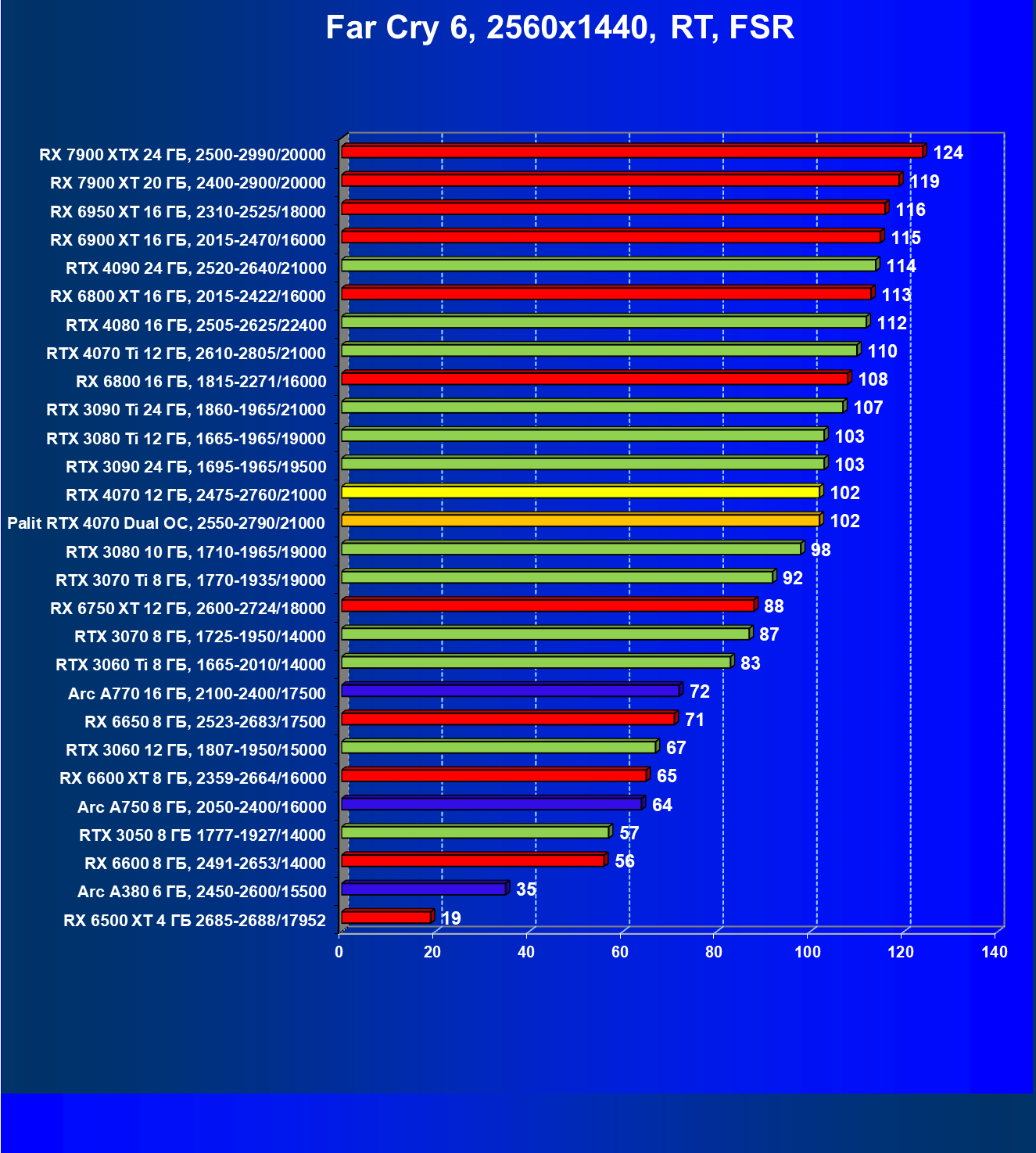 | 23 | RX 6950 XT 16 ГБ, 2310—2525/18000 | 82 | 654 | 80 000 |