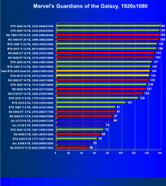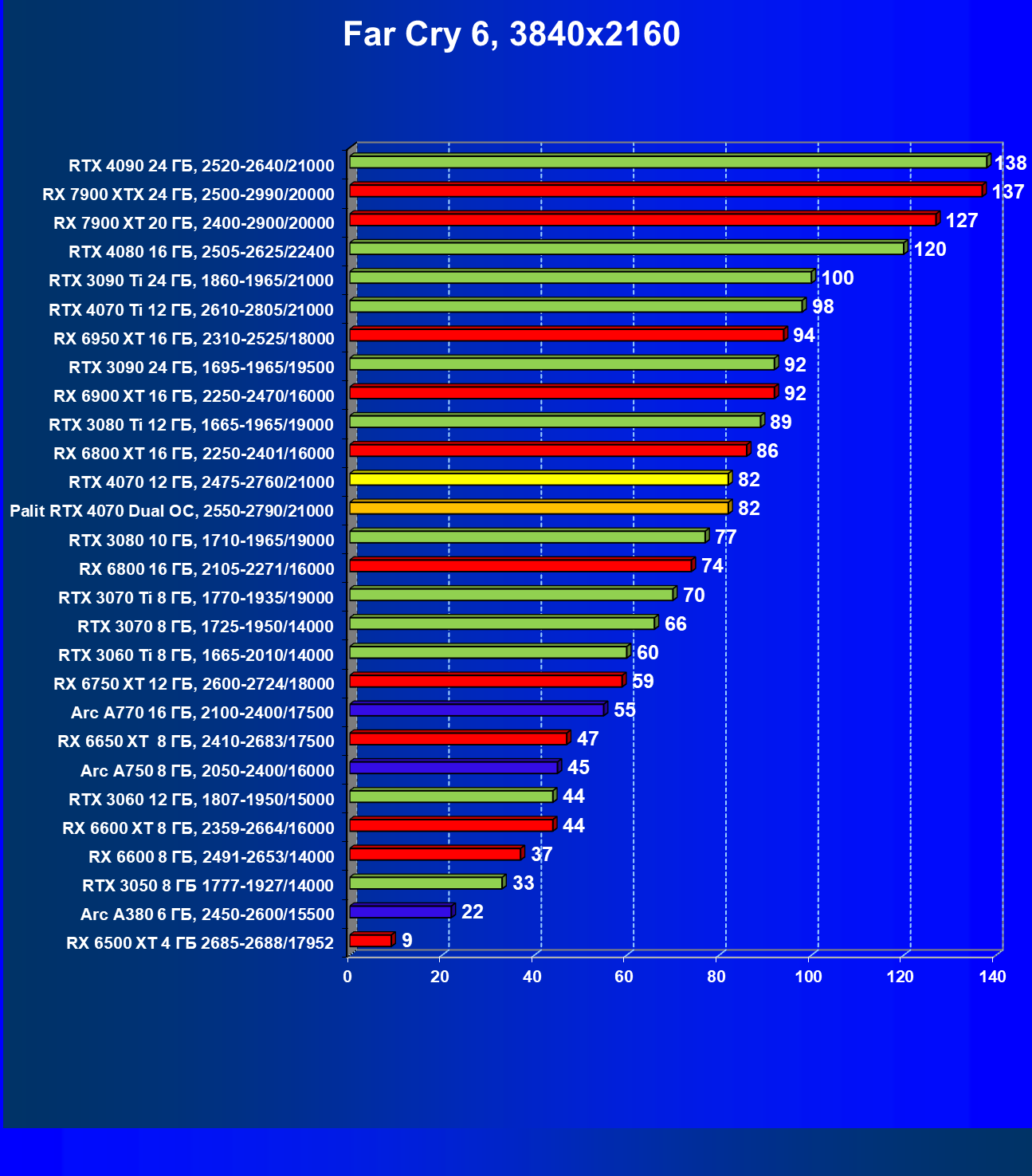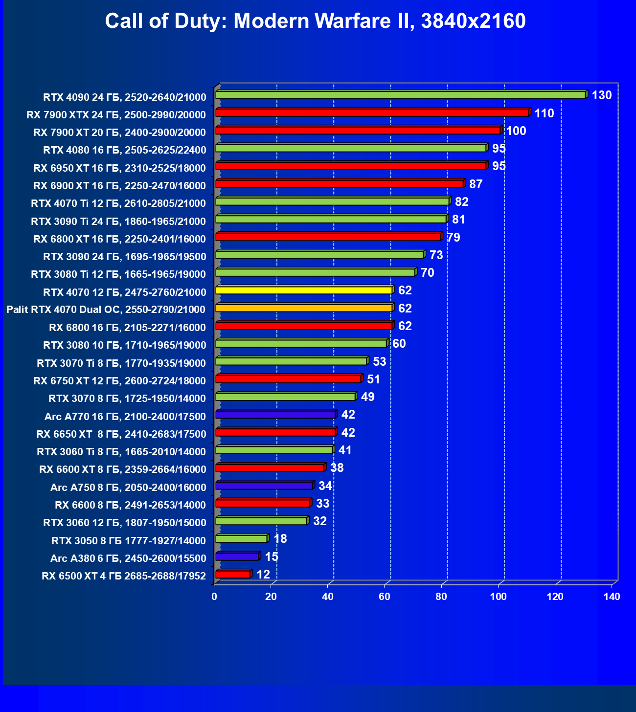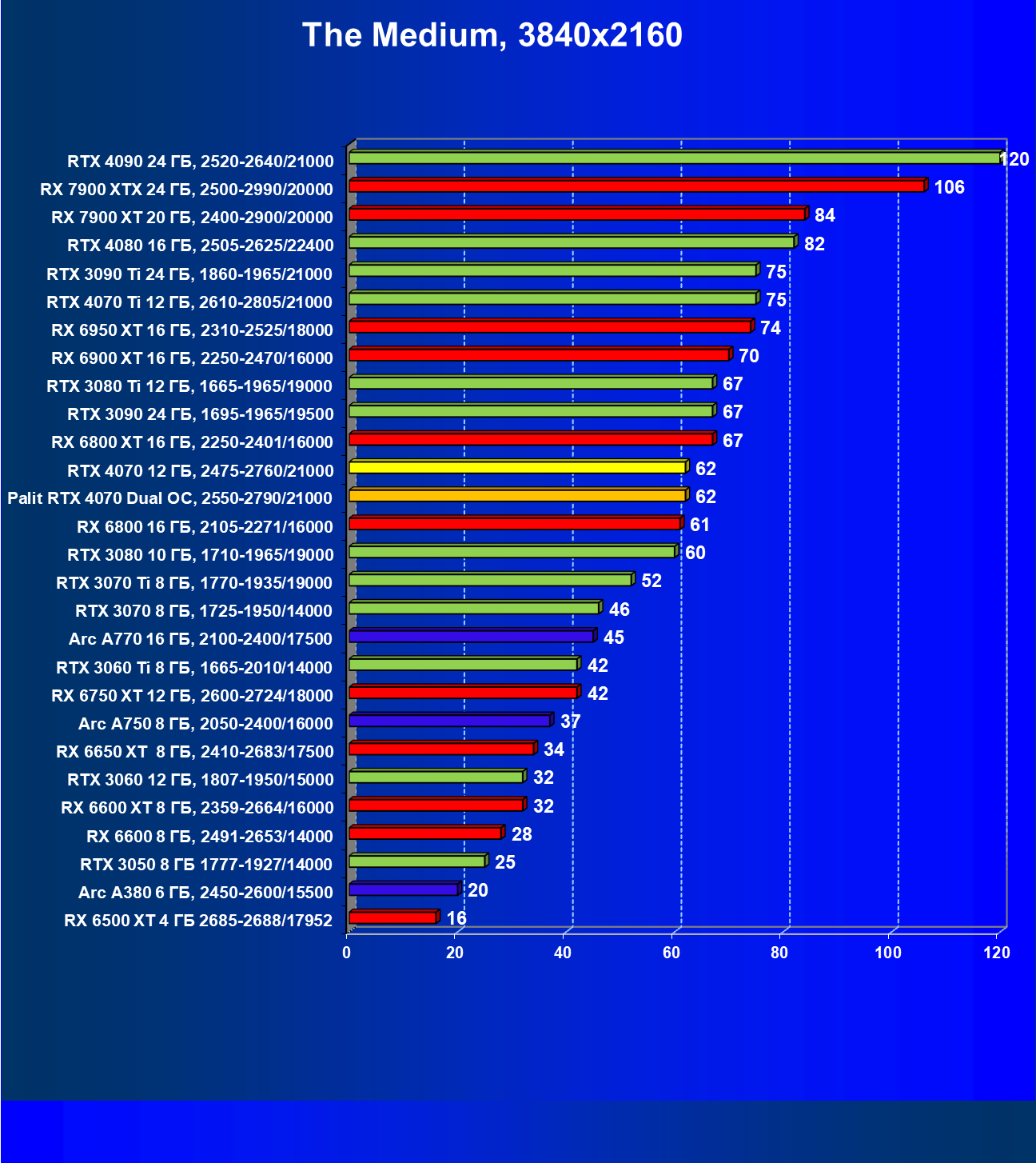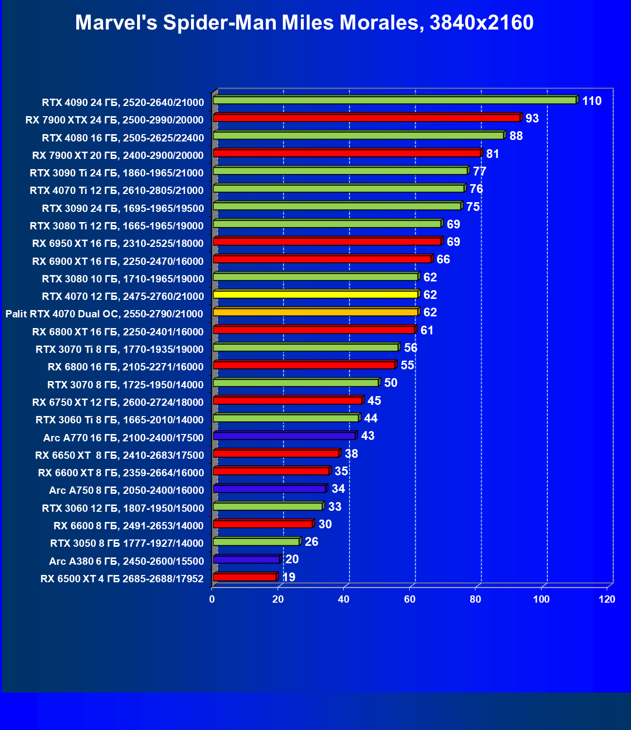 | 23 | RX 6950 XT 16 ГБ, 2310—2525/18000 | 82 | 654 | 80 000 |