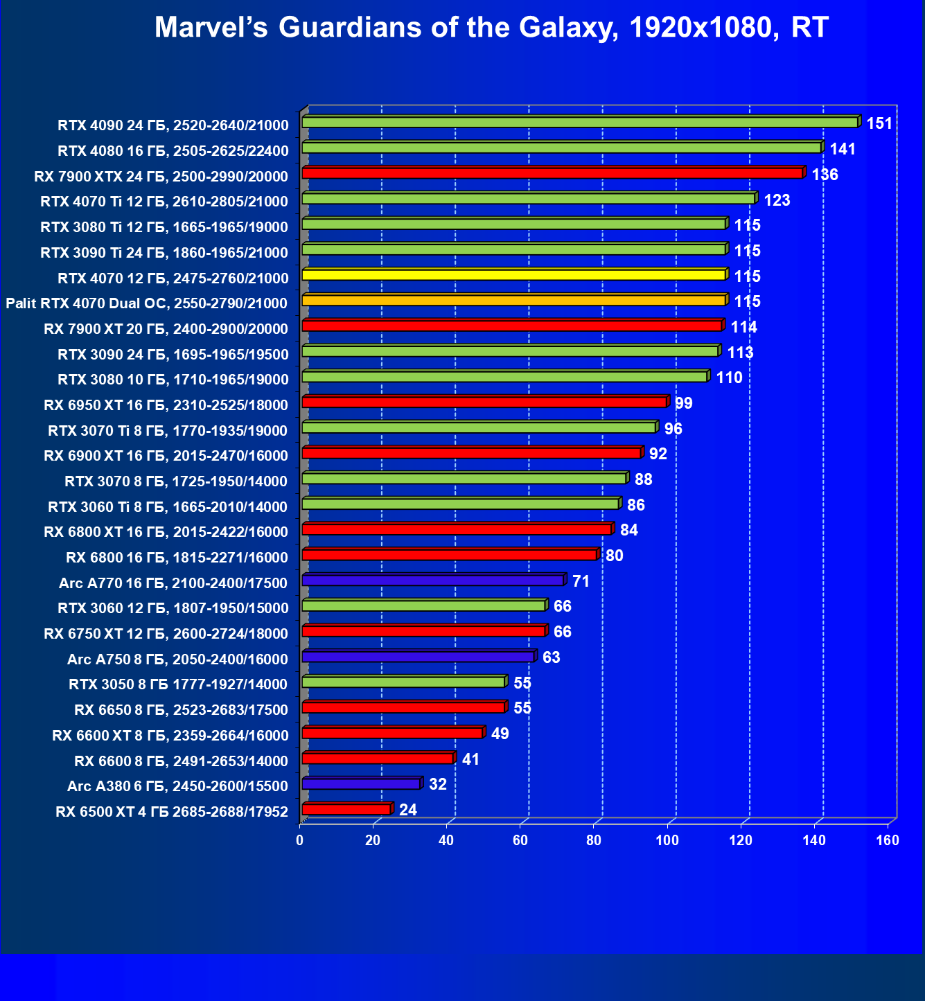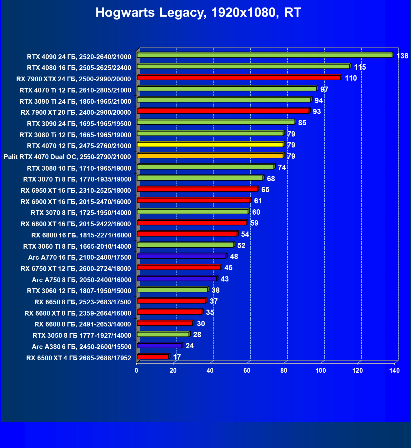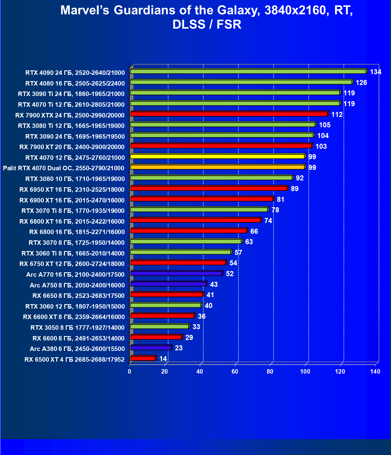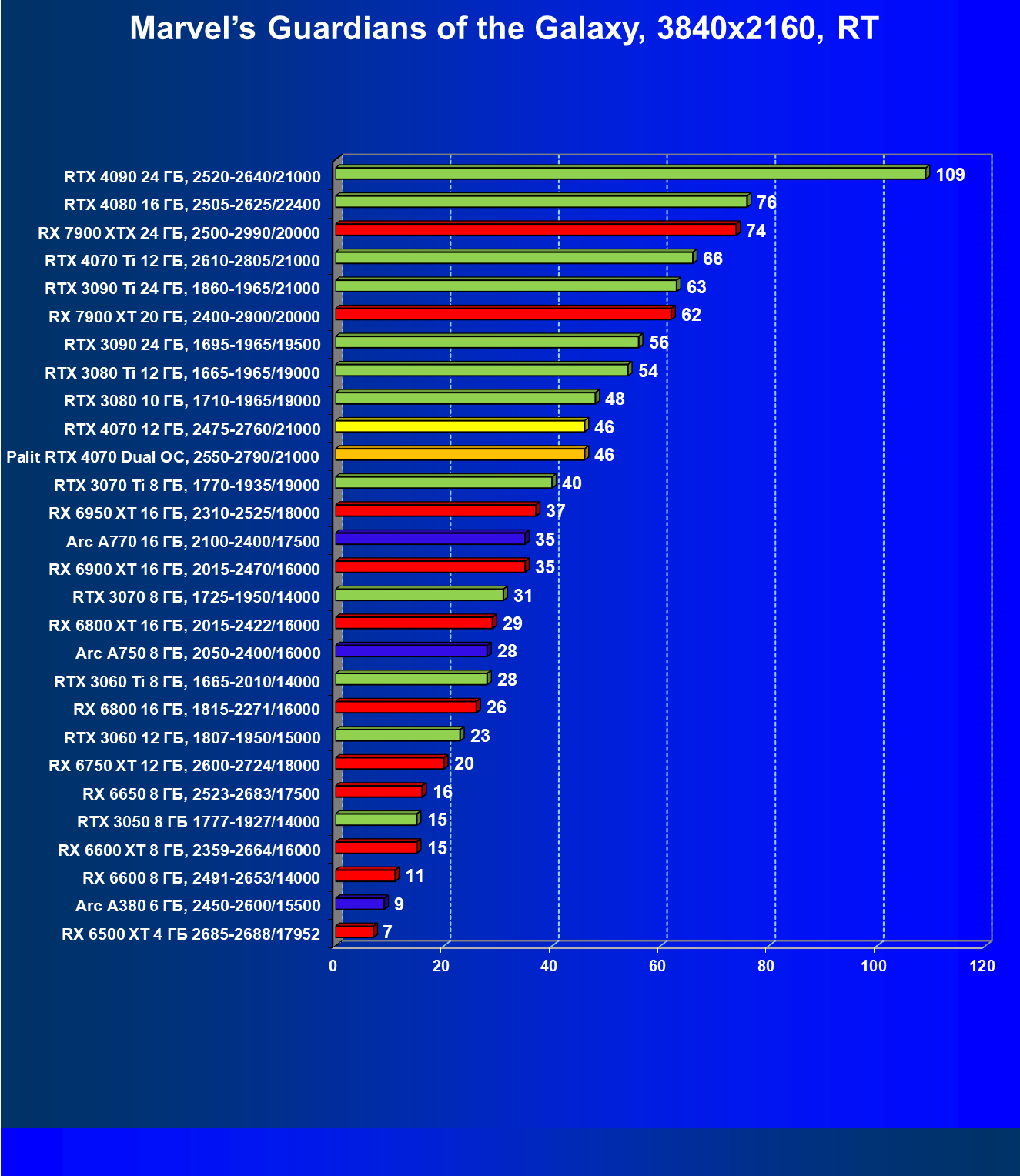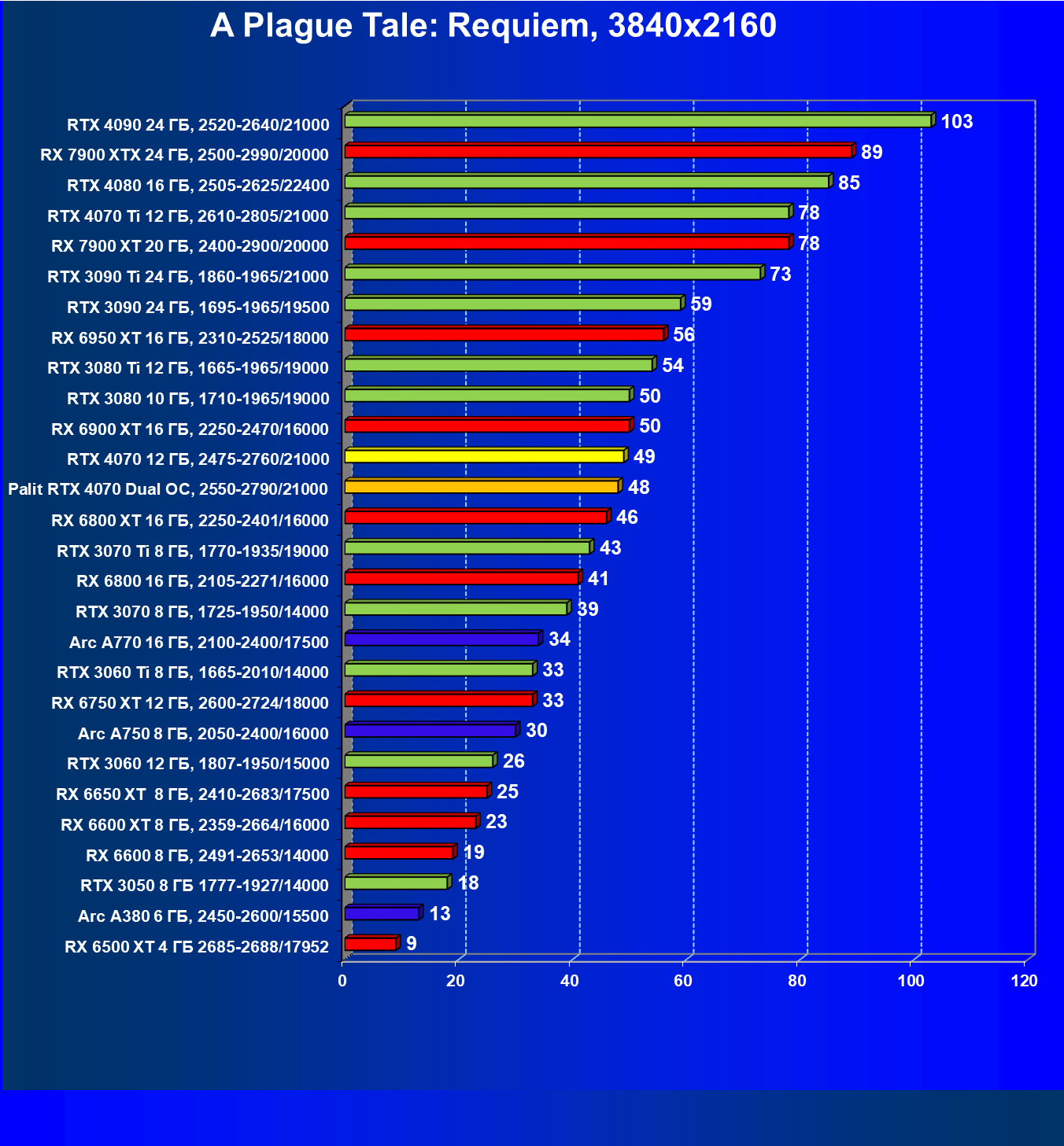 | 23 | RX 6950 XT 16 ГБ, 2310—2525/18000 | 82 | 654 | 80 000 |
