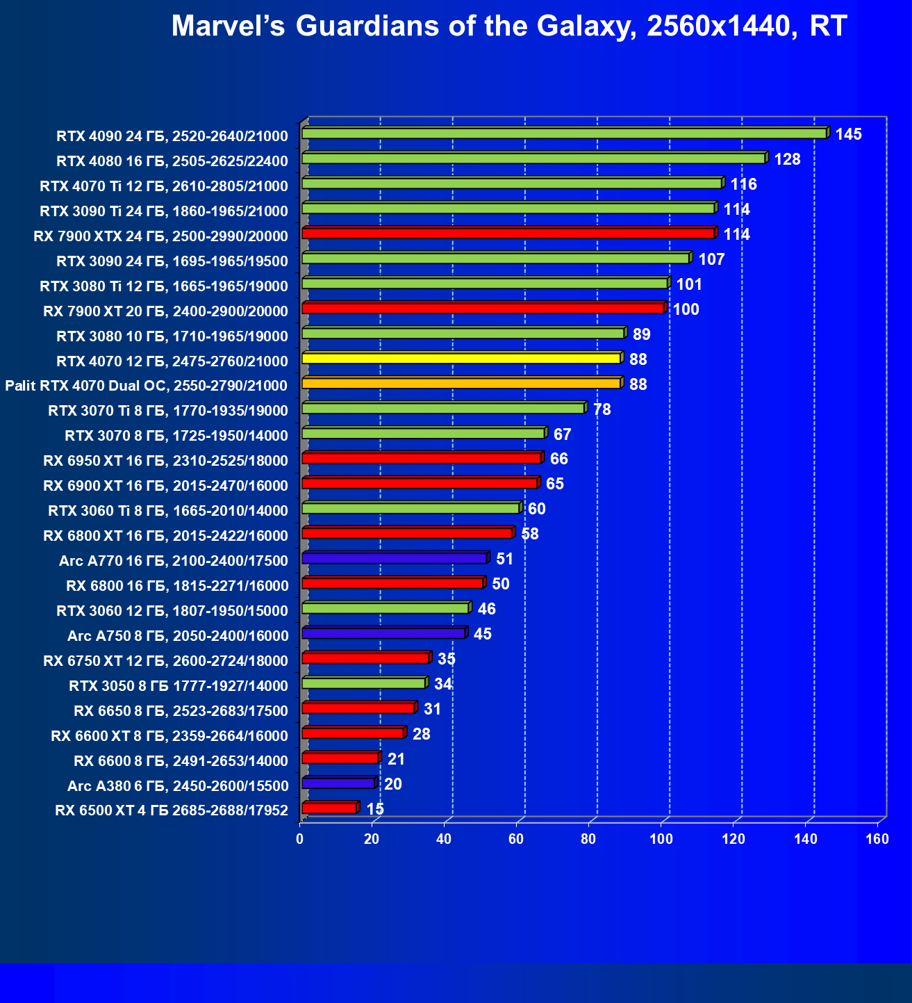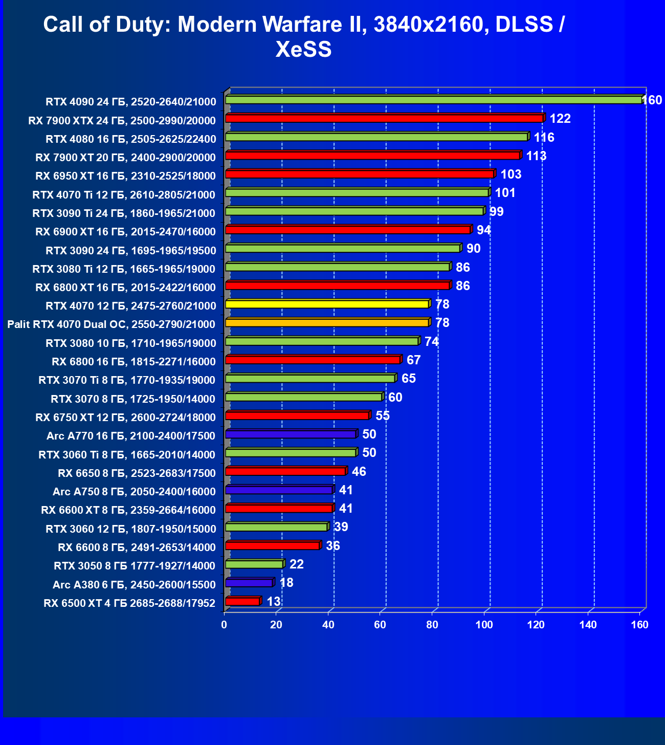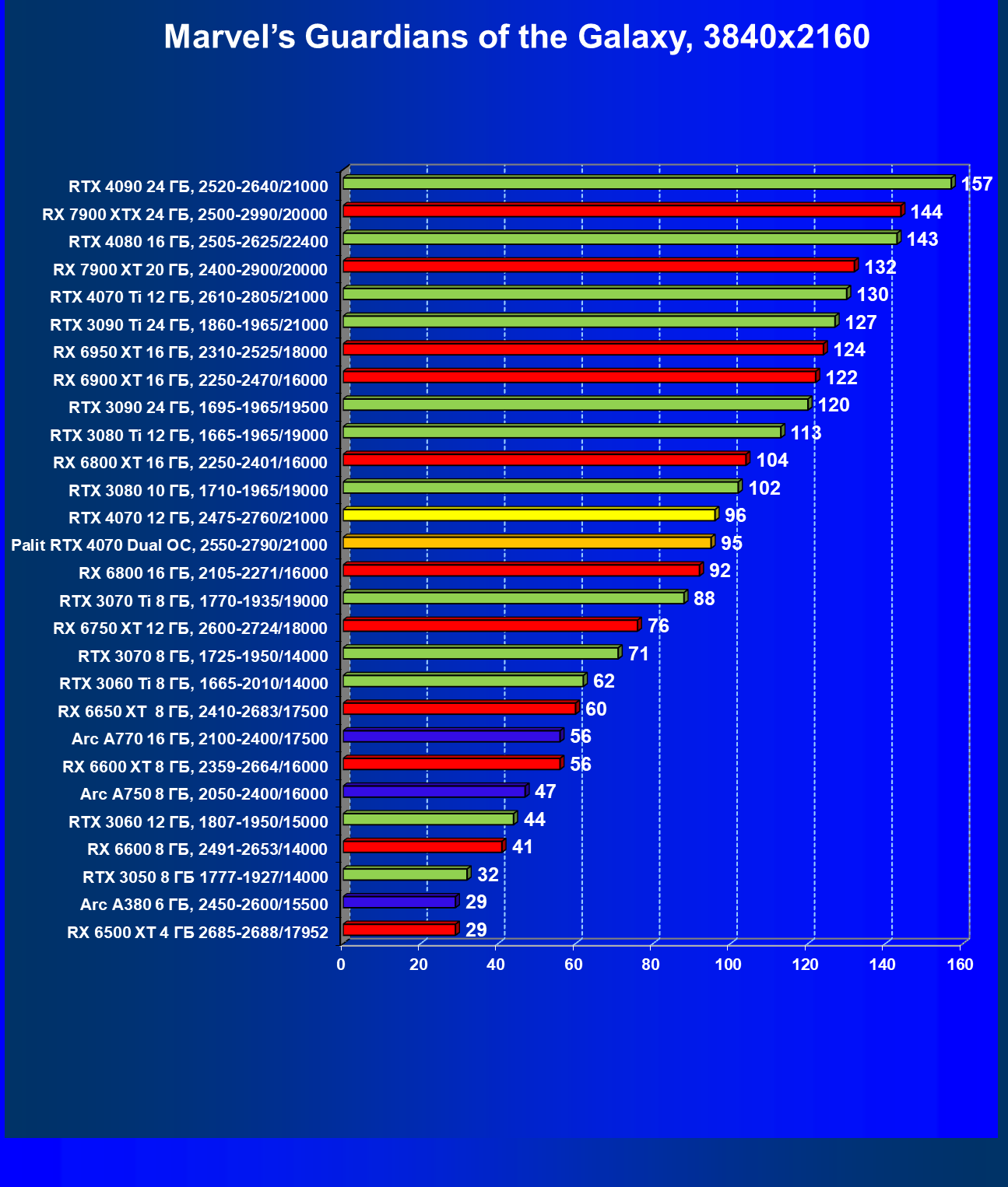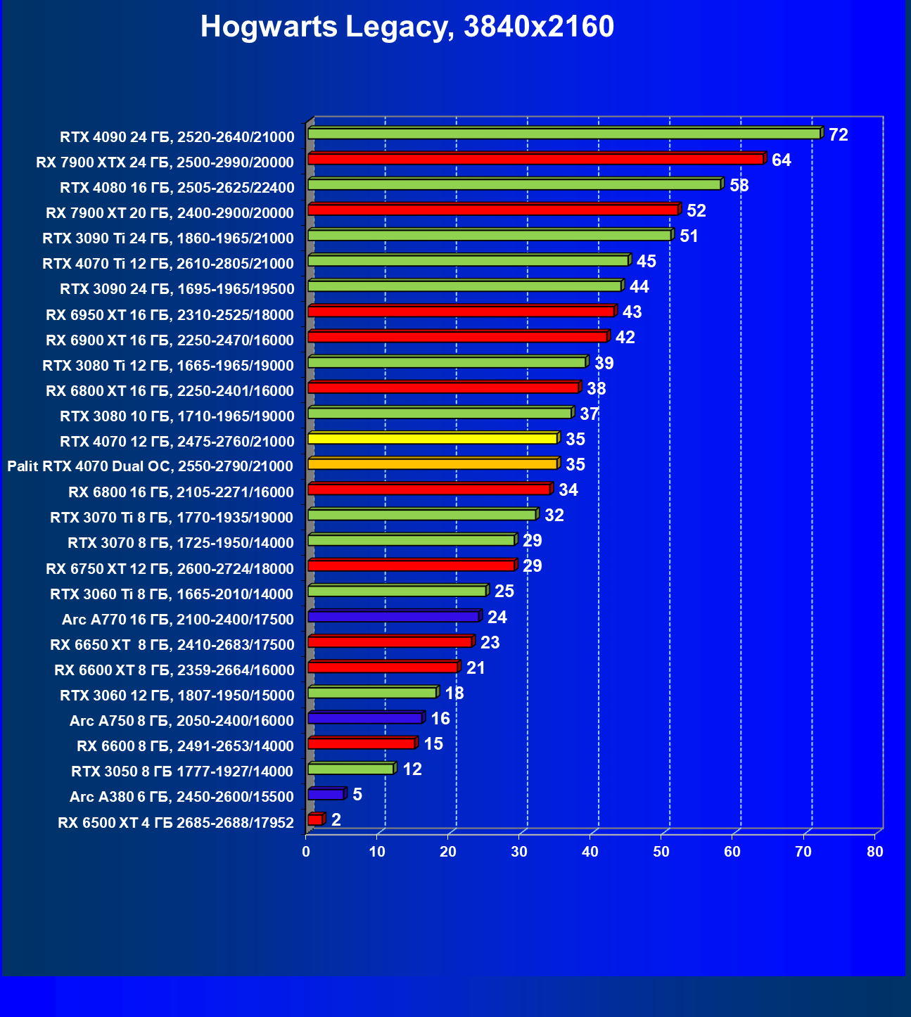 | 23 | RX 6950 XT 16 ГБ, 2310—2525/18000 | 82 | 654 | 80 000 |