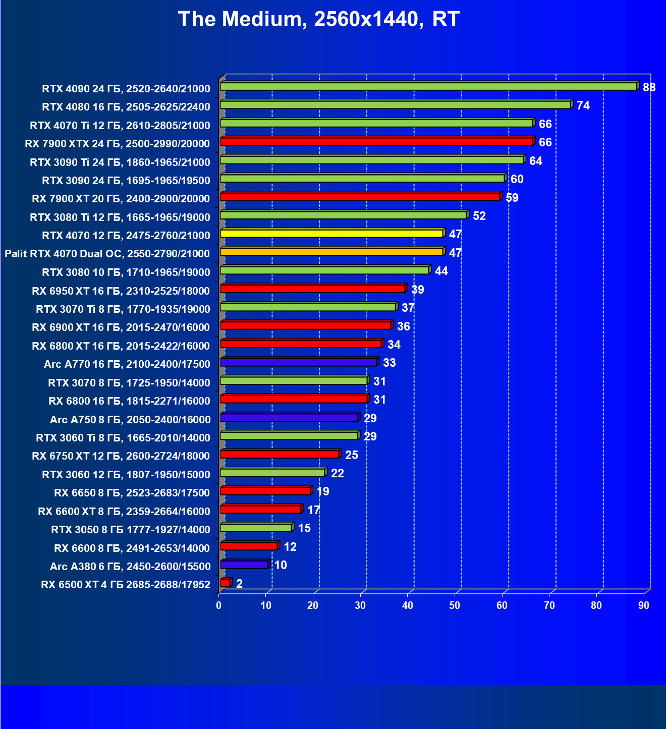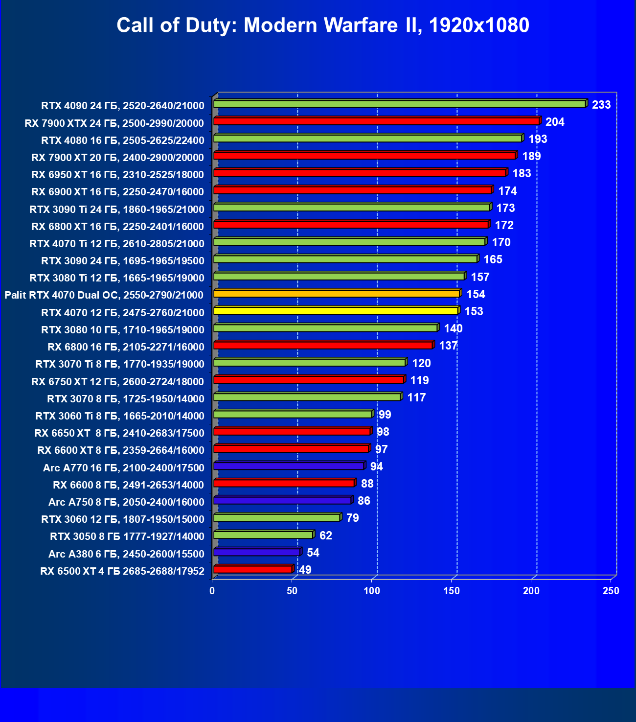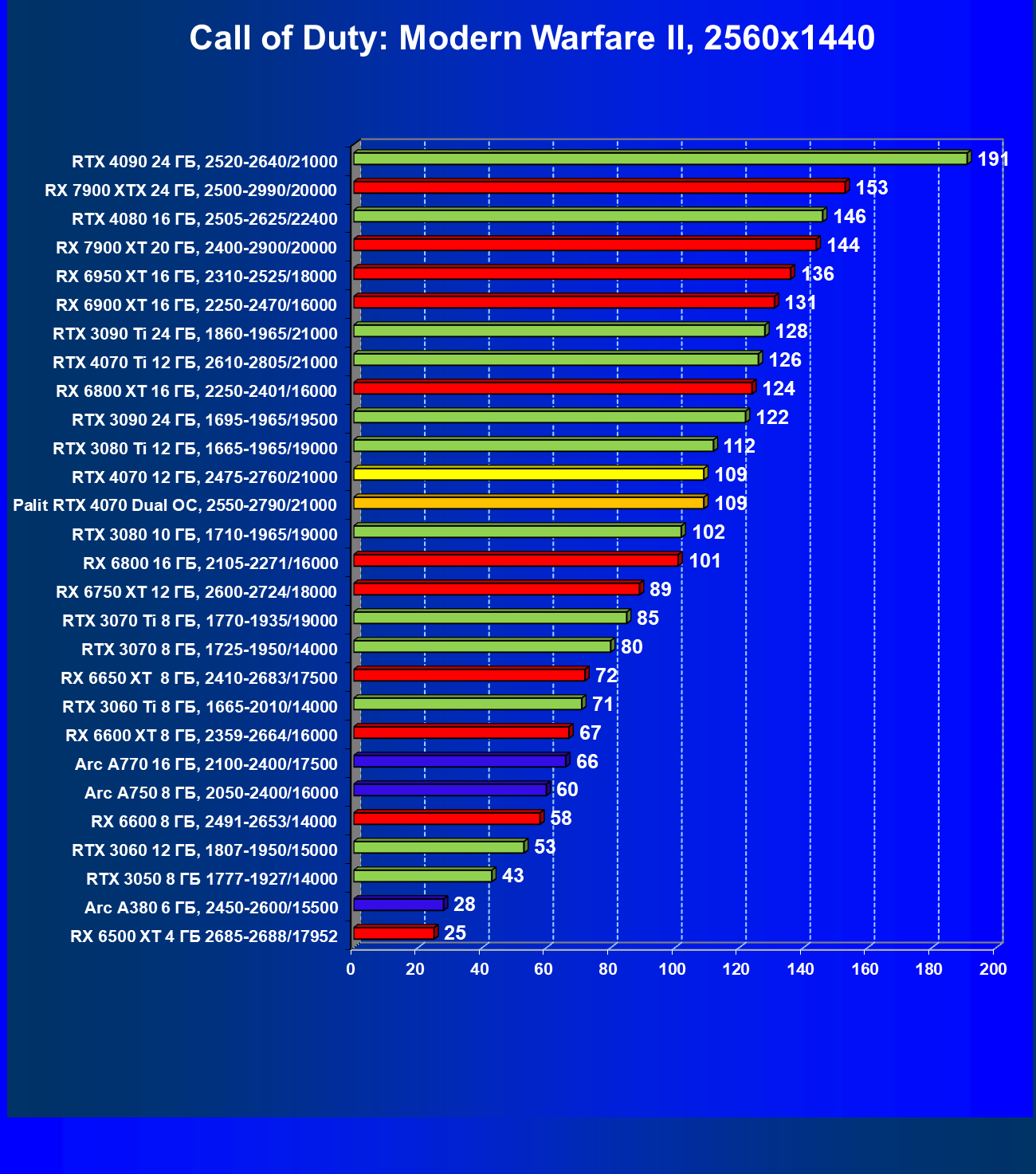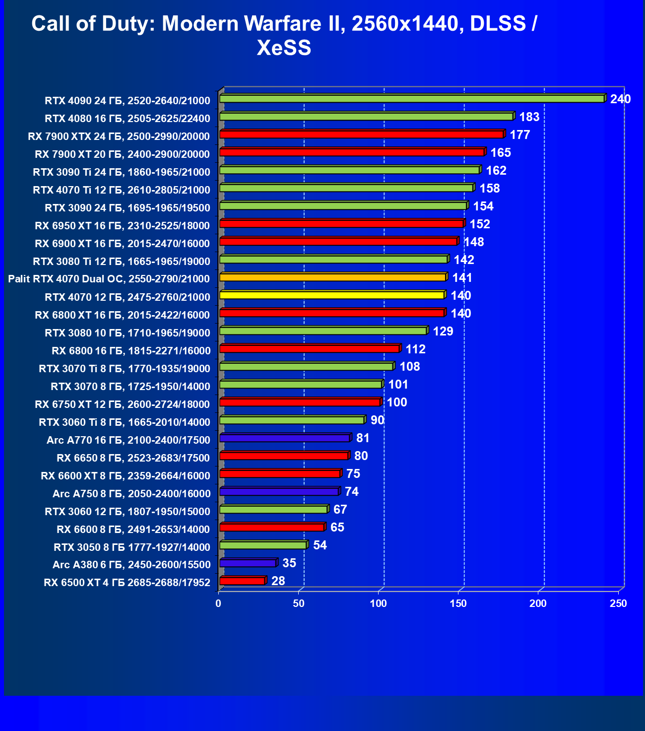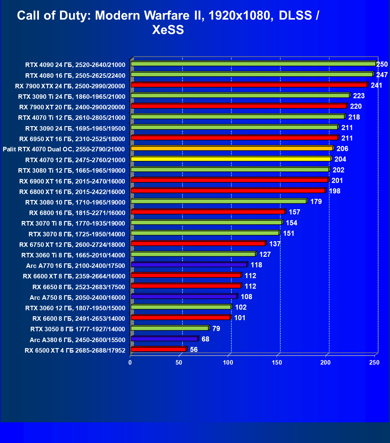 | 23 | RX 6950 XT 16 ГБ, 2310—2525/18000 | 82 | 654 | 80 000 |
