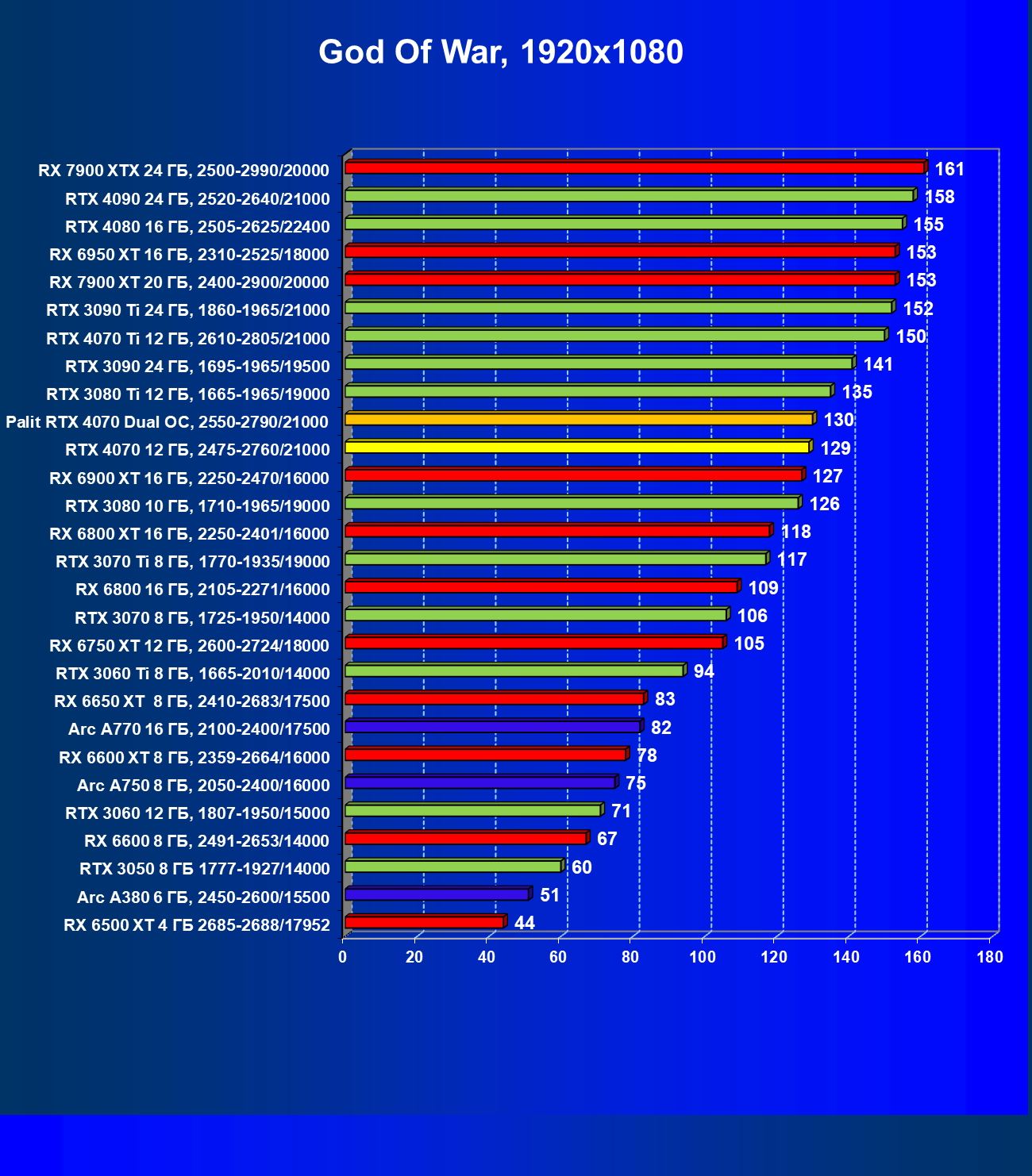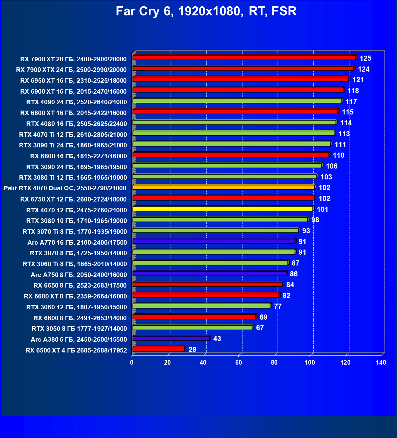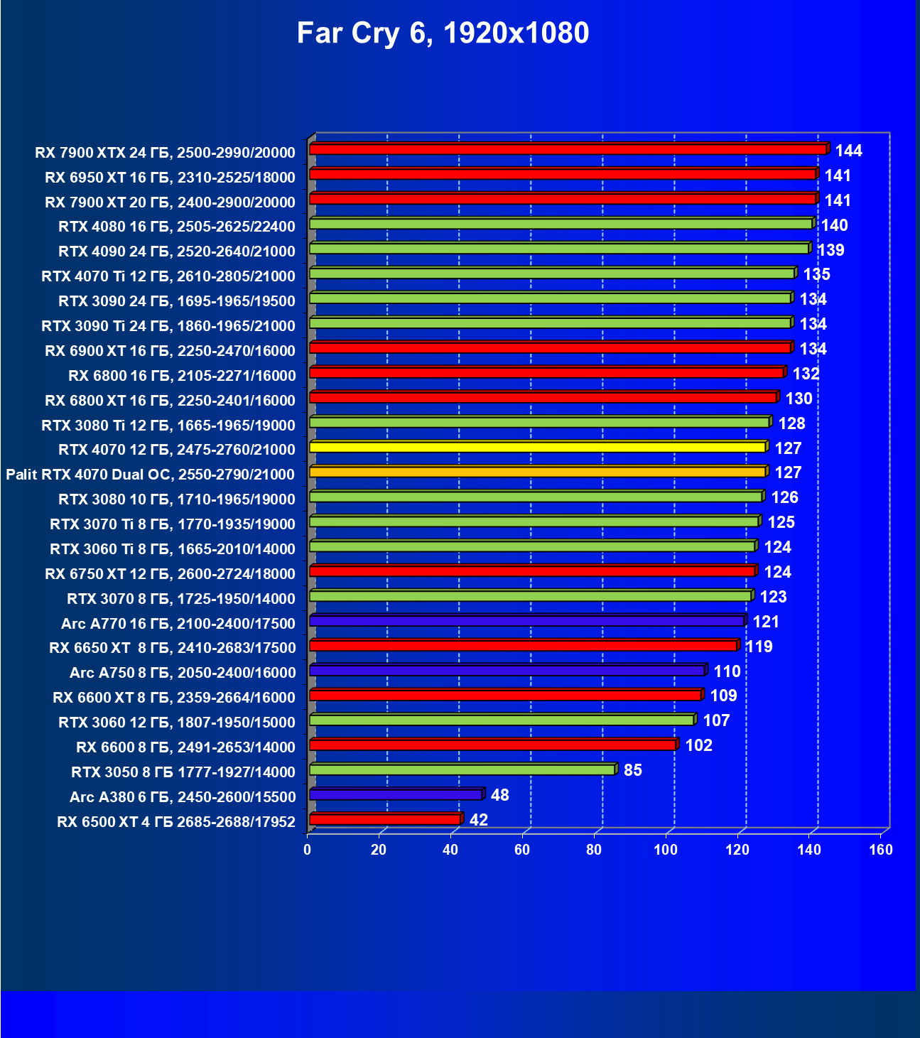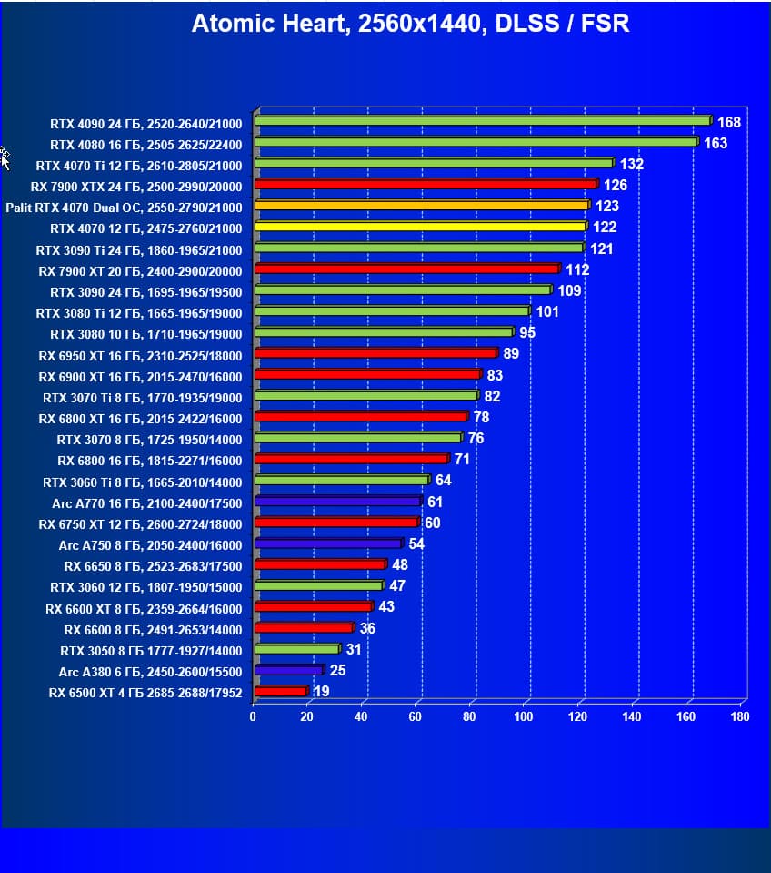 Прекрасно видно, что в целом в классических играх GeForce RTX 4070 идет наравне с GeForce RTX 3080 (10 ГБ), даже чуть быстрее. При этом карта Palit за счет чисто формального разгона чуть-чуть опережает референсный вариант GeForce RTX 4070. Также очевидно, что уже успевший подешеветь Radeon RX 6800 XT существенно обходит GeForce RTX 4070, да и почти равный по стоимости Radeon RX 6900 XT смотрится явно лучше. Но это мы говорим об играх без современных технологий трассировки лучей и «умного» масштабирования.