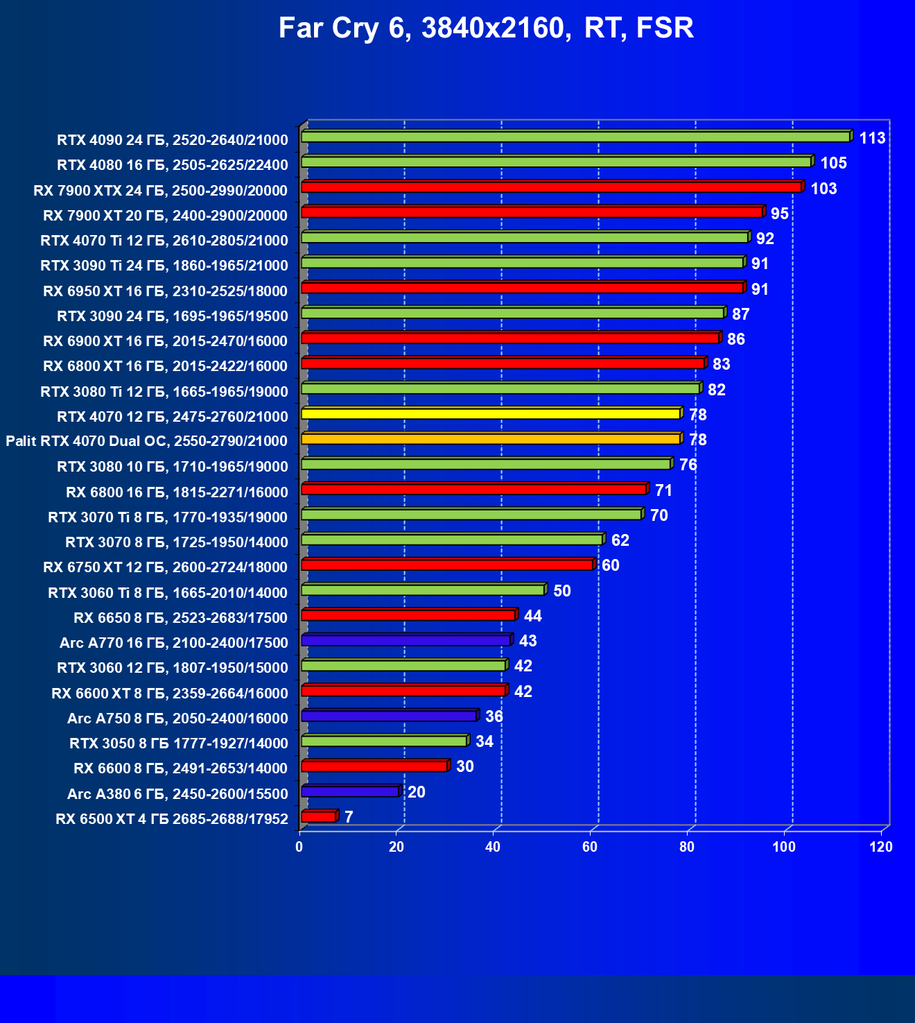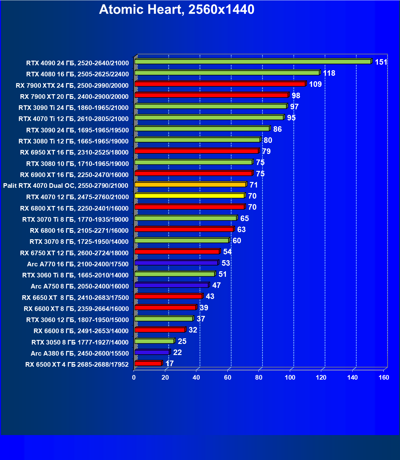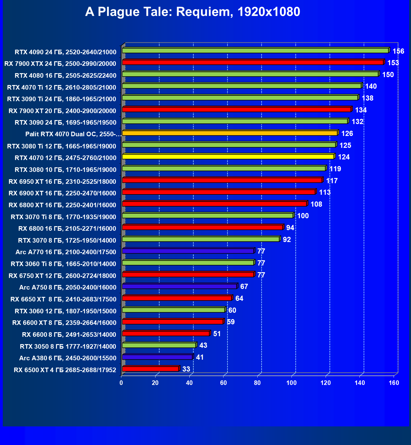 Прекрасно видно, что в целом в классических играх GeForce RTX 4070 идет наравне с GeForce RTX 3080 (10 ГБ), даже чуть быстрее. При этом карта Palit за счет чисто формального разгона чуть-чуть опережает референсный вариант GeForce RTX 4070. Также очевидно, что уже успевший подешеветь Radeon RX 6800 XT существенно обходит GeForce RTX 4070, да и почти равный по стоимости Radeon RX 6900 XT смотрится явно лучше. Но это мы говорим об играх без современных технологий трассировки лучей и «умного» масштабирования.