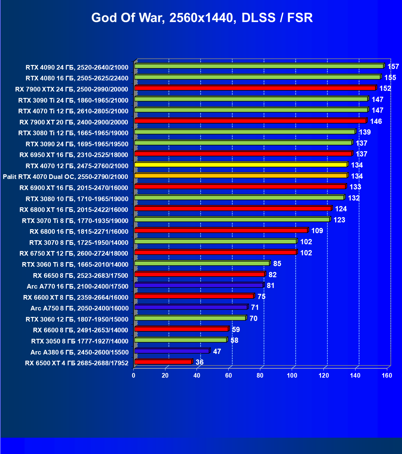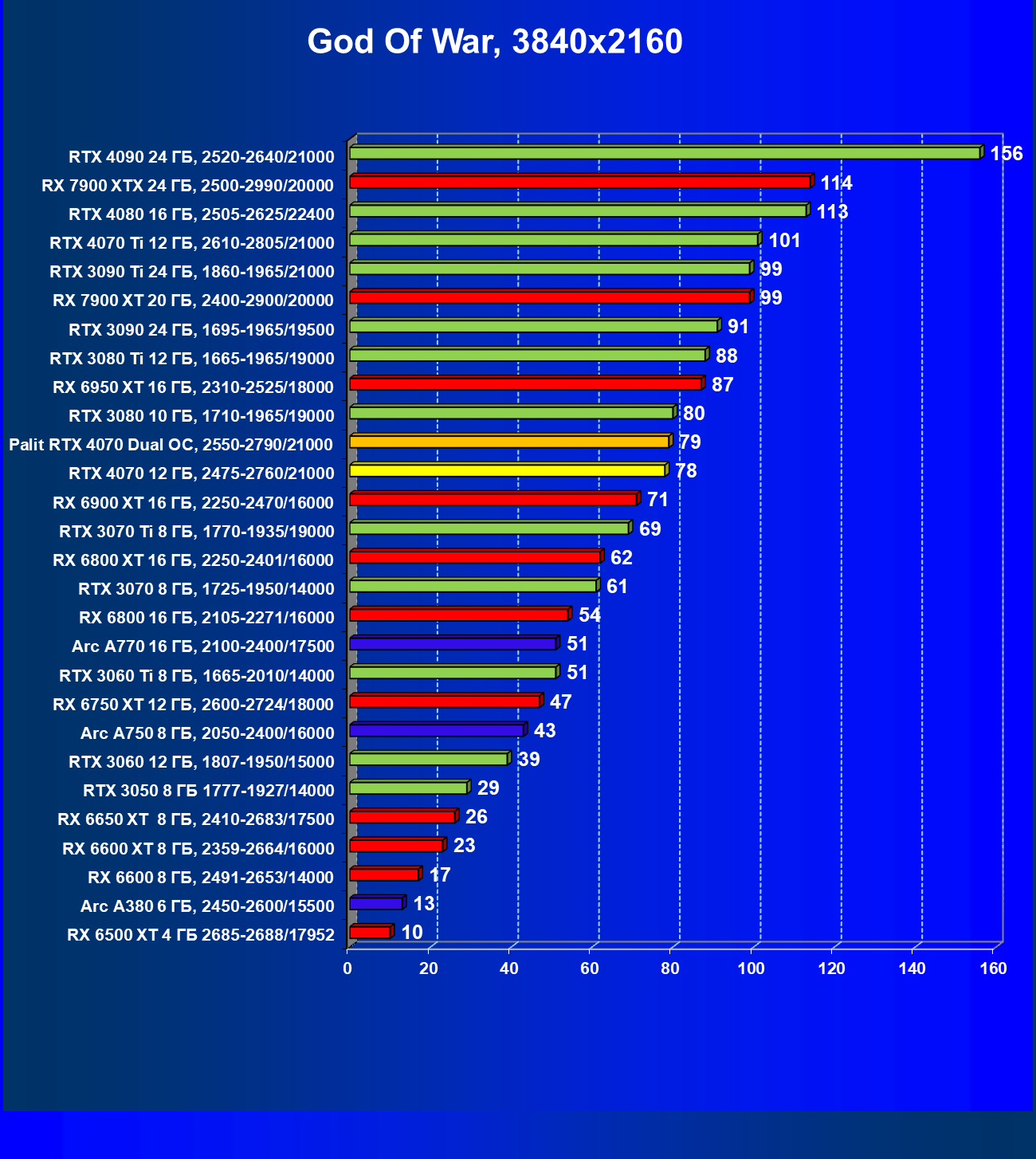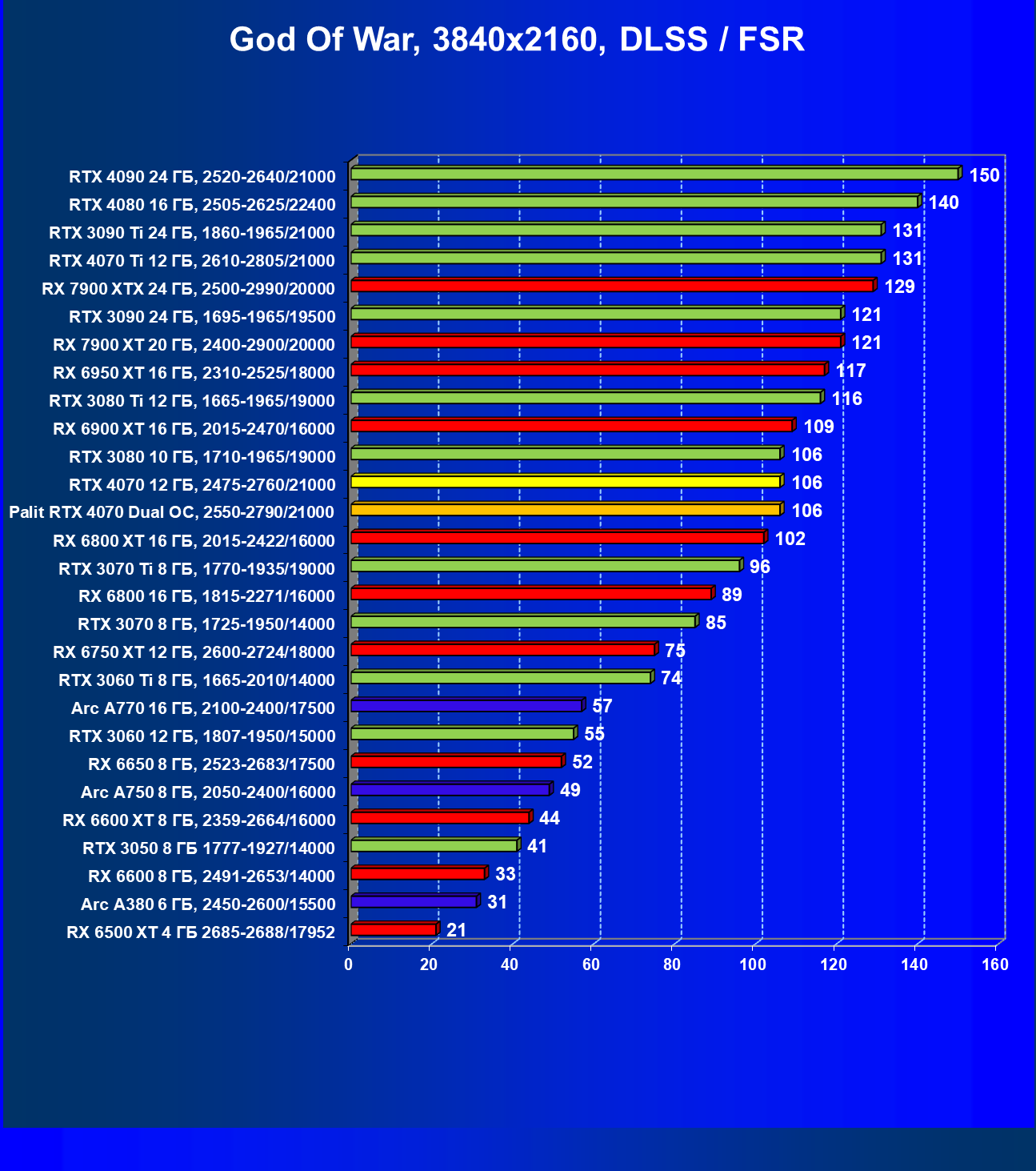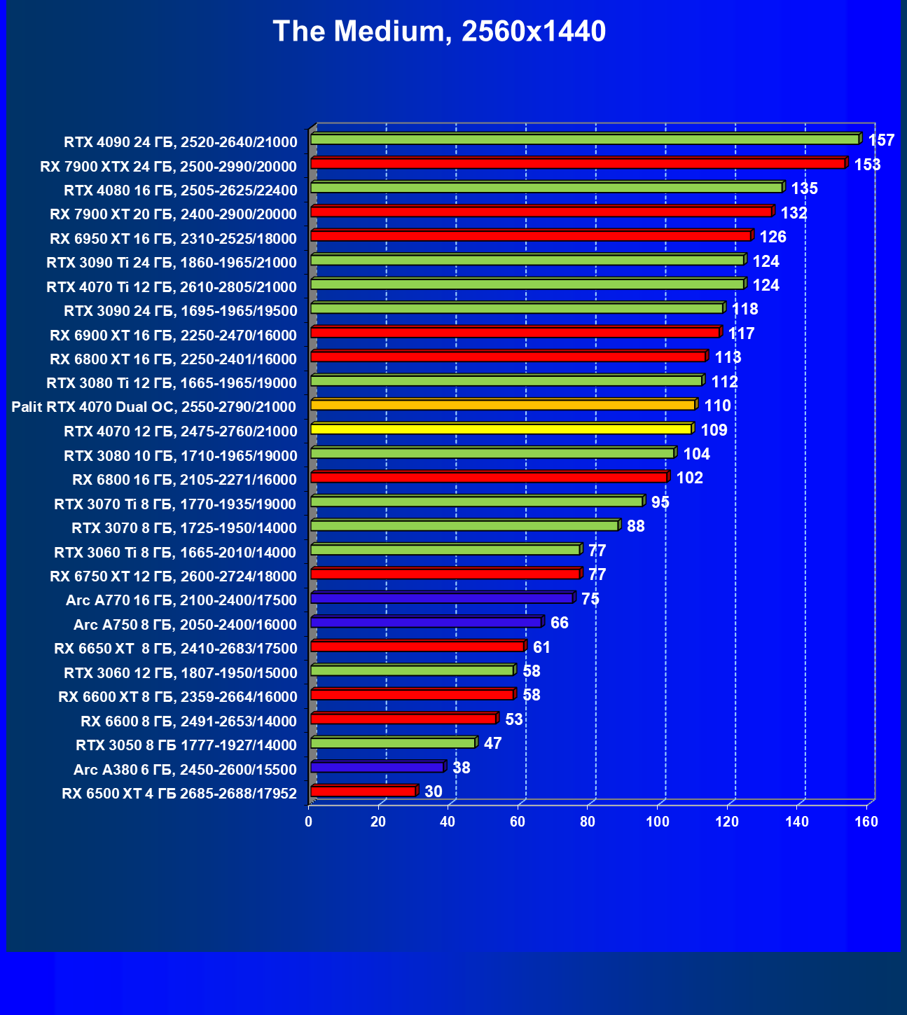 Прекрасно видно, что в целом в классических играх GeForce RTX 4070 идет наравне с GeForce RTX 3080 (10 ГБ), даже чуть быстрее. При этом карта Palit за счет чисто формального разгона чуть-чуть опережает референсный вариант GeForce RTX 4070. Также очевидно, что уже успевший подешеветь Radeon RX 6800 XT существенно обходит GeForce RTX 4070, да и почти равный по стоимости Radeon RX 6900 XT смотрится явно лучше. Но это мы говорим об играх без современных технологий трассировки лучей и «умного» масштабирования.
