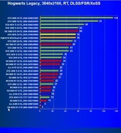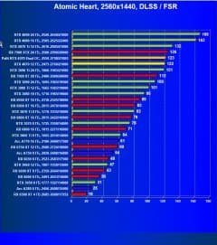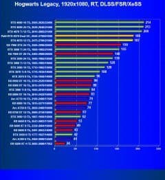 Результаты тестов со включенной аппаратной трассировкой лучей и/или DLSS/FSR/XeSS в разрешениях 1920×1080, 2560×1440 и 3840×2160