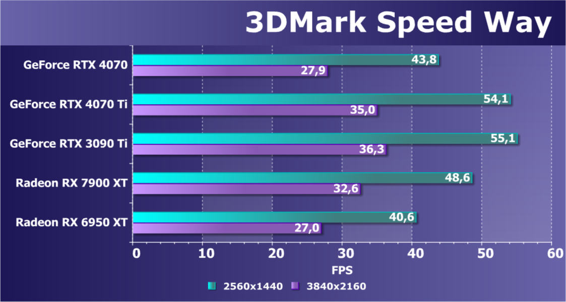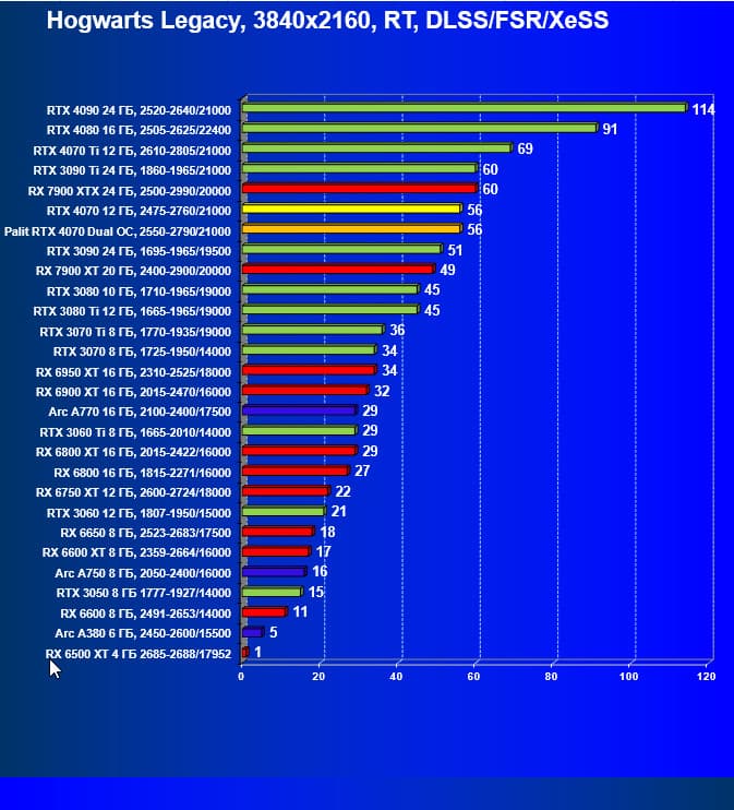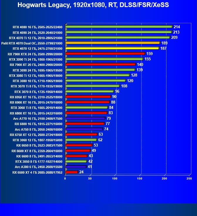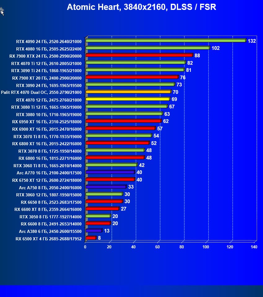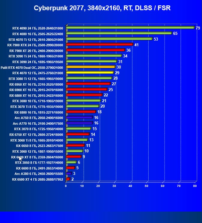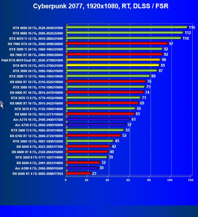 Как и следовало ожидать, у карт Radeon падение FPS более драматичное, так что они в этом рейтинге сместились вниз, а GeForce RTX 4070 является лидером в своей группе. При этом из-за поддержки DLSS 3.0 в ряде игр новинка обходит и более дорогой GeForce RTX 3080 Ti.