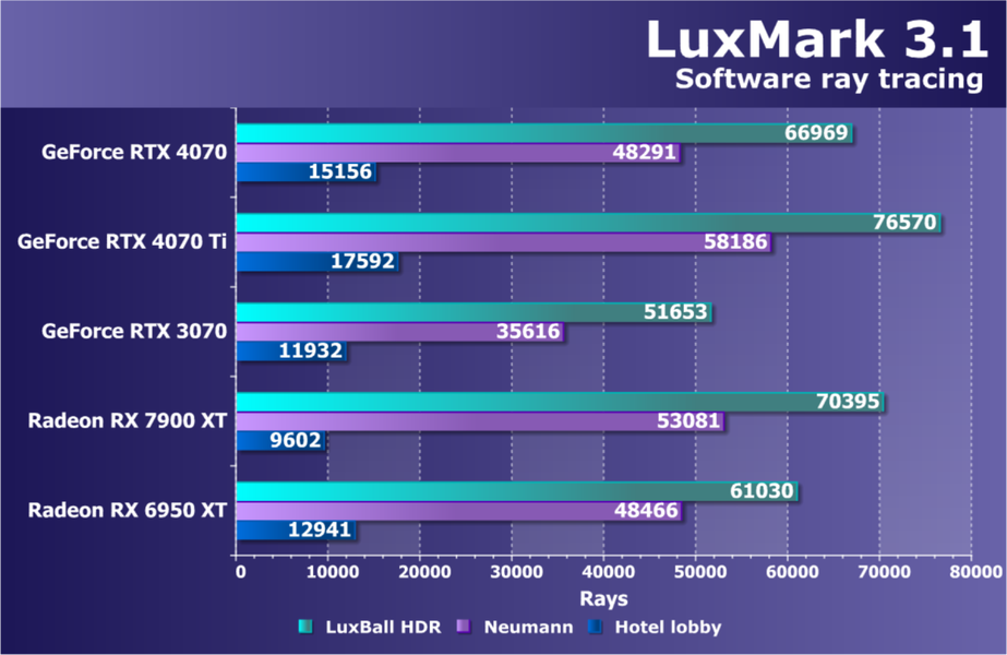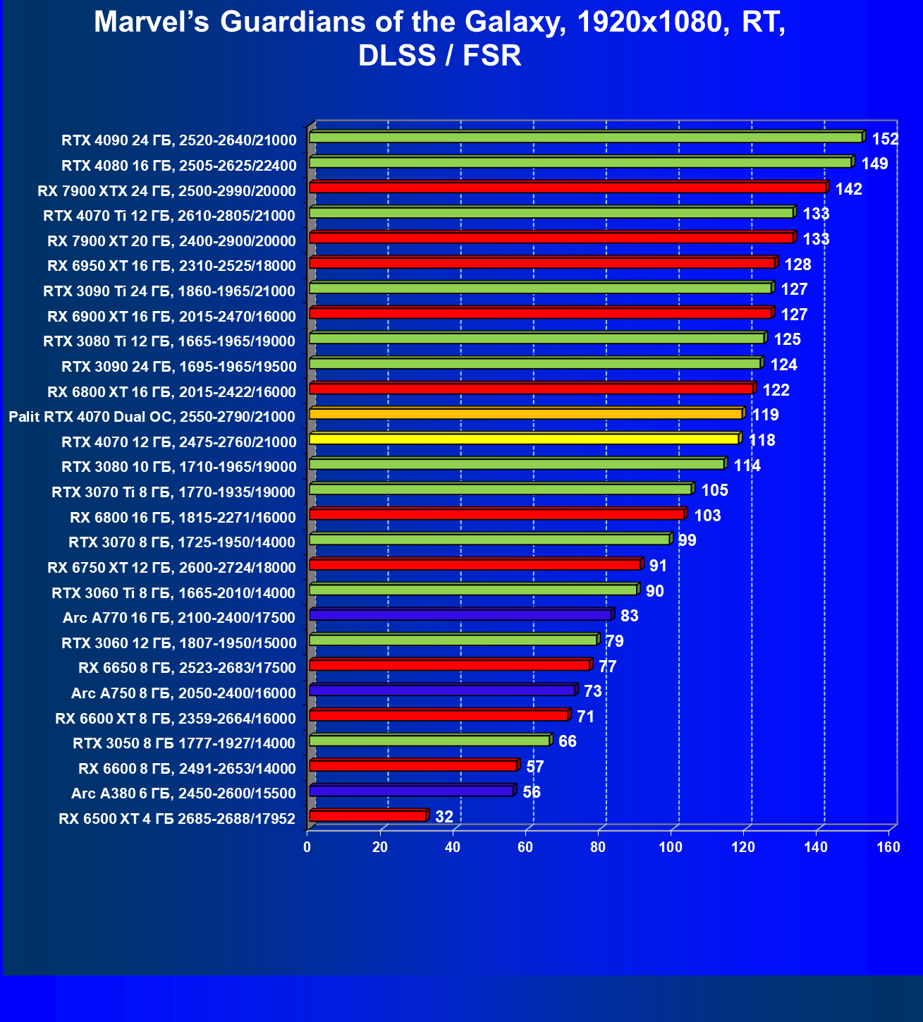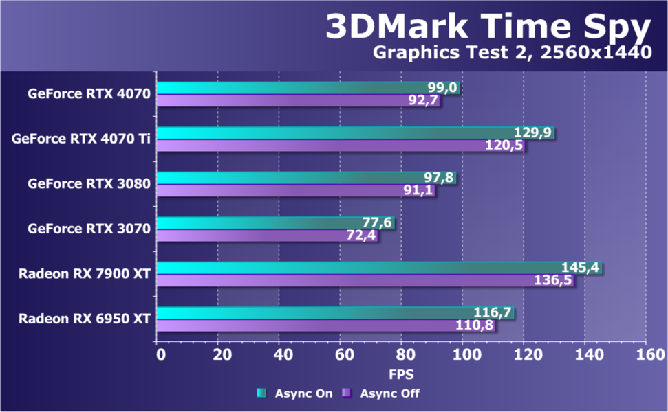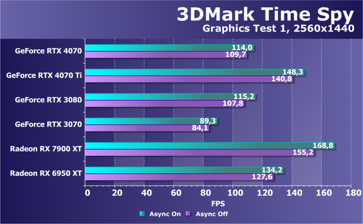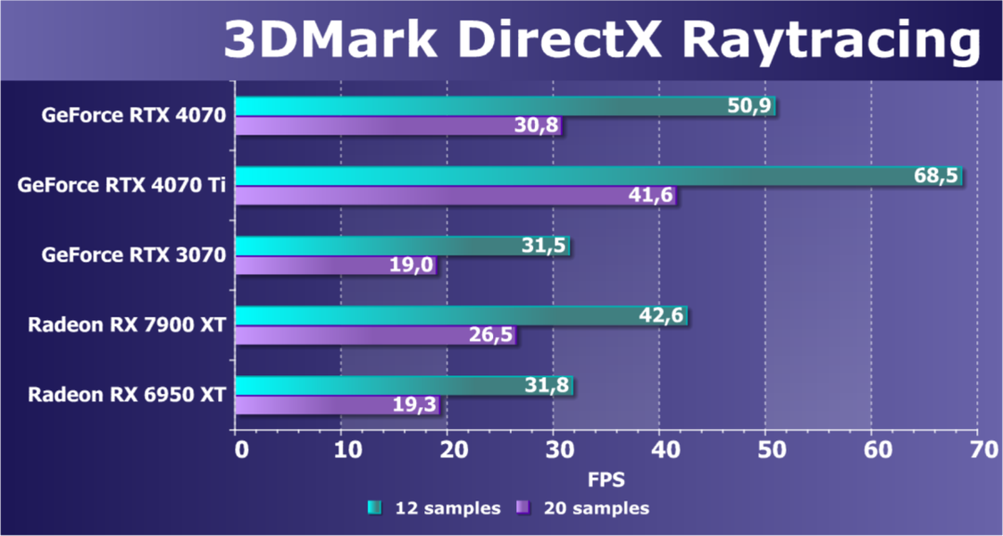Как и следовало ожидать, у карт Radeon падение FPS более драматичное, так что они в этом рейтинге сместились вниз, а GeForce RTX 4070 является лидером в своей группе. При этом из-за поддержки DLSS 3.0 в ряде игр новинка обходит и более дорогой GeForce RTX 3080 Ti.