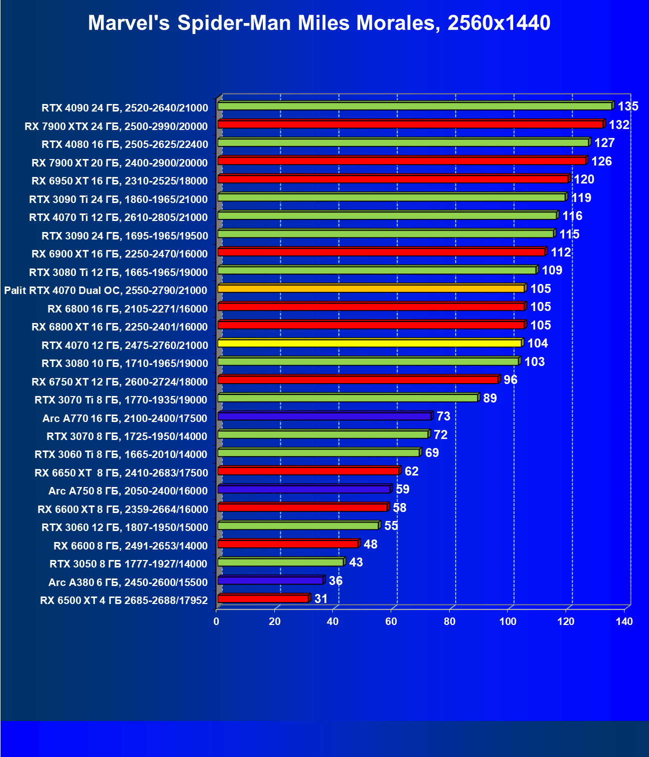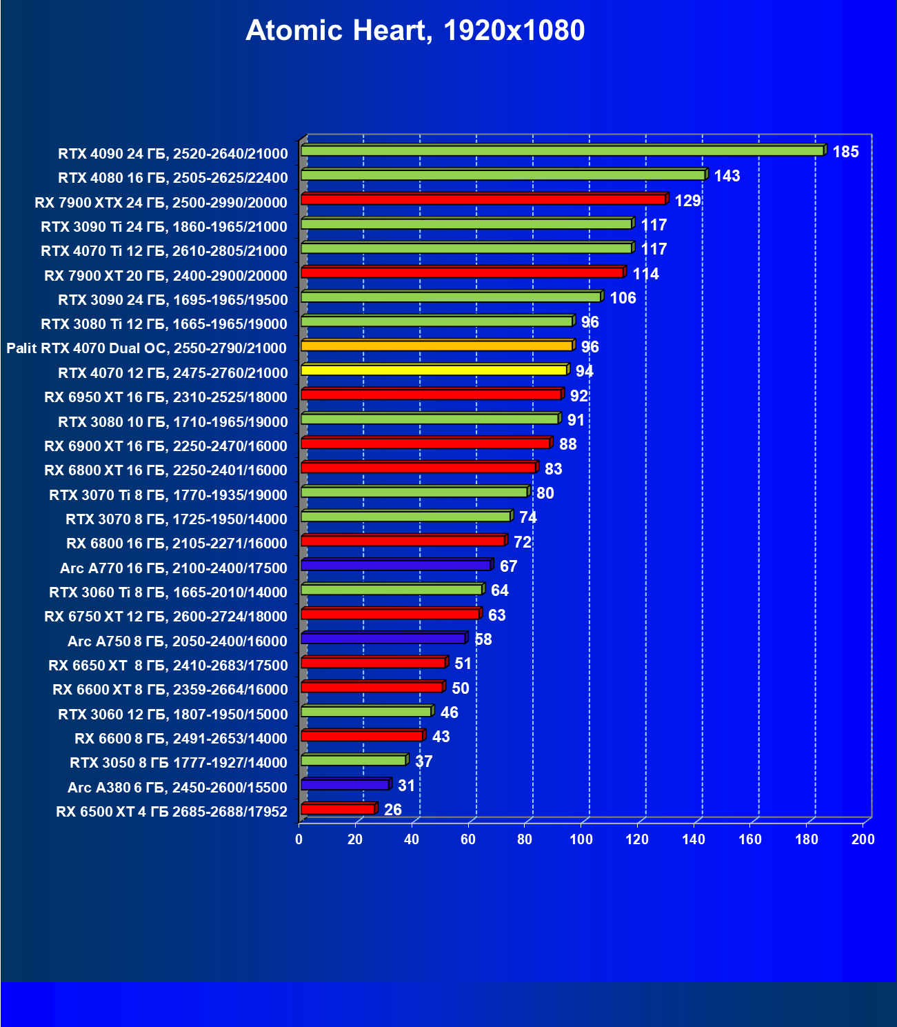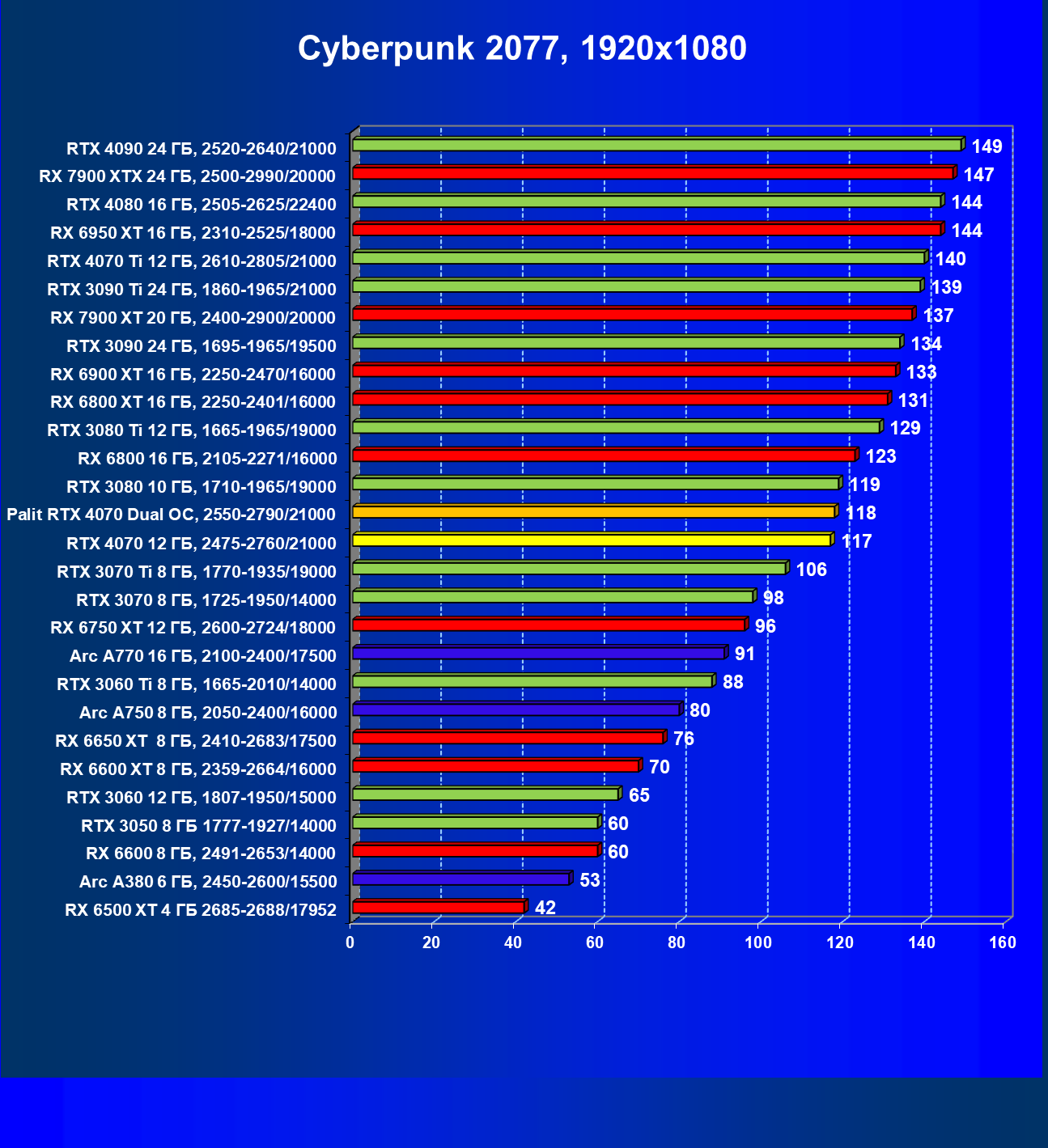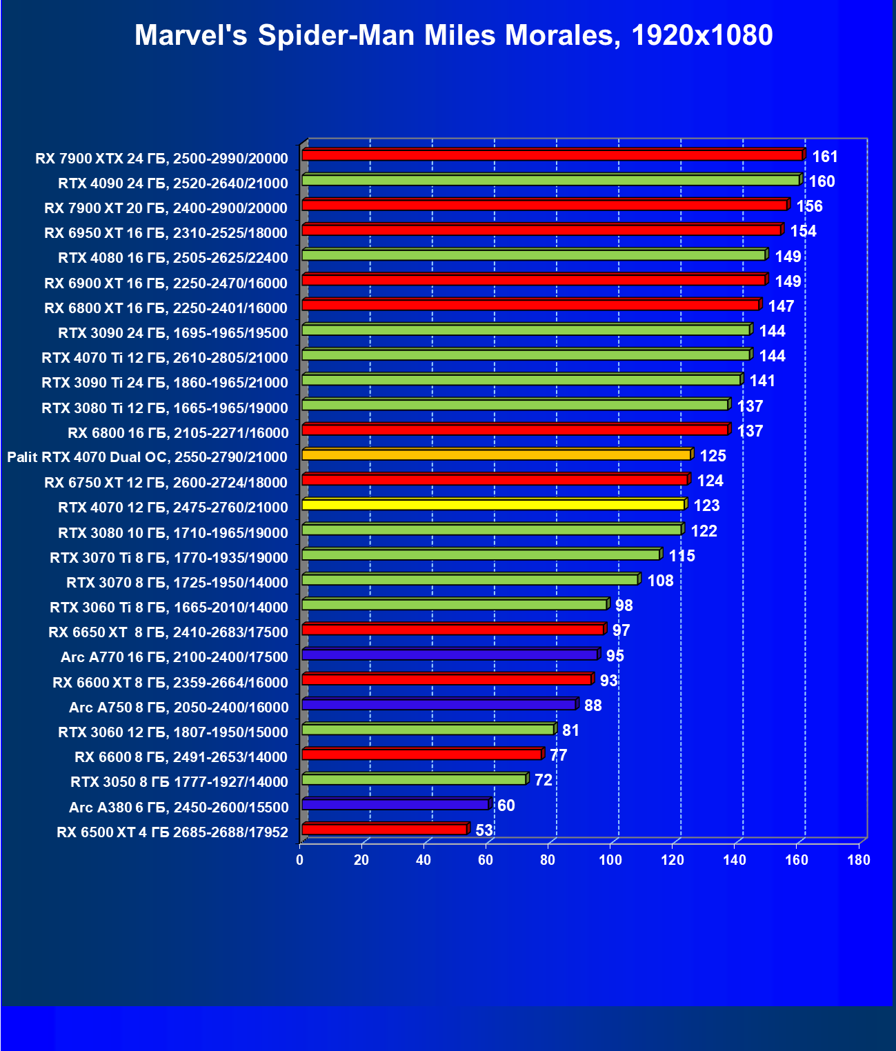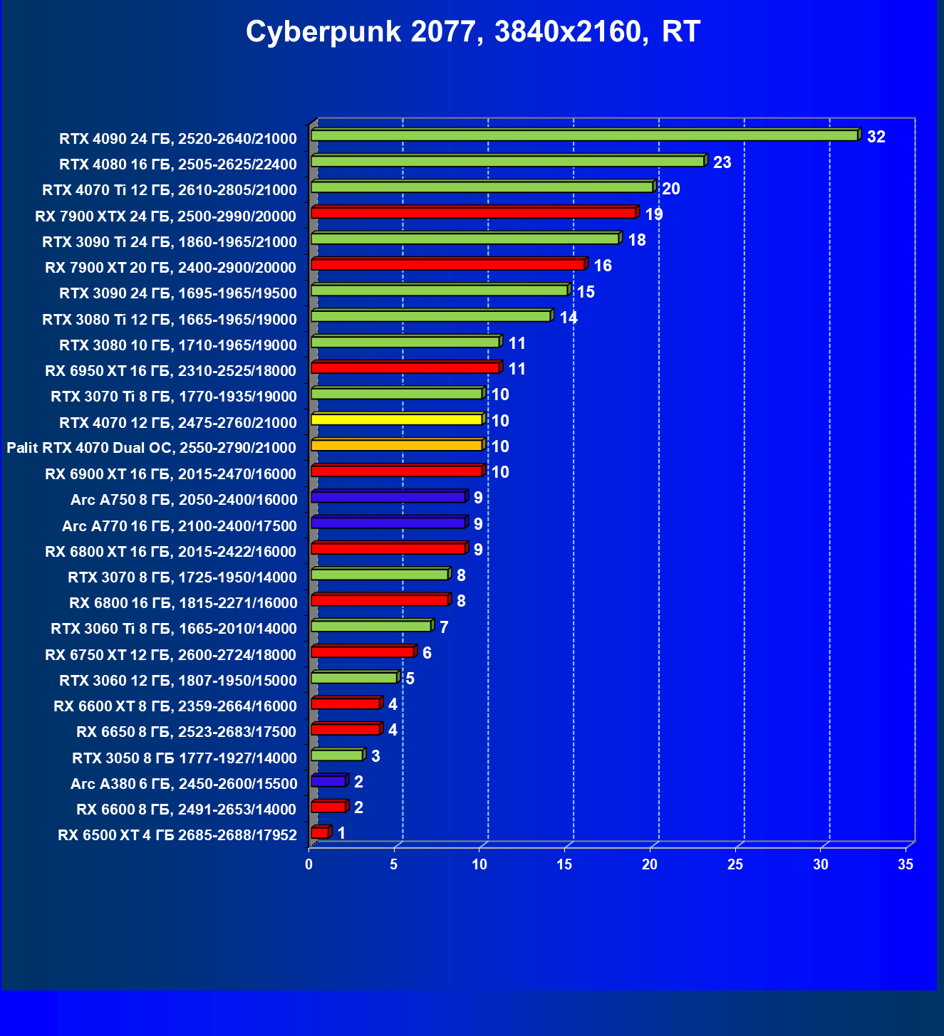 В этом рейтинге расклад сил совсем иной, и это при том, что лишь в трех играх из десяти поколение GeForce RTX 40 поддерживает технологию масштабирования DLSS 3.0. Отлично видно, что новинка даже при своей завышенной стоимости обошла всех соперников.