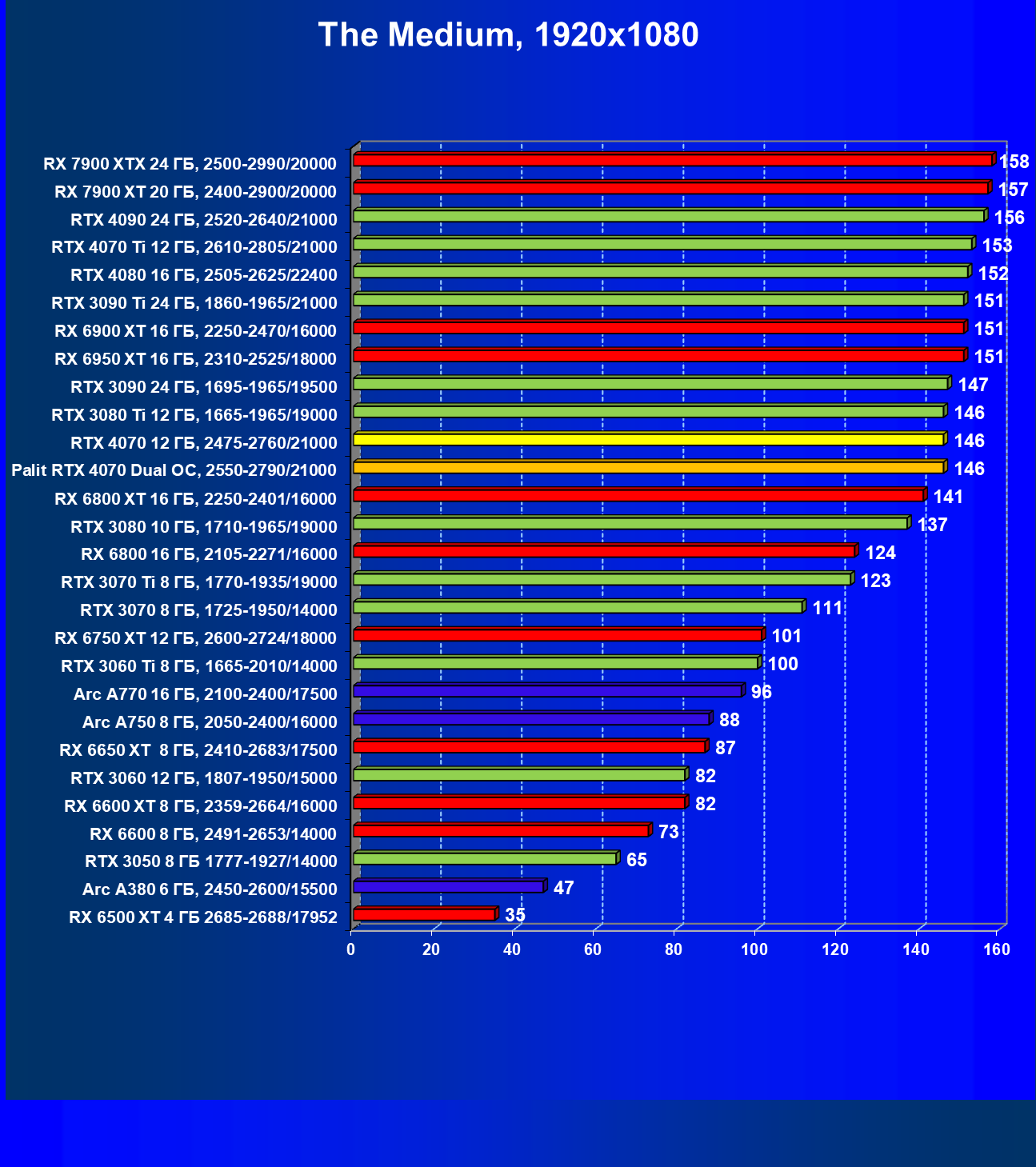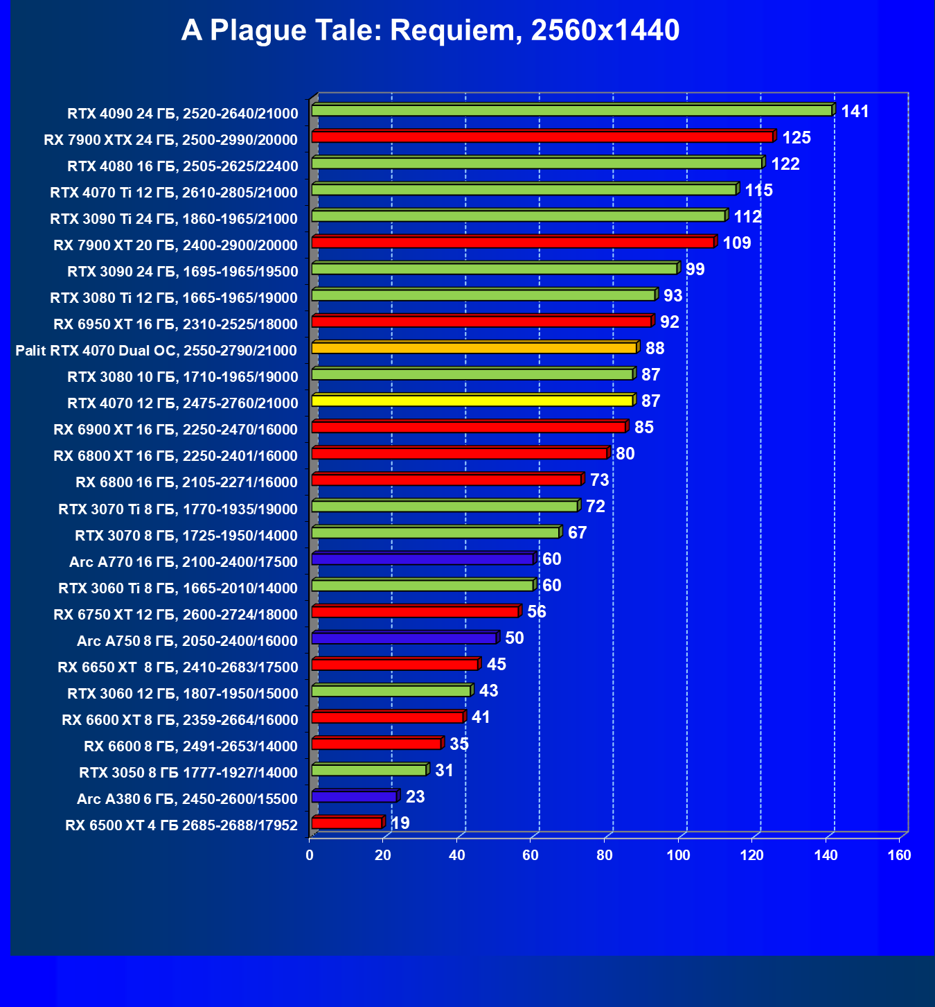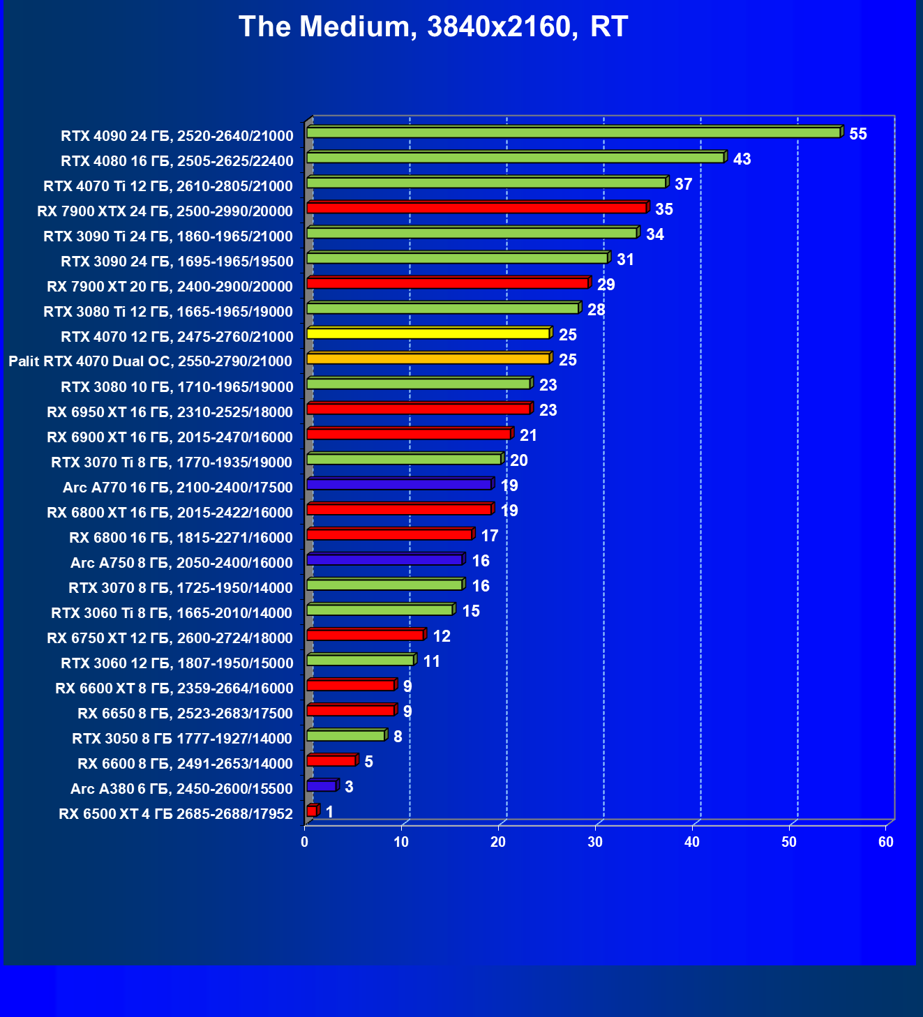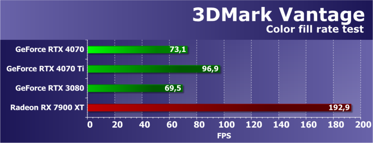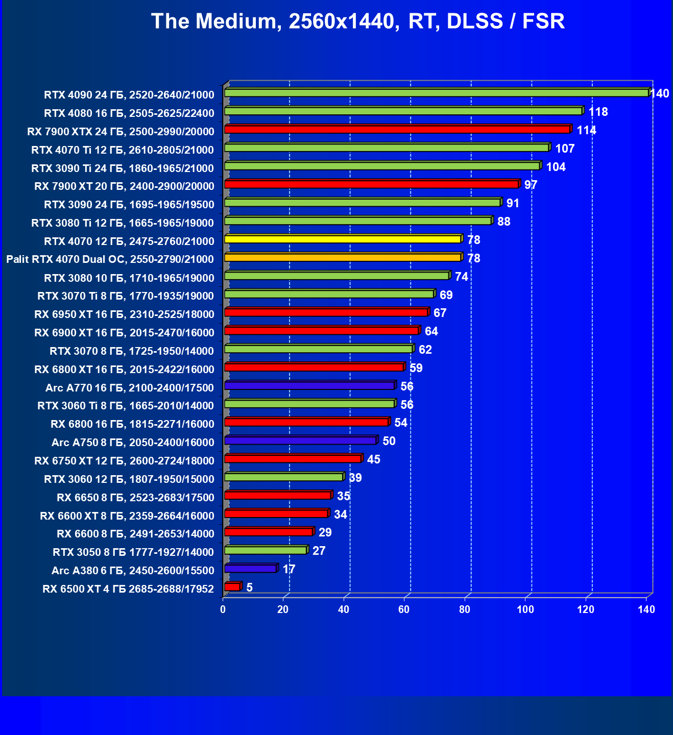 В этом рейтинге расклад сил совсем иной, и это при том, что лишь в трех играх из десяти поколение GeForce RTX 40 поддерживает технологию масштабирования DLSS 3.0. Отлично видно, что новинка даже при своей завышенной стоимости обошла всех соперников.