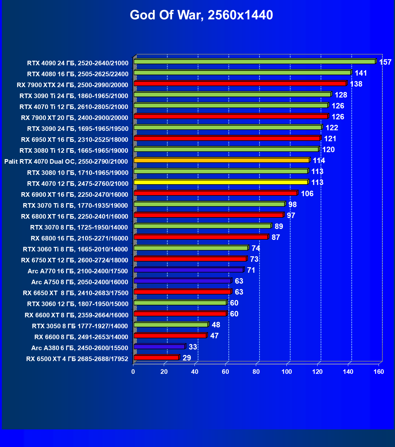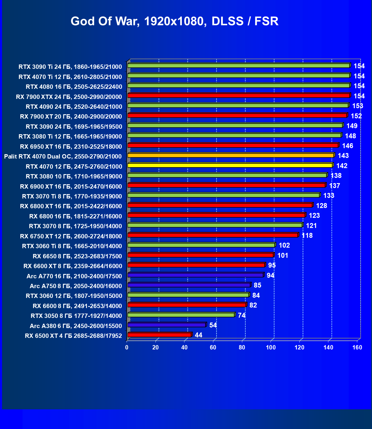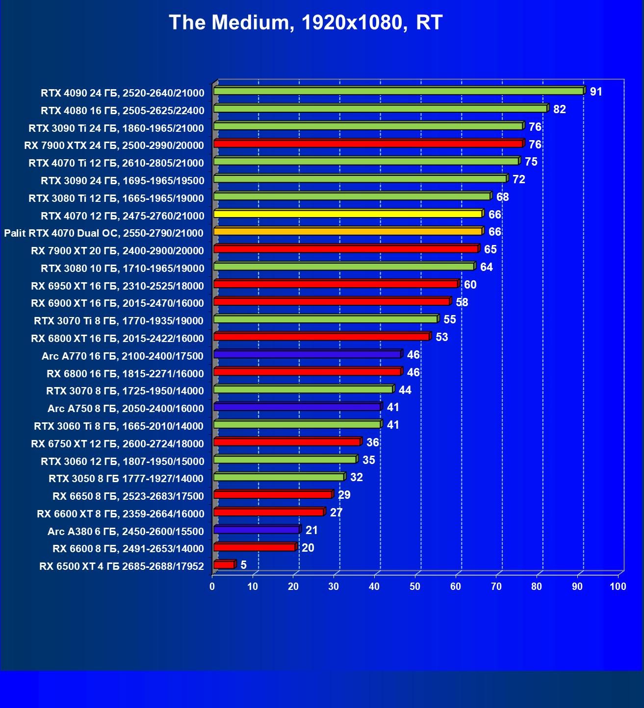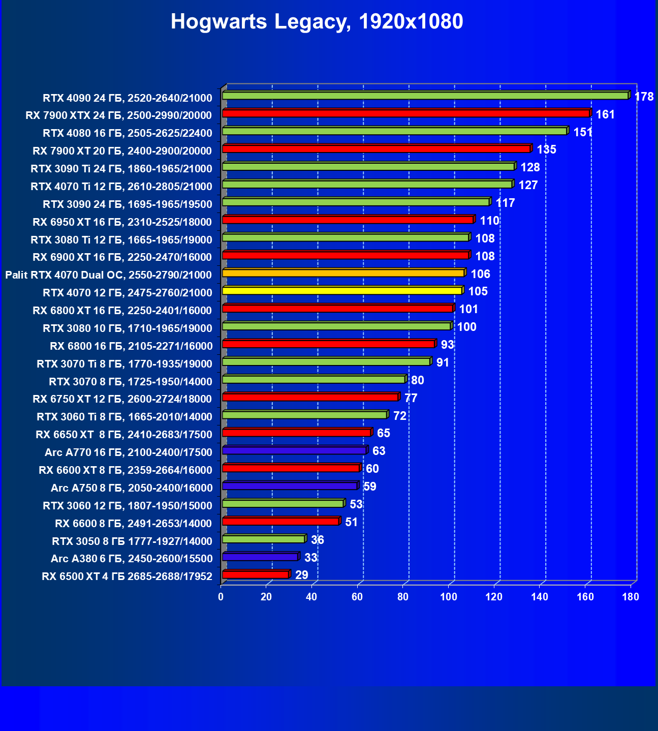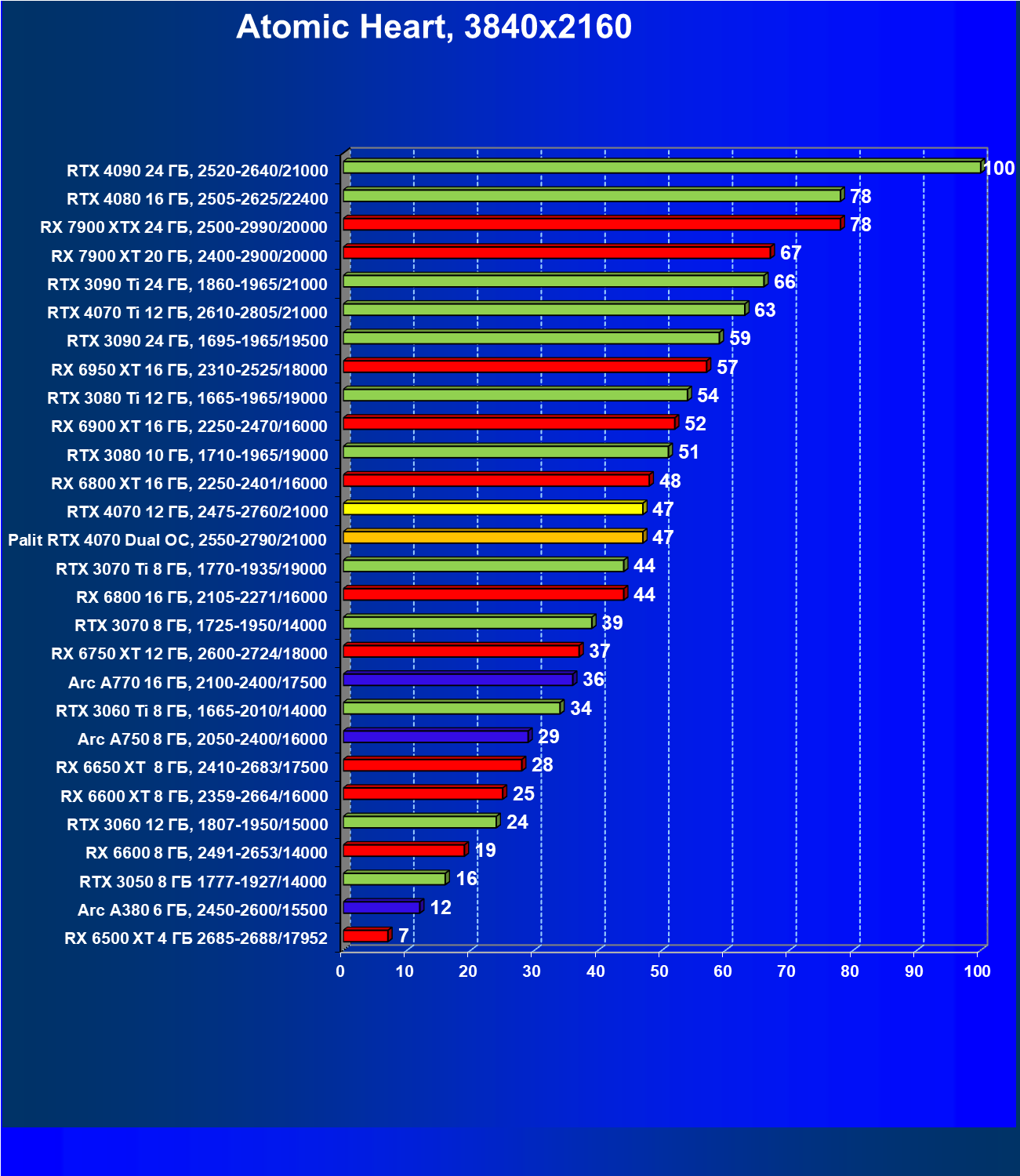 В этом рейтинге расклад сил совсем иной, и это при том, что лишь в трех играх из десяти поколение GeForce RTX 40 поддерживает технологию масштабирования DLSS 3.0. Отлично видно, что новинка даже при своей завышенной стоимости обошла всех соперников.