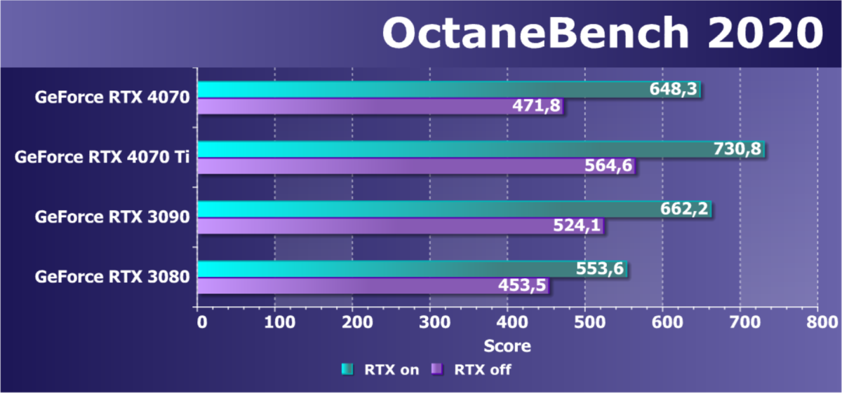 GeForce RTX 4070, выступая по производительности почти на уровне RTX 3080 (10 ГБ), имеет примерно такое же количество активных блоков и суммарное количество потоковых процессоров, как у GeForce RTX 3070 Ti. Здесь сыграли свою роль более тонкий техпроцесс и сильно повышенные частоты работы ядра, а также элементы новой архитектуры с увеличенными кэшами и новыми версиями блоков RT и тензорных ядер. Разумеется, широкое внедрение DLSS 3.0 поможет GeForce RTX 4070 стать намного более популярным ускорителем, чем тот же GeForce RTX 3080, даже если последний можно купить весьма дешево, ибо производство таких карт давно прекращено. (Сейчас распродаются остатки складских запасов, плюс вторичный рынок предлагает много таких моделей, однако стоит помнить, что GeForce RTX 3080 был очень популярным у майнеров, поэтому множество предложений таких карт на «вторичке» — после майнинга, приобретать их крайне рискованно.)