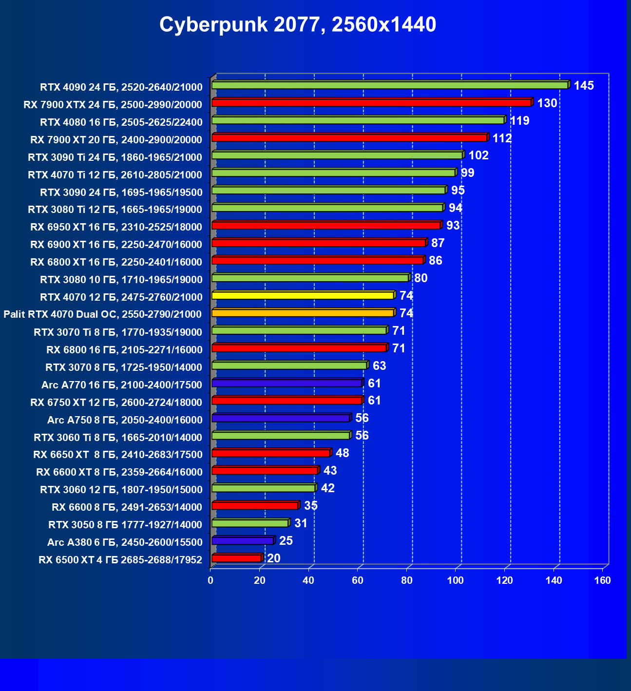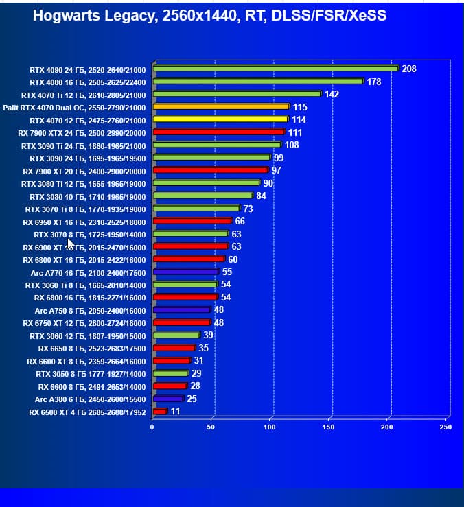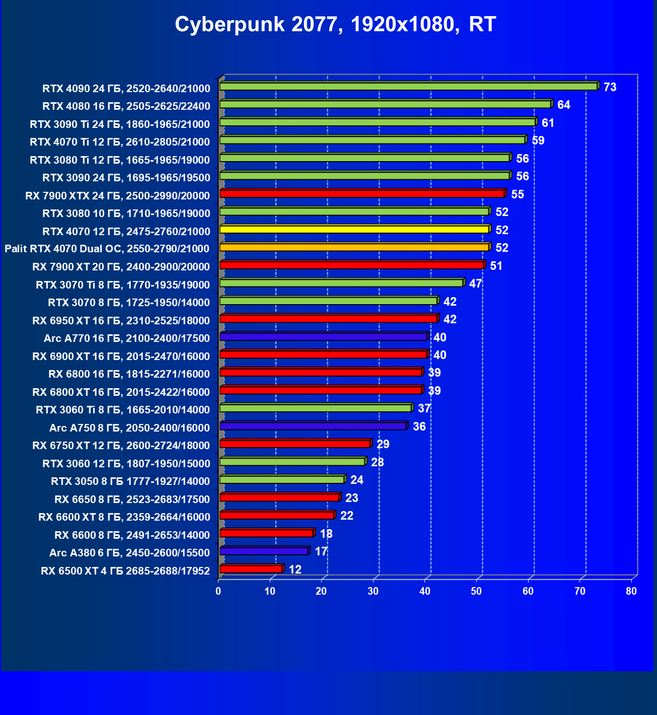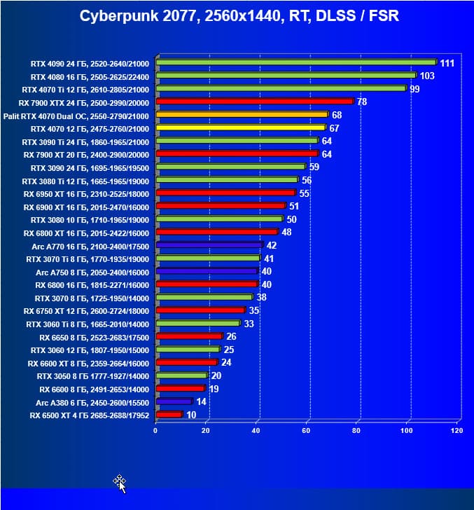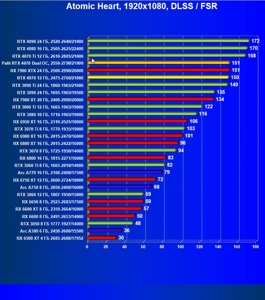 | 12 | Palit RTX 4070 Dual OC, 2550—2790/21000 | 453 | 69 | 70 000 |