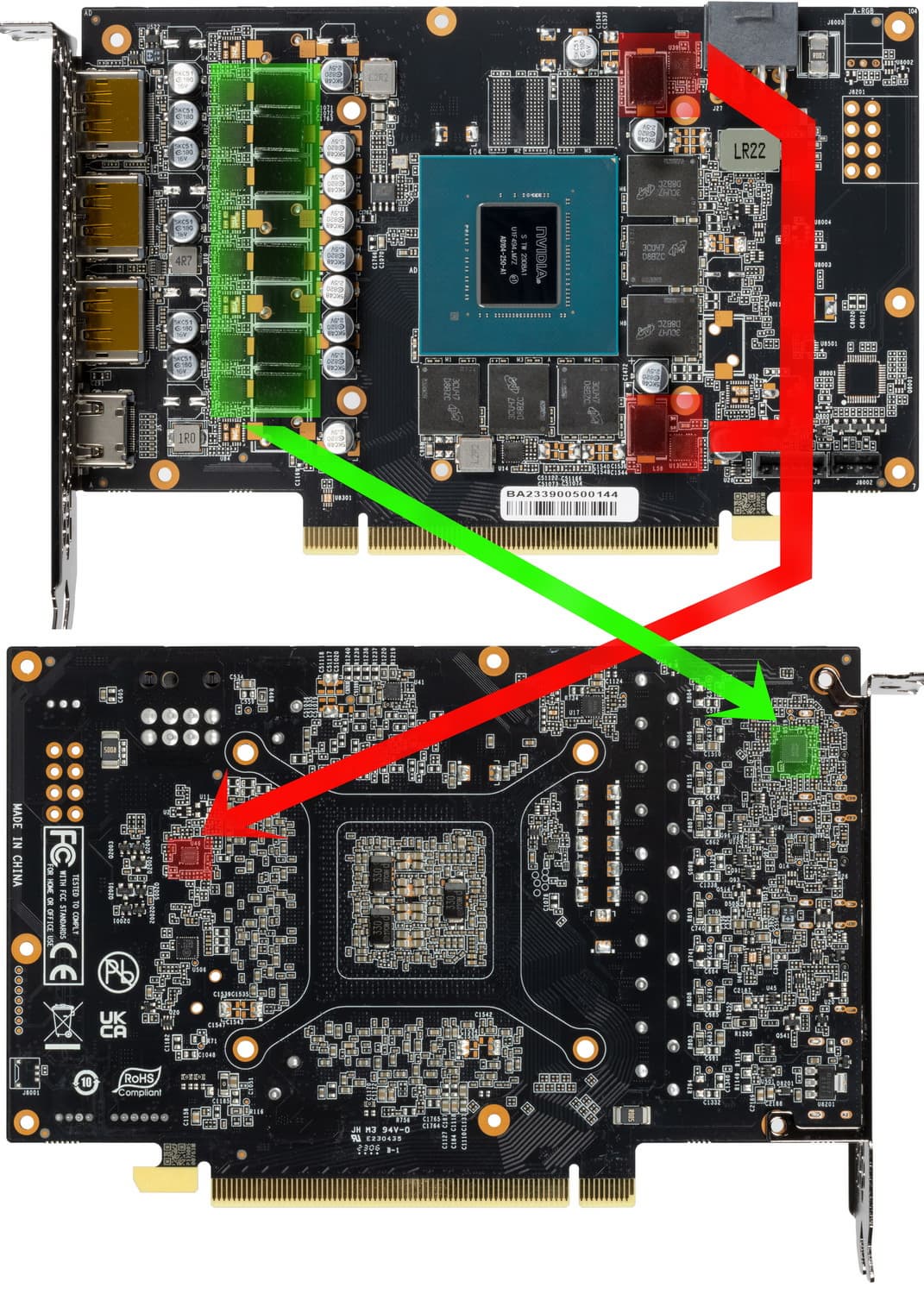 Интересно, что в случае видеокарты GeForce RTX 4070 компания Nvidia решила также выпустить модель в собственном исполнении — Founders Edition. FE-издание сочетает многие элементы конструкции и дизайна, уже виденные нами в GeForce RTX 4080 и RTX 4090 Founders Edition — применяются аналогичные материалы и строгий дизайн с двумя вентиляторами, один из которых продувает радиатор насквозь. Система охлаждения RTX 4070 Founders Edition была улучшена по сравнению с видеокартами серии RTX 3070, она имеет медную основу с четырьмя тепловыми трубками, которая эффективно отводит тепло от графического процессора AD104 и передает ее остальной части радиатора. Вентиляторы этой версии RTX 4070 обеспечивают на 20% больший воздушный поток по сравнению с кулером RTX 3070 Ti FE. В модели Founders Edition используется шесть фаз в подсистеме питания, две из которых выделены на обеспечение работы чипов GDDR6X-памяти.
