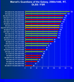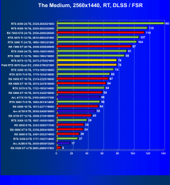 Рейтинг составлен по 9 тестам, в которых используется технология трассировки лучей и одновременно технология Nvidia DLSS, AMD FSR или Intel XeSS. Этот рейтинг нормирован по самому слабому ускорителю в данной группе — Radeon RX 6500 XT (то есть сочетание скорости и функций Radeon RX 6500 XT приняты за 100%).