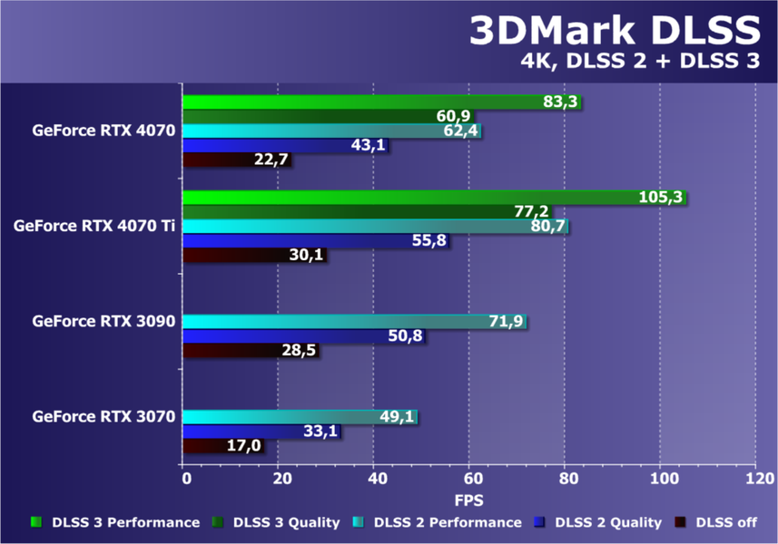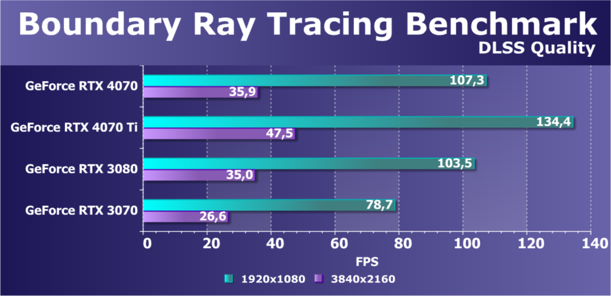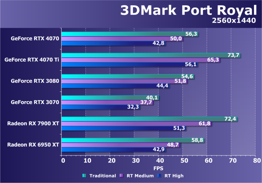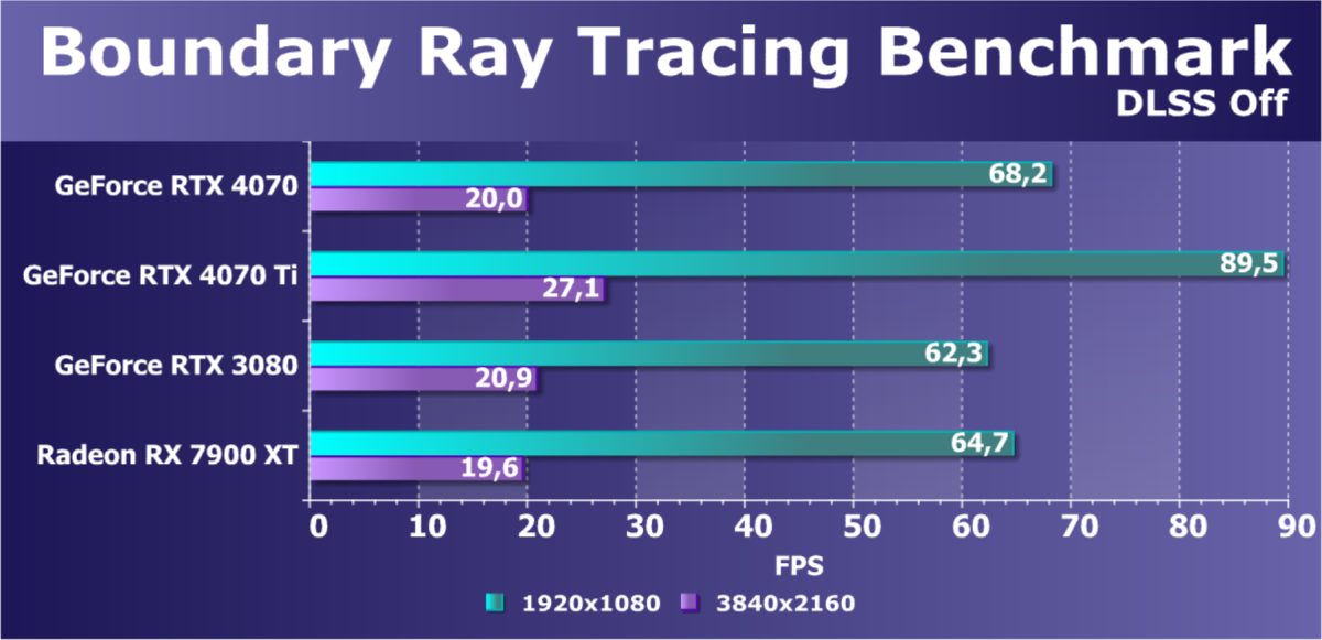 C учетом некоторого падения производительности при активации в играх трассировки лучей (при этом появляется всё больше и больше игр с поддержкой Nvidia DLSS, а эта технология масштабирования позволяет резко поднять производительность, в том числе компенсируя падение от включения RT) , а также того факта, что у видеокарт Radeon RX 6000 падение FPS куда более драматичное, новинка RTX 4070 смотрится особенно ярко, и к тому же, приобретая RTX 4070, игрок получает и поддержку DLSS 3, так что в соответствующих играх можно будет вообще никогда не отключать трассировку лучей.