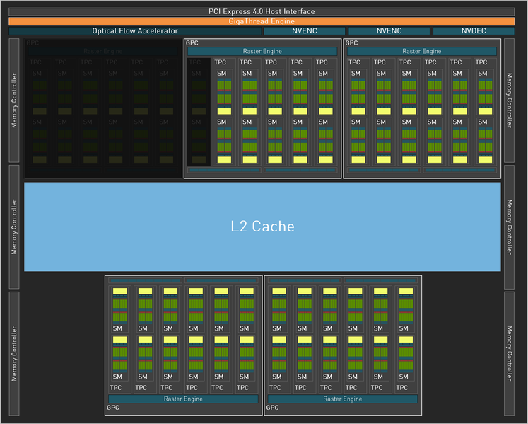 Как и все графические процессоры компании Nvidia, чип AD104 состоит из укрупненных кластеров Graphics Processing Cluster (GPC), которые включают несколько кластеров текстурной обработки Texture Processing Cluster (TPC), содержащих потоковые процессоры Streaming Multiprocessor (SM), блоки растеризации ROP и контроллеры памяти. Как и в предыдущих архитектурах, кластер GPC самостоятельно производит все основные вычисления внутри кластера, и включает свой движок растеризации Raster Engine, шесть кластеров TPC, состоящих из 12 мультипроцессоров SM. Но выше мы говорили о полноценном GPU, а в RTX 4070 применяется урезанная версия: