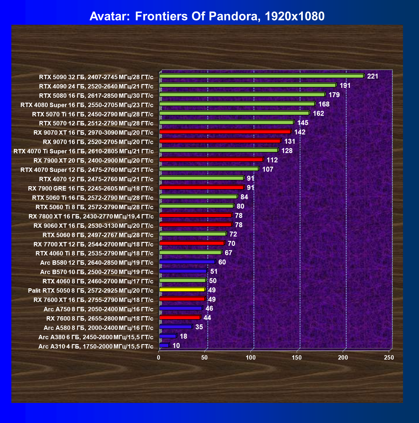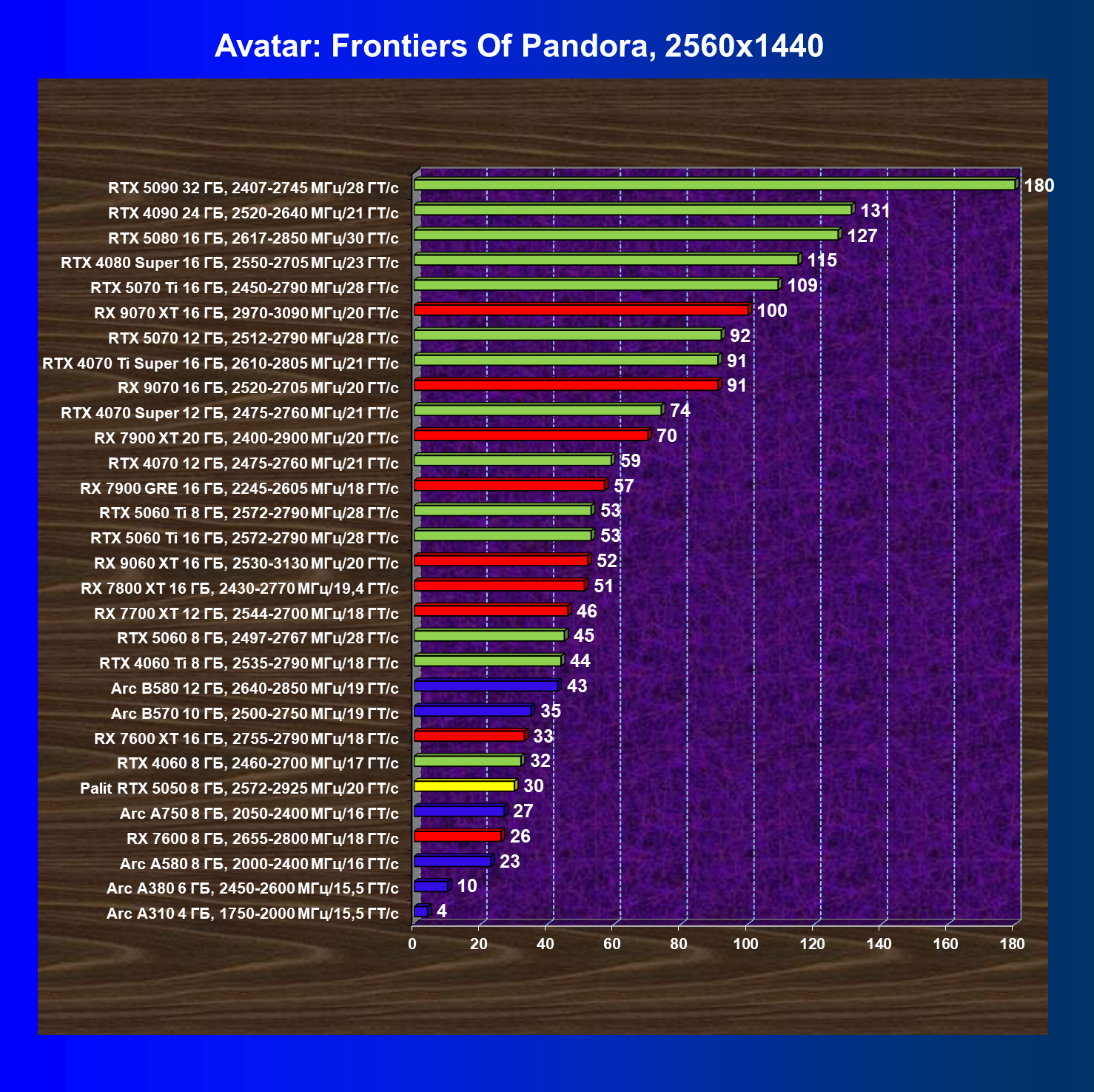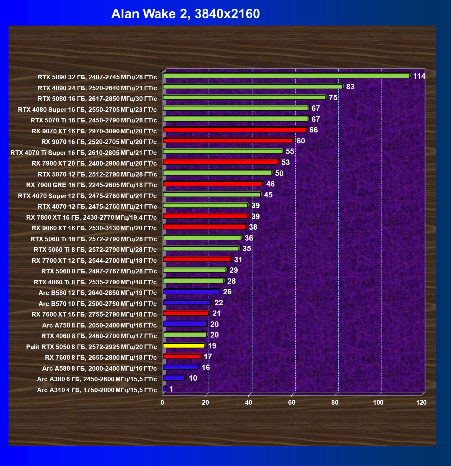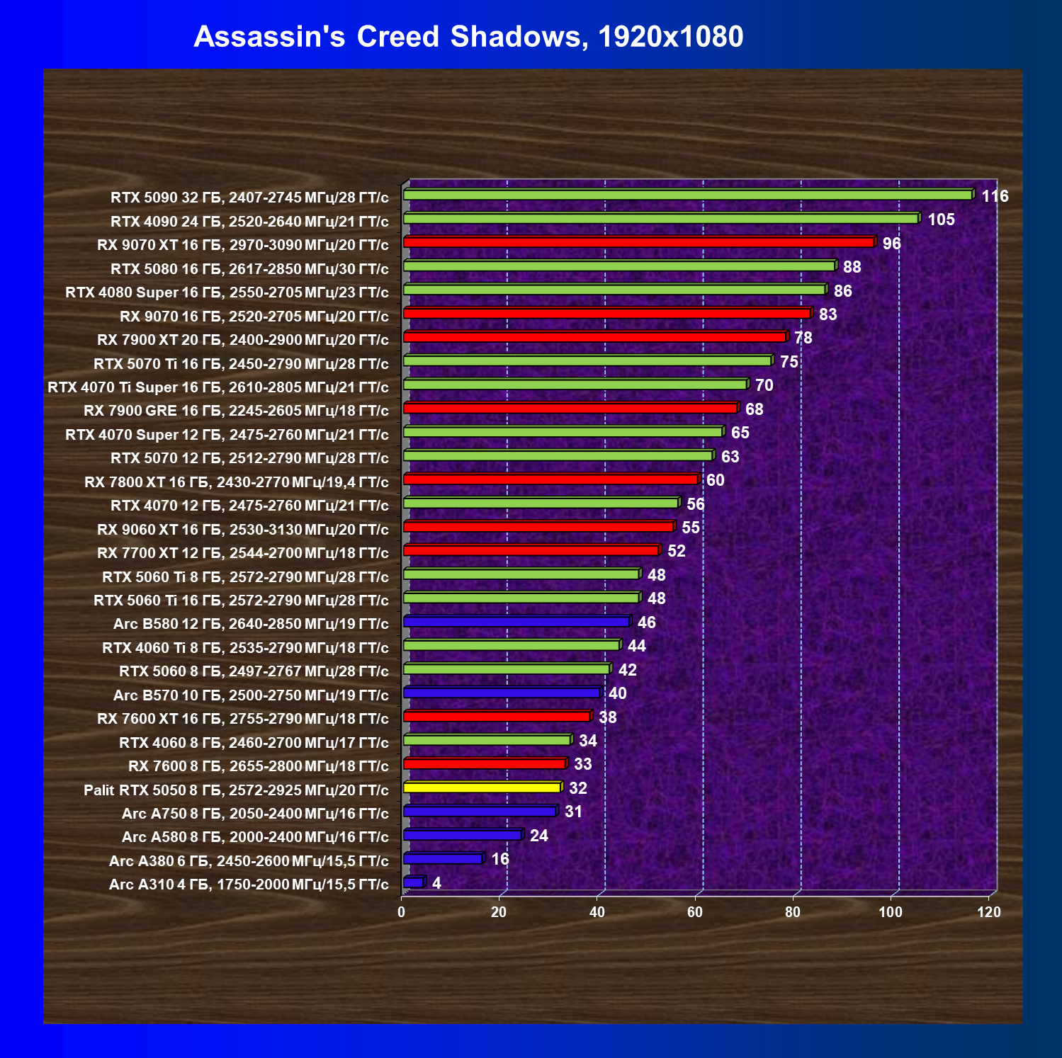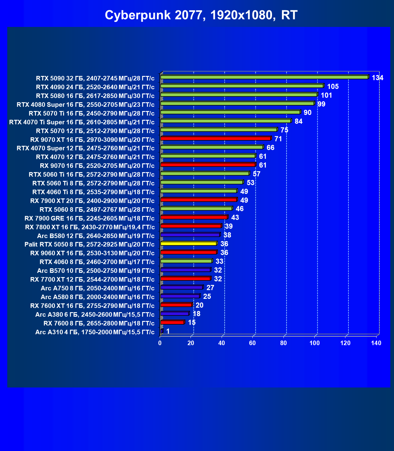 | 04 | Palit RTX 5050 8 ГБ, 2572—2925 МГц/20 ГТ/с | 362 | 1085 | 30 000 |