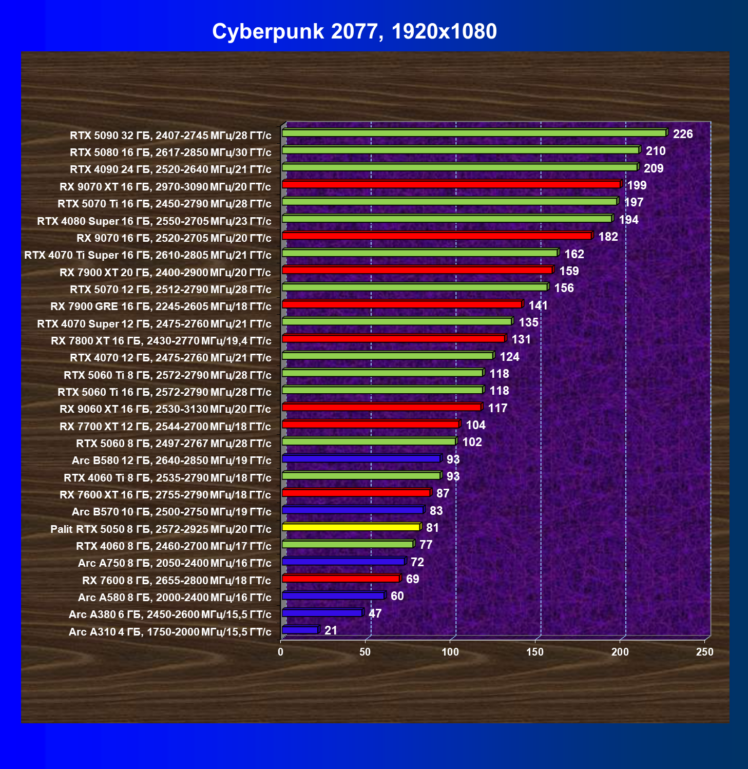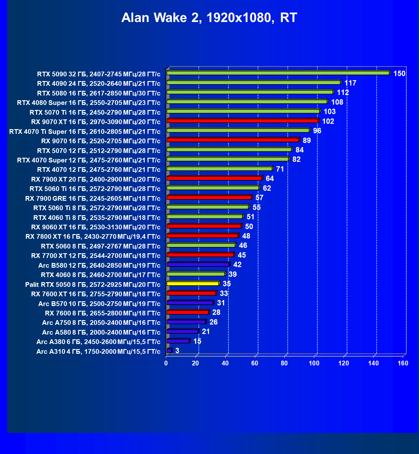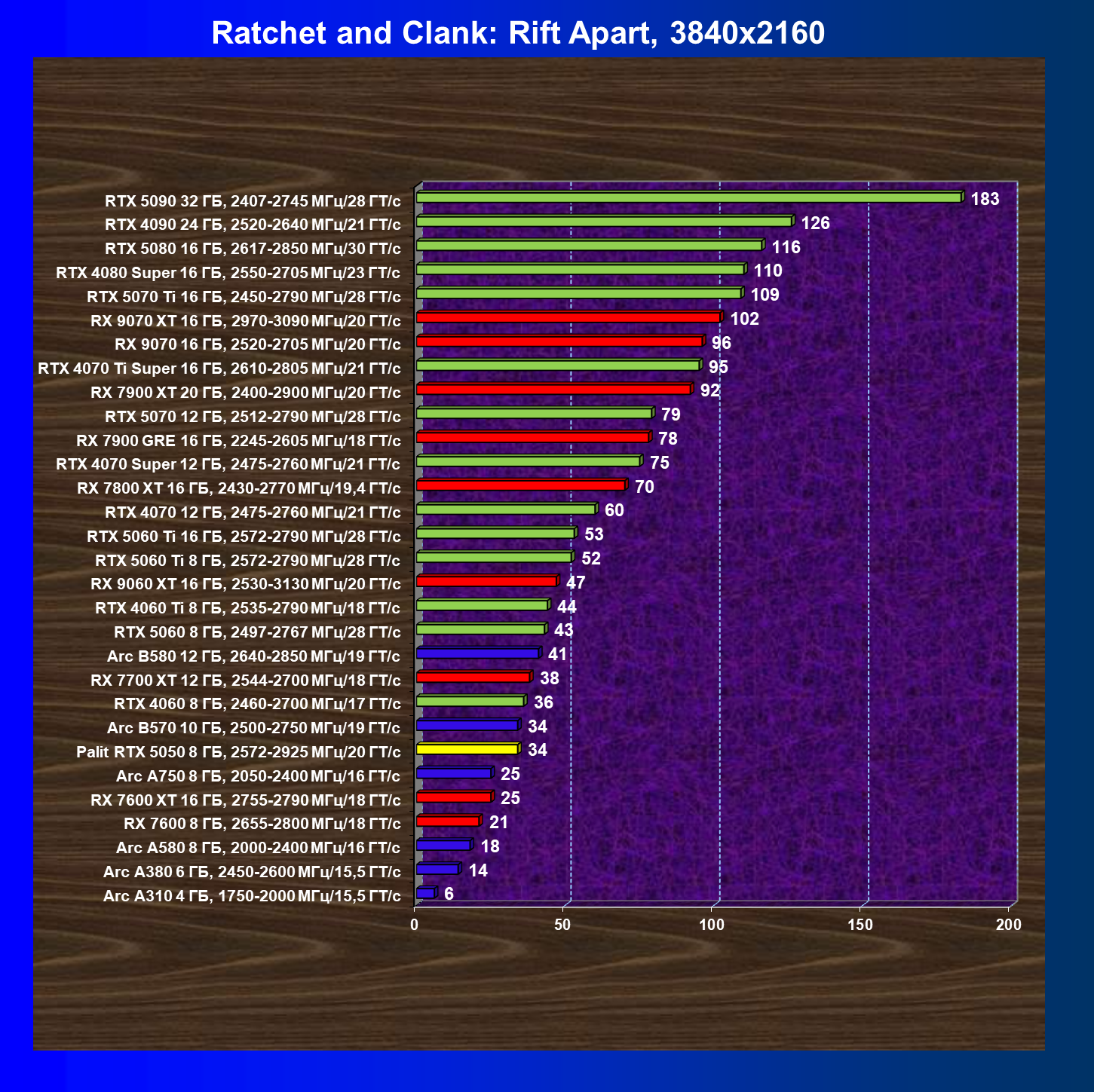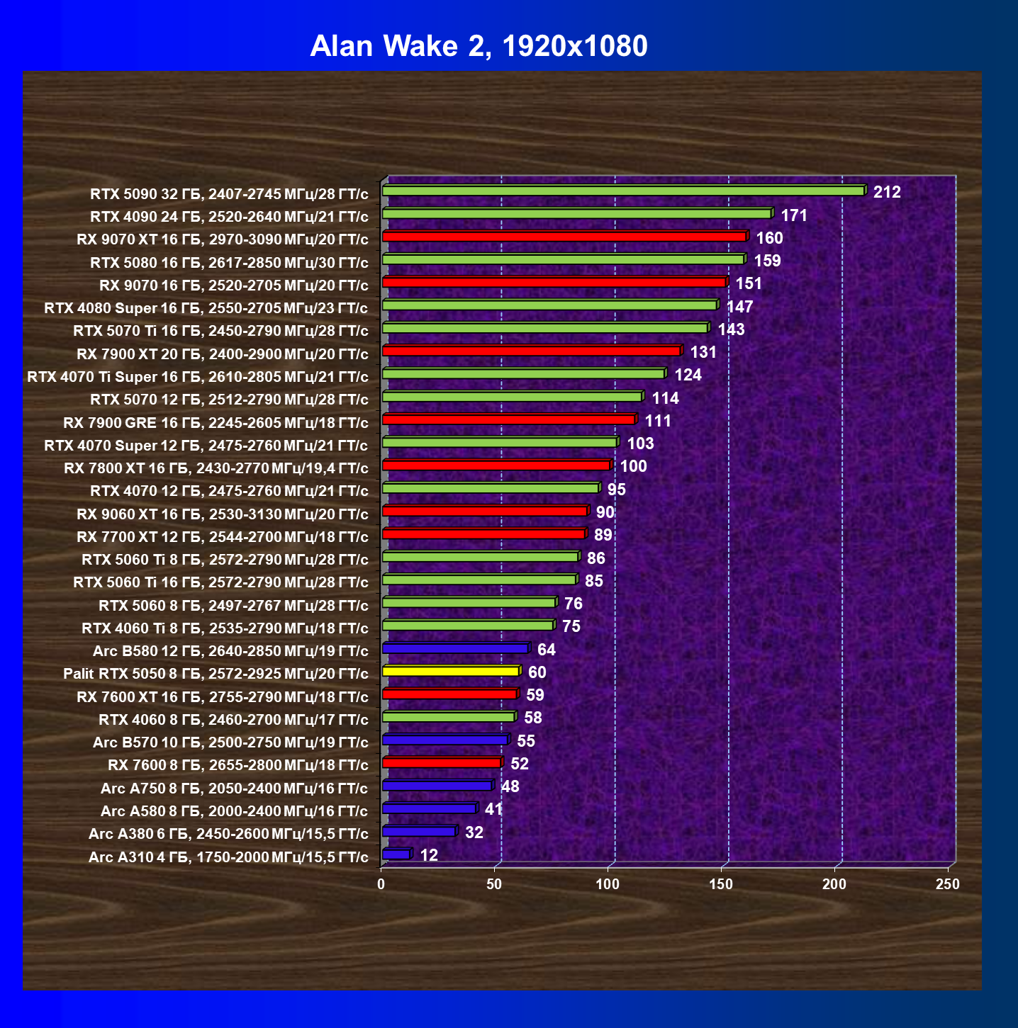 | 04 | Palit RTX 5050 8 ГБ, 2572—2925 МГц/20 ГТ/с | 362 | 1085 | 30 000 |