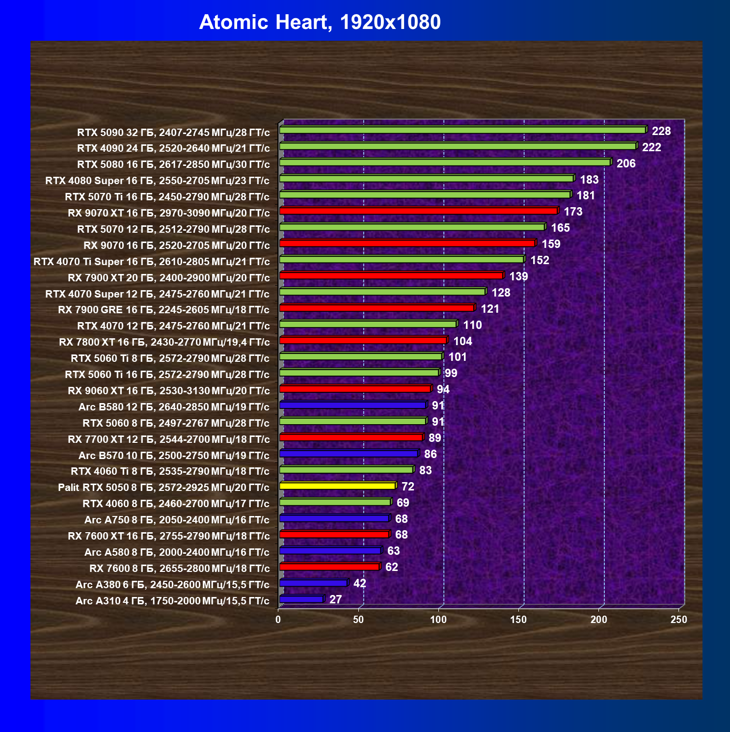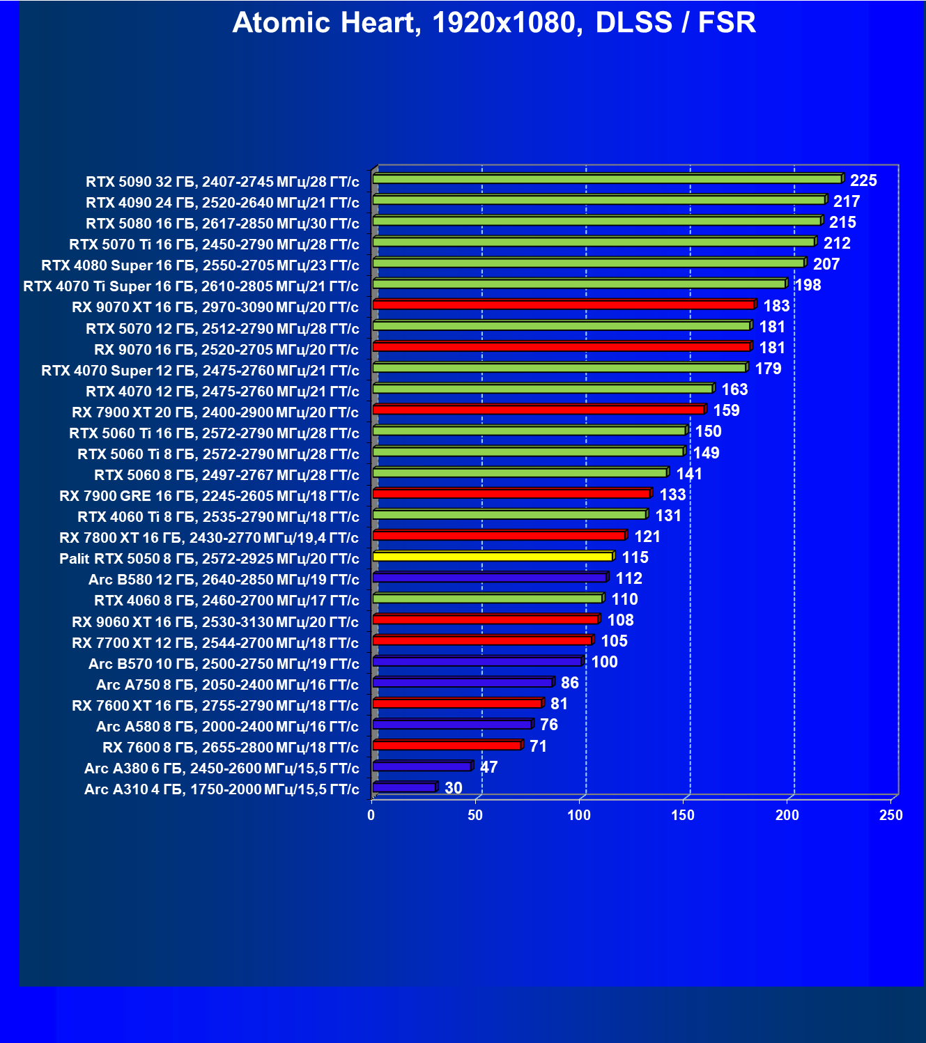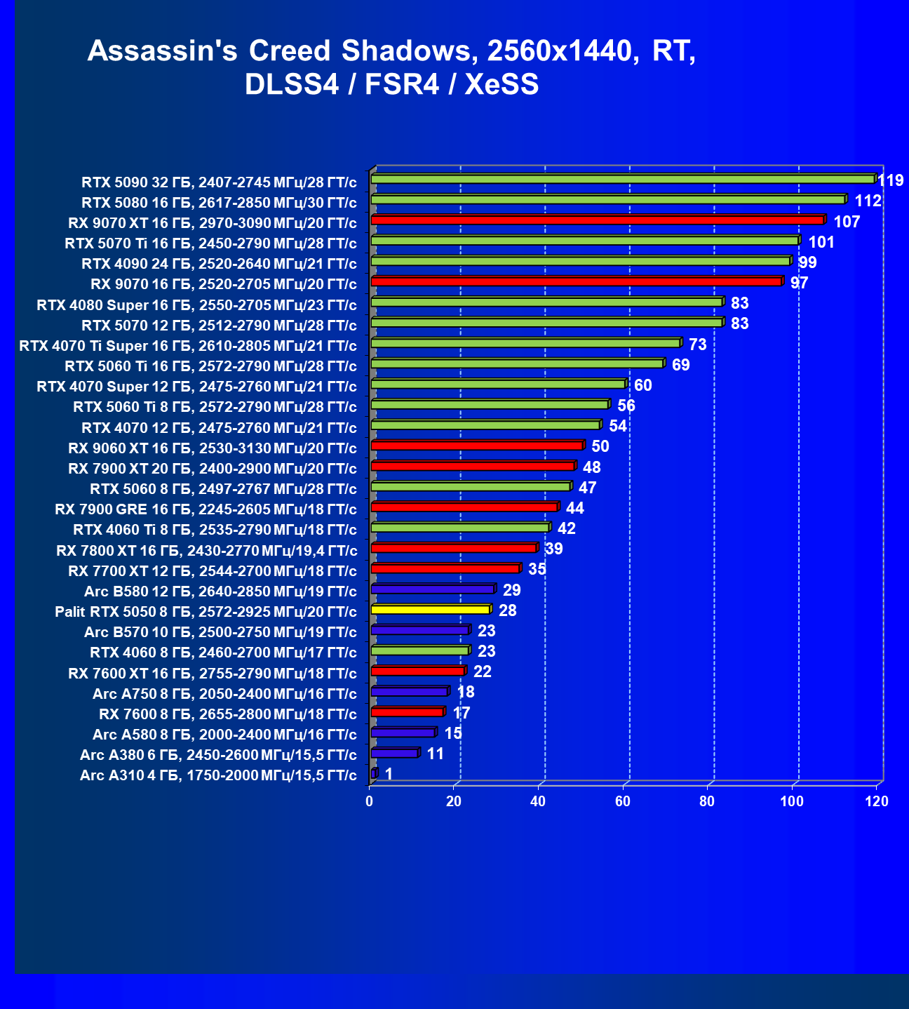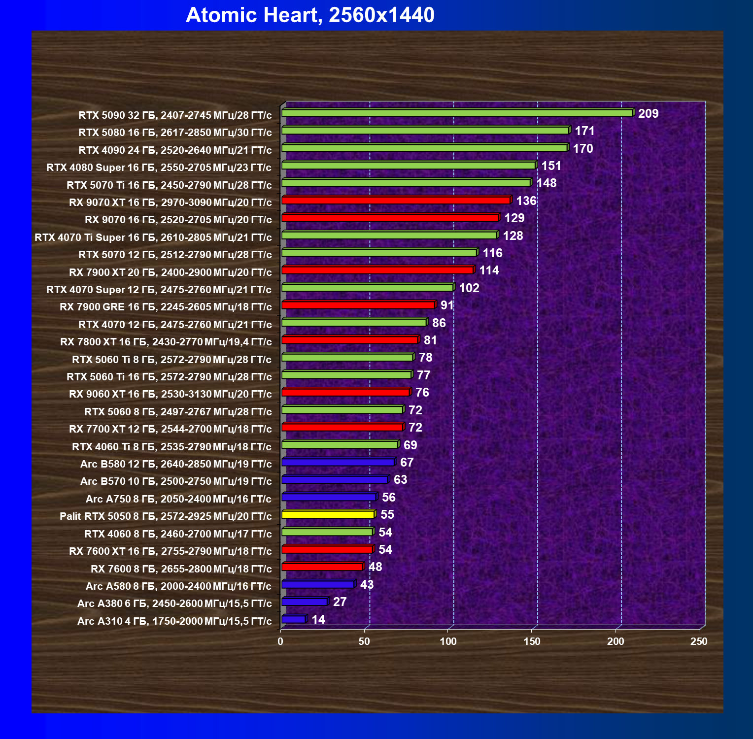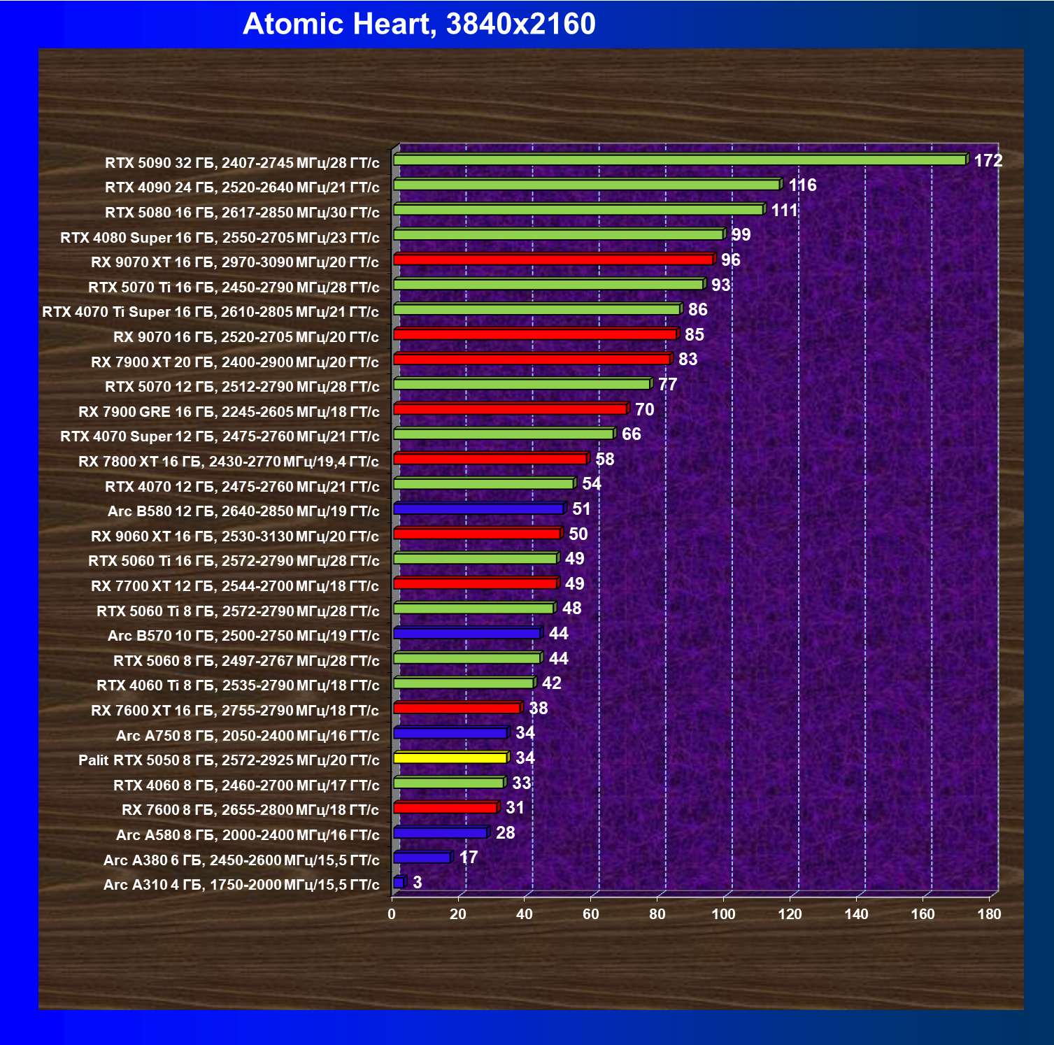 | 04 | Palit RTX 5050 8 ГБ, 2572—2925 МГц/20 ГТ/с | 362 | 1085 | 30 000 |