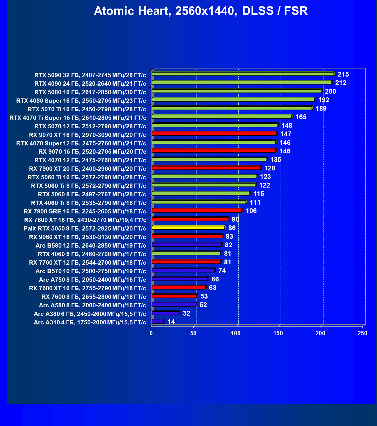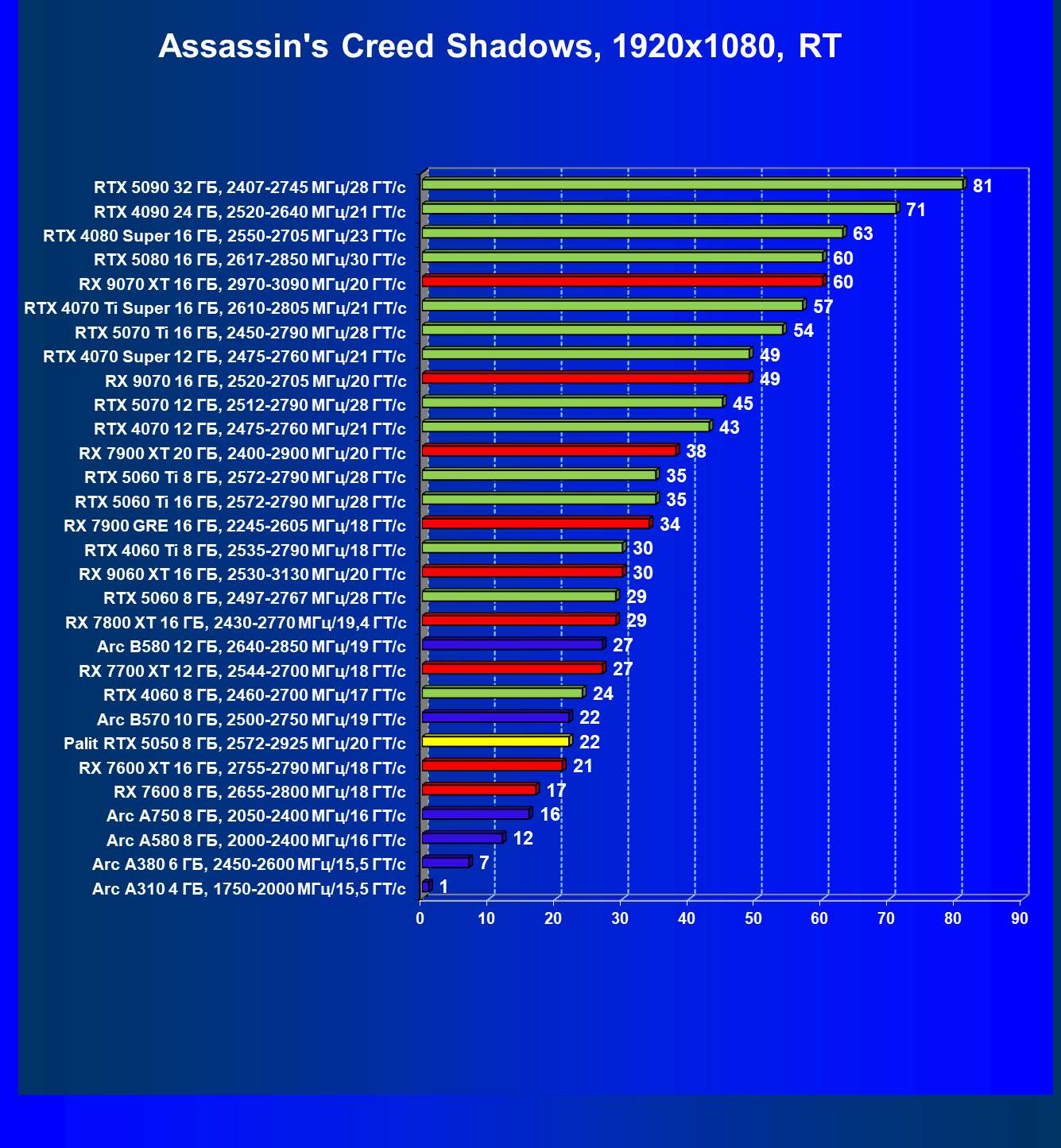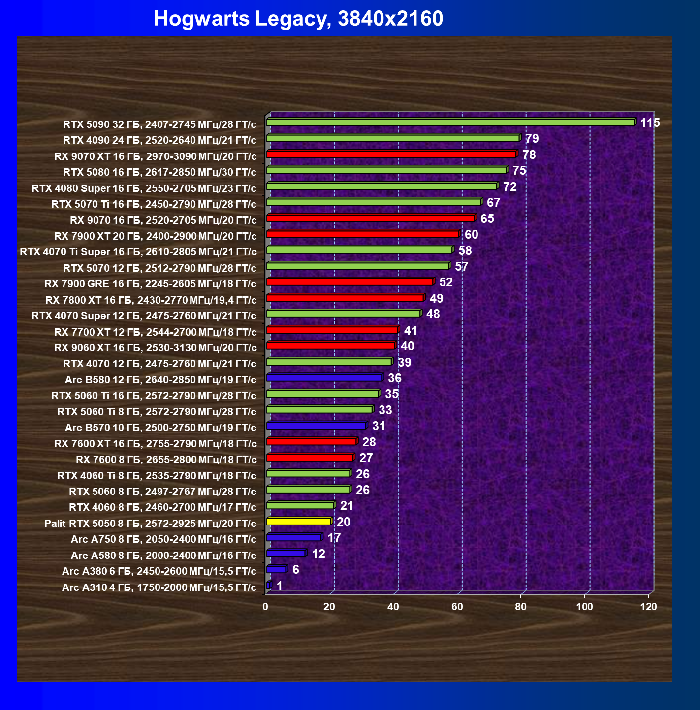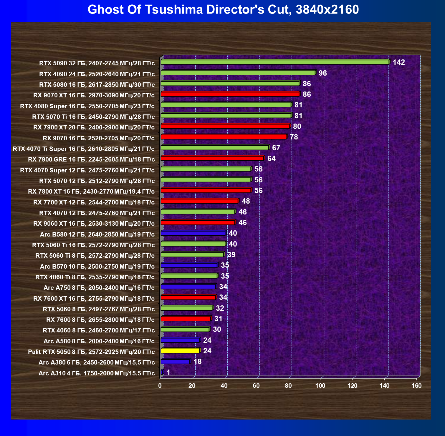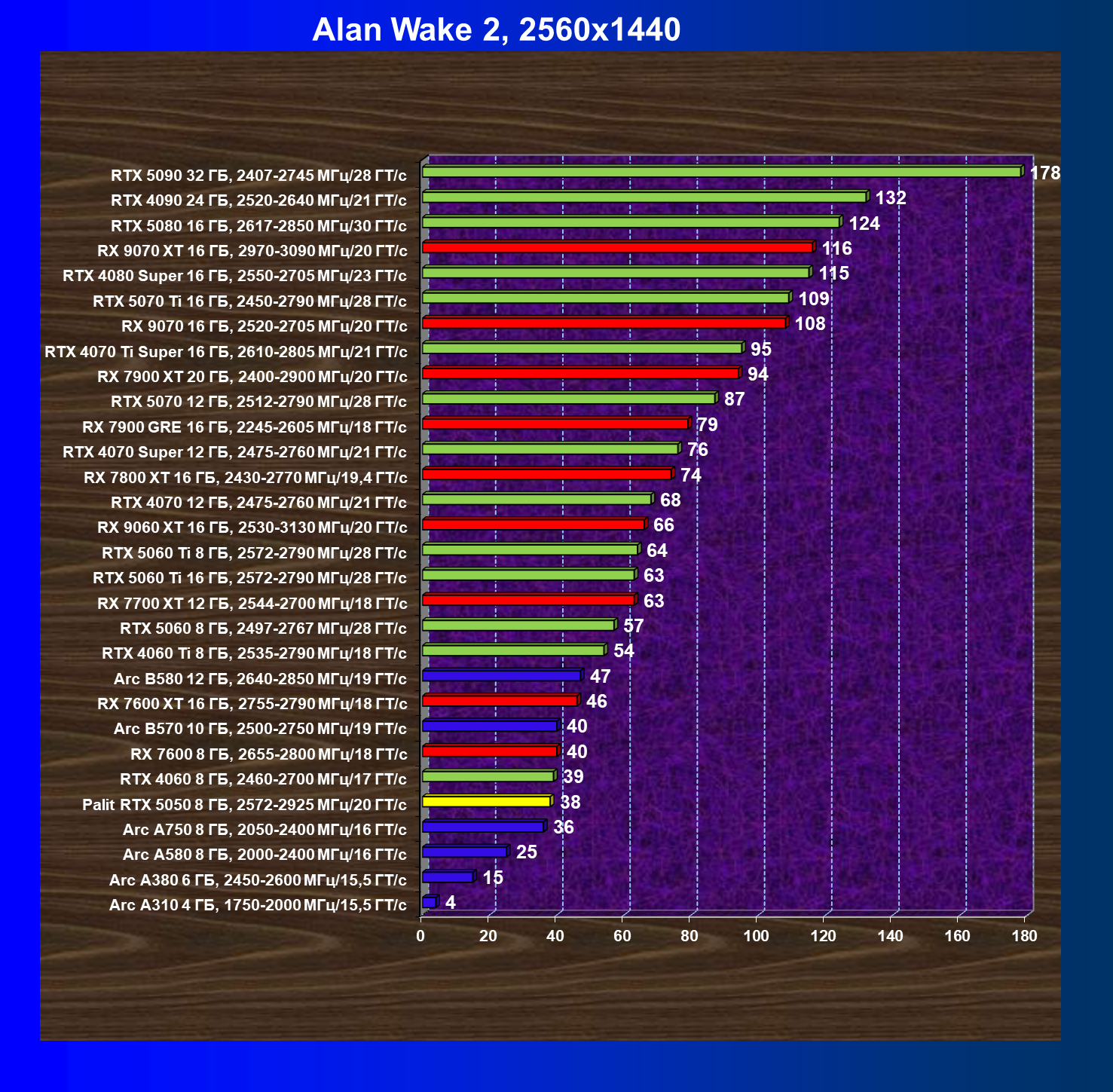 | 04 | Palit RTX 5050 8 ГБ, 2572—2925 МГц/20 ГТ/с | 362 | 1085 | 30 000 |