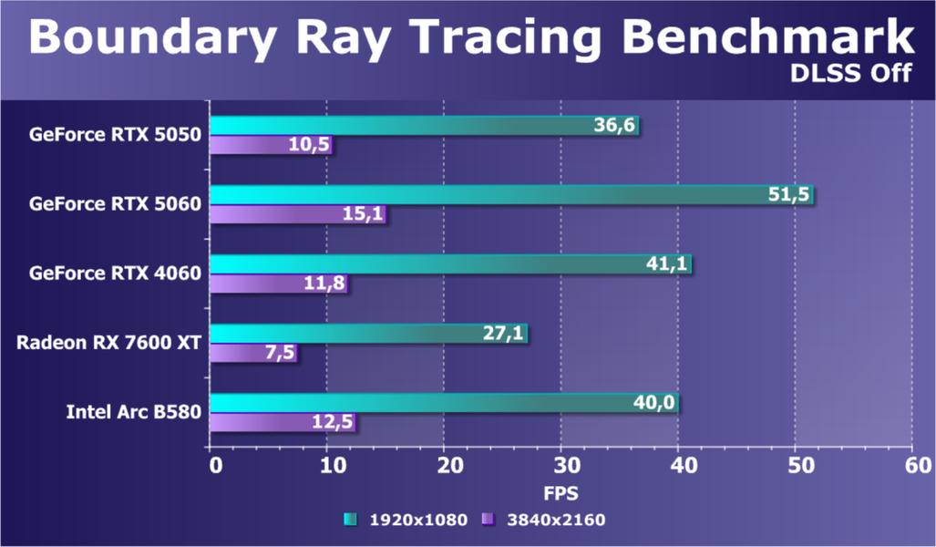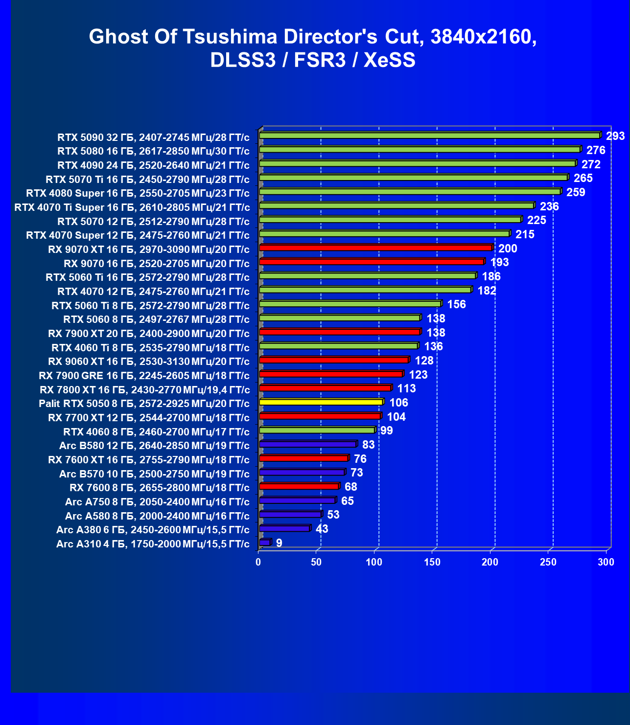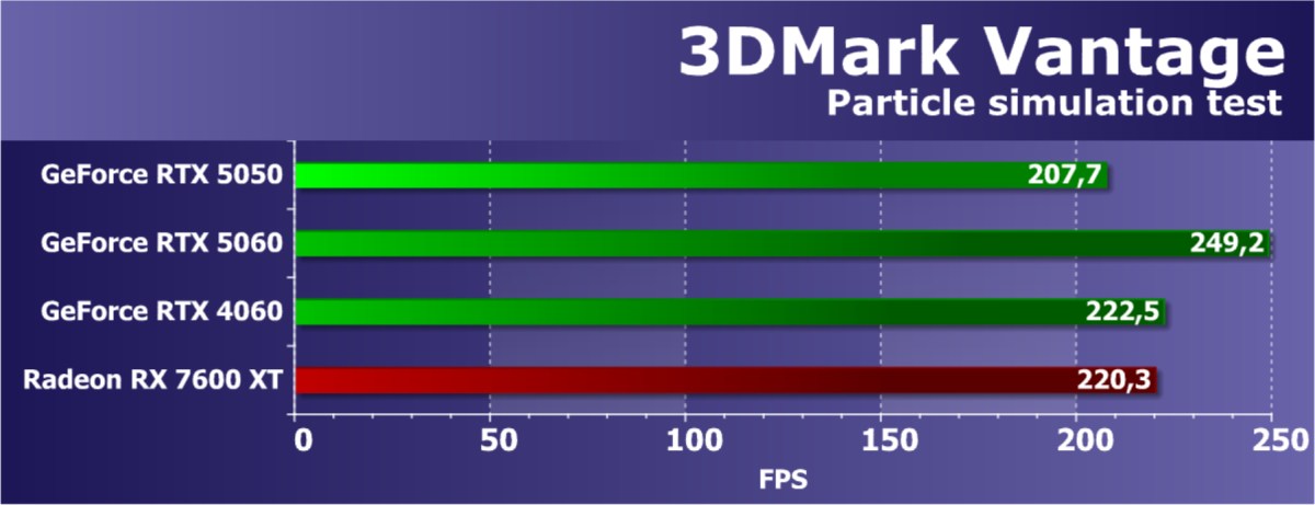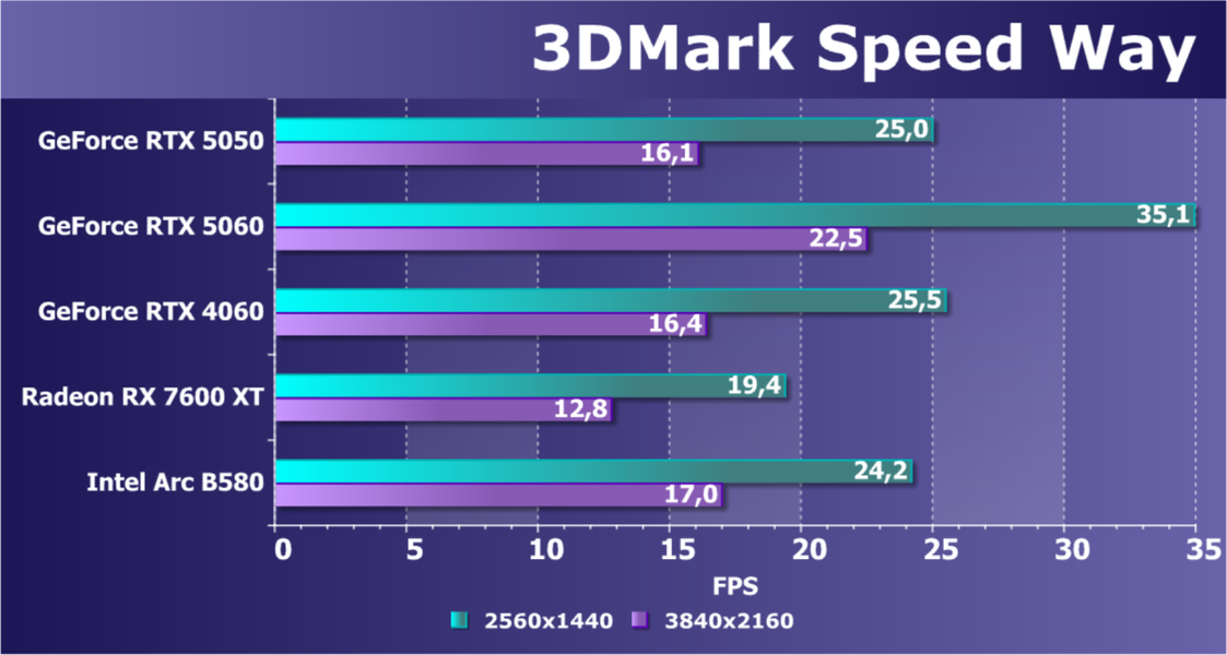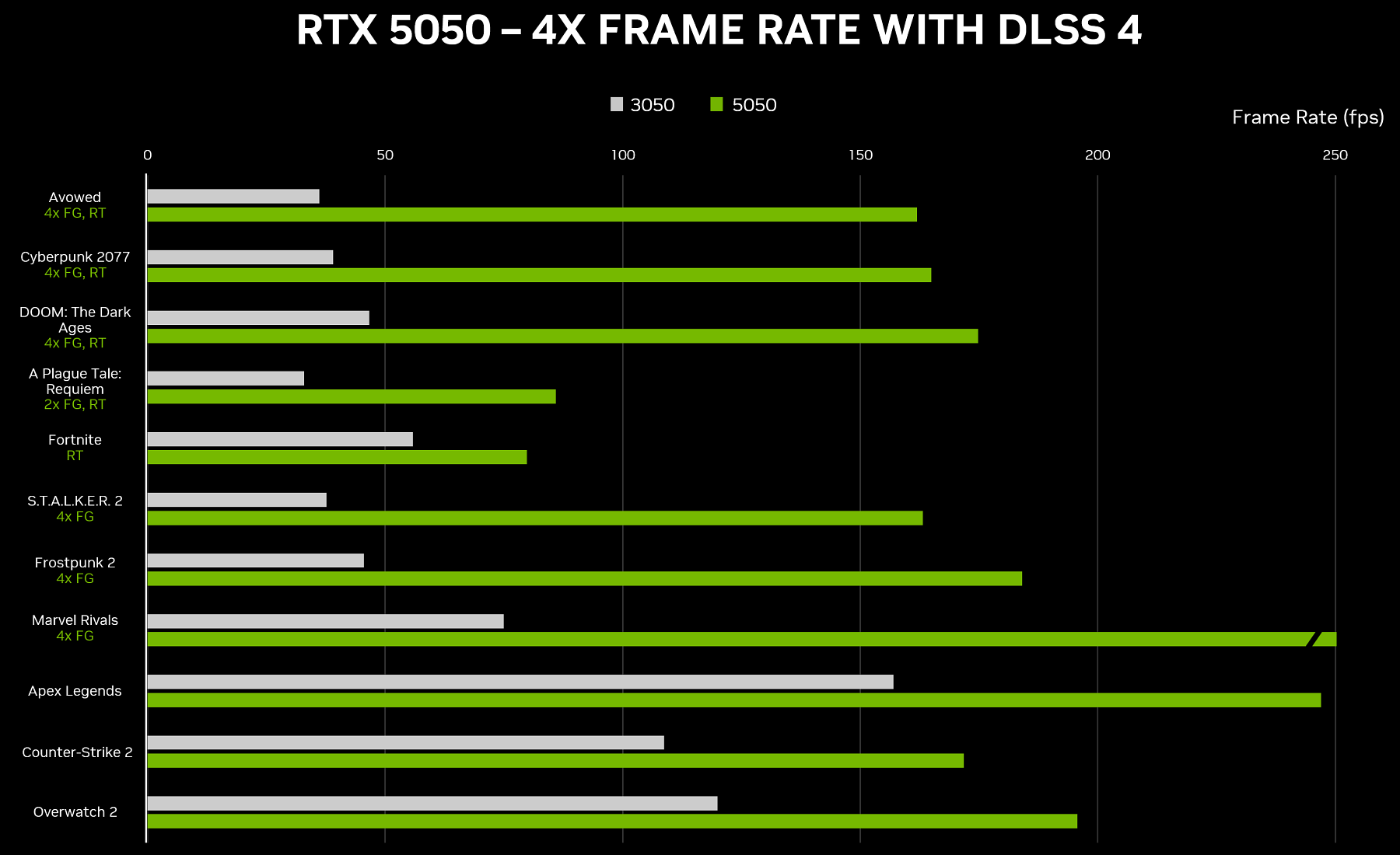 В классических играх без RT, а также в играх с RT и/или с технологиями динамического масштабирования DLSS(1/2/3)/FSR/XeSS новый ускоритель GeForce RTX 5050 находится на уровне GeForce RTX 4060 и Radeon RX 7600. В играх, где имеется возможность задействовать DLSS 4 (Multi Frame Generation, MFG) и где объем памяти в 8 ГБ не является ключевым ограничителем, его производительность резко возрастает.