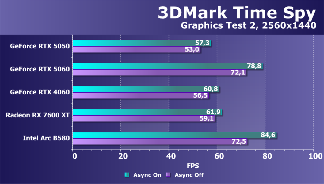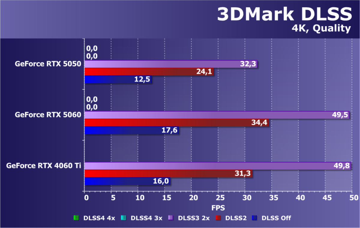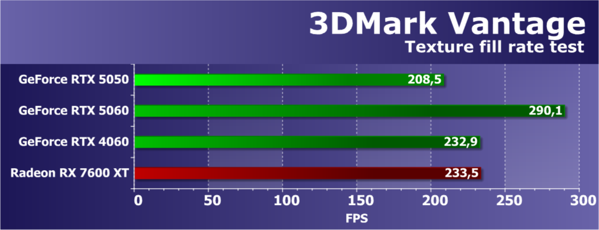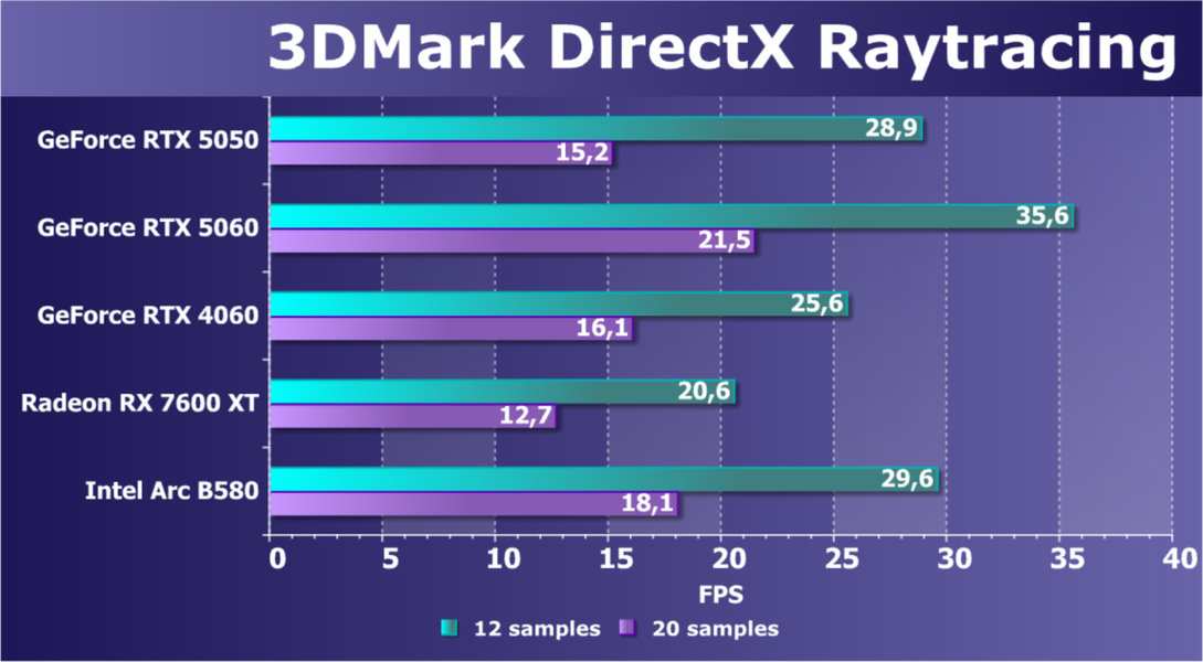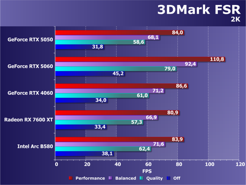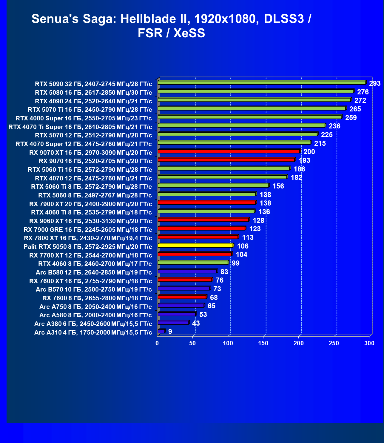 В классических играх без RT, а также в играх с RT и/или с технологиями динамического масштабирования DLSS(1/2/3)/FSR/XeSS новый ускоритель GeForce RTX 5050 находится на уровне GeForce RTX 4060 и Radeon RX 7600. В играх, где имеется возможность задействовать DLSS 4 (Multi Frame Generation, MFG) и где объем памяти в 8 ГБ не является ключевым ограничителем, его производительность резко возрастает.