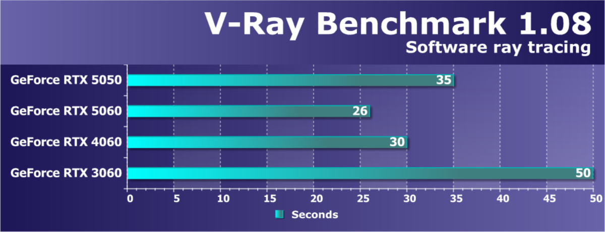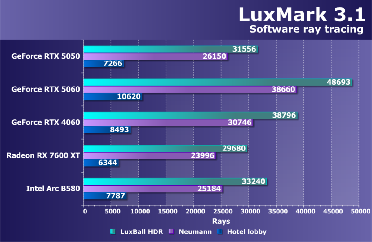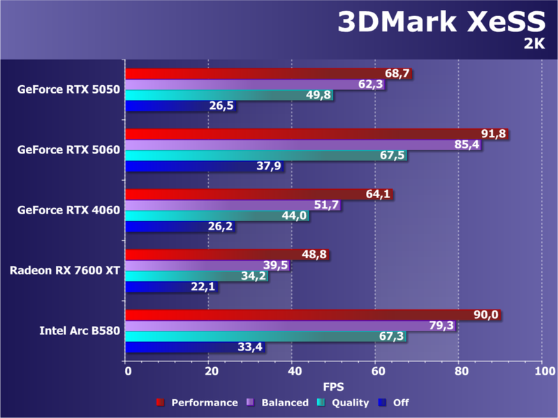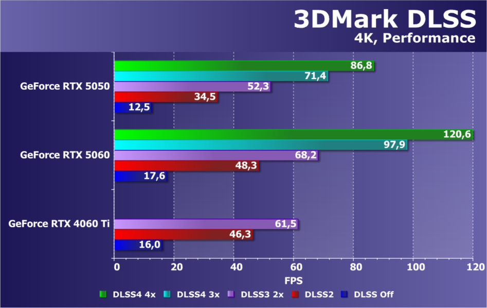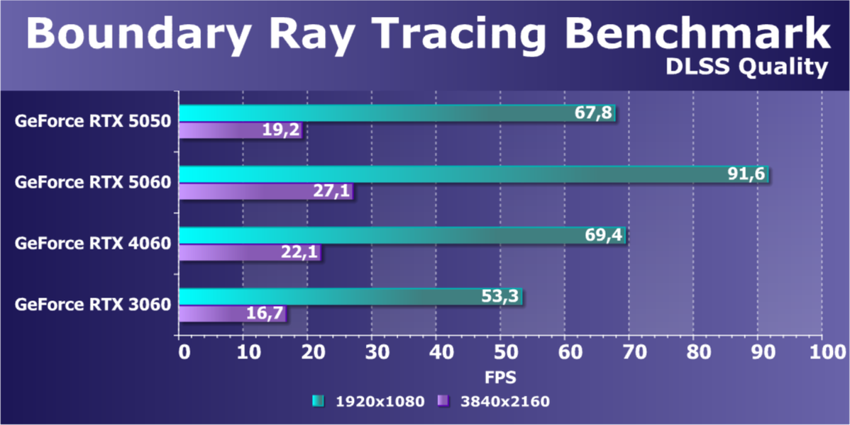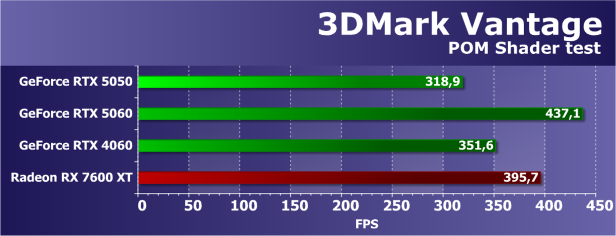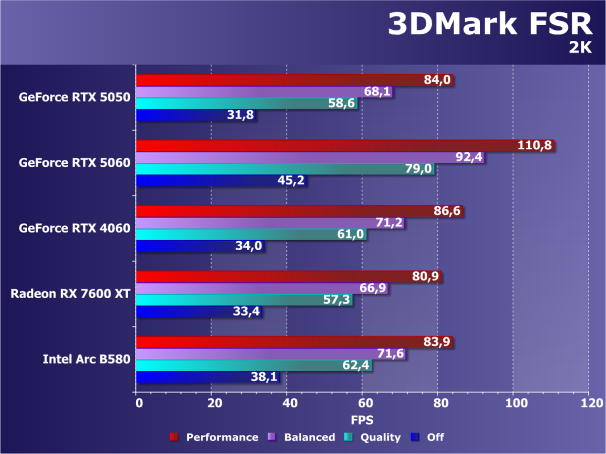 В классических играх без RT, а также в играх с RT и/или с технологиями динамического масштабирования DLSS(1/2/3)/FSR/XeSS новый ускоритель GeForce RTX 5050 находится на уровне GeForce RTX 4060 и Radeon RX 7600. В играх, где имеется возможность задействовать DLSS 4 (Multi Frame Generation, MFG) и где объем памяти в 8 ГБ не является ключевым ограничителем, его производительность резко возрастает.