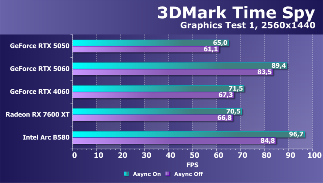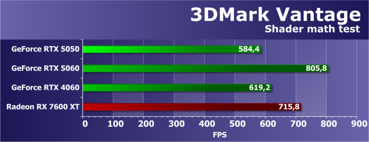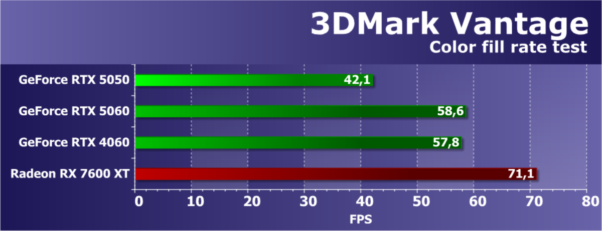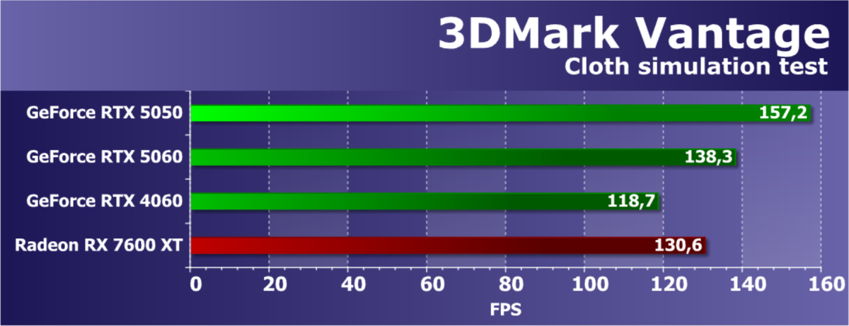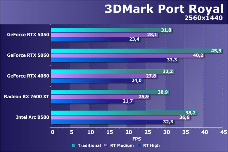 В классических играх без RT и технологий масштабирования GeForce RTX 5050 по производительности примерно соответствует модели на уровень выше из предыдущего поколения — GeForce RTX 4060, а из карт конкурента очень близок к Radeon RX 7600.