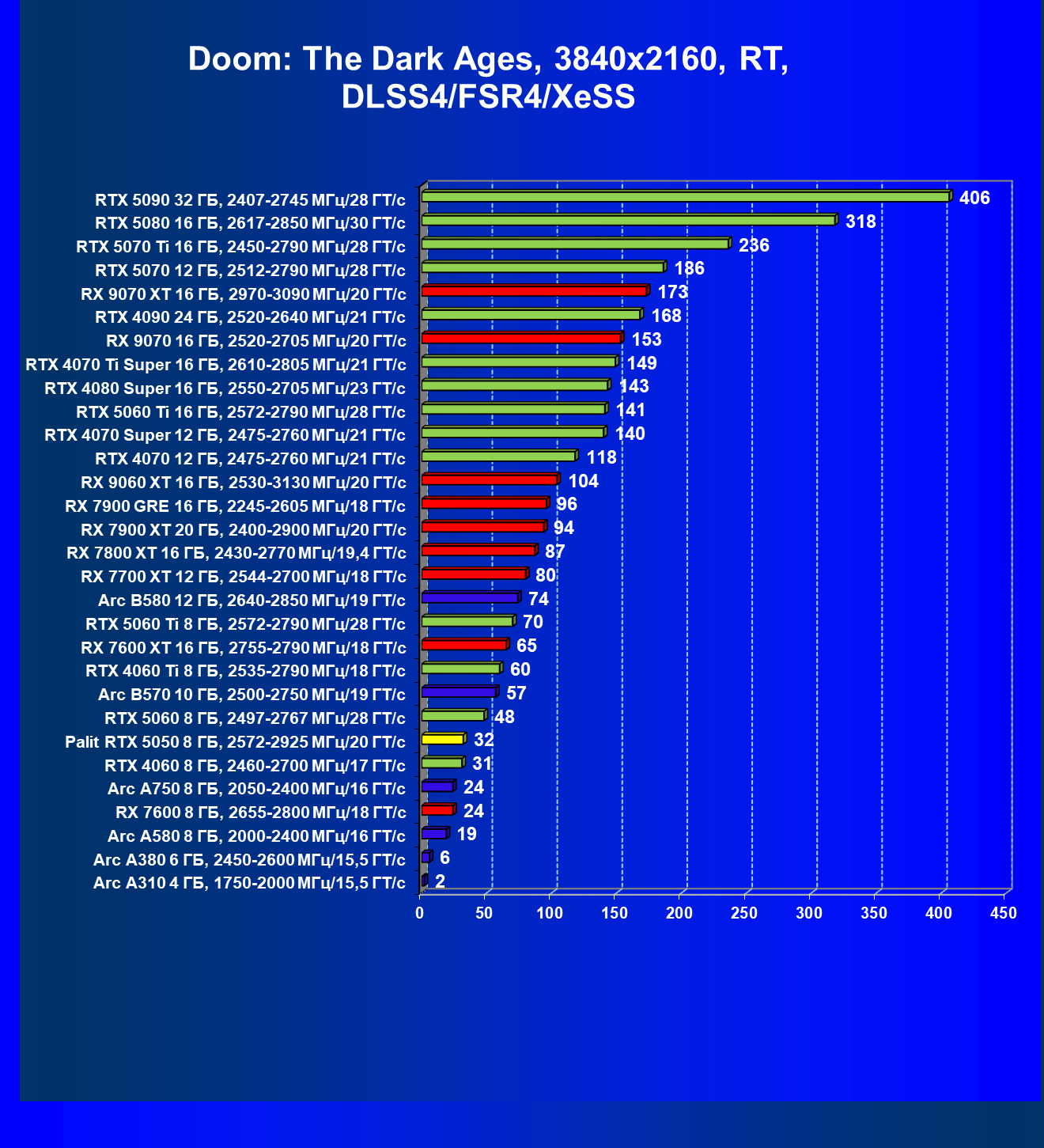 | 27 | Arc A750 8 ГБ, 2050—2400 МГц/16 ГТ/с | 392 | 151 | 26 000 |