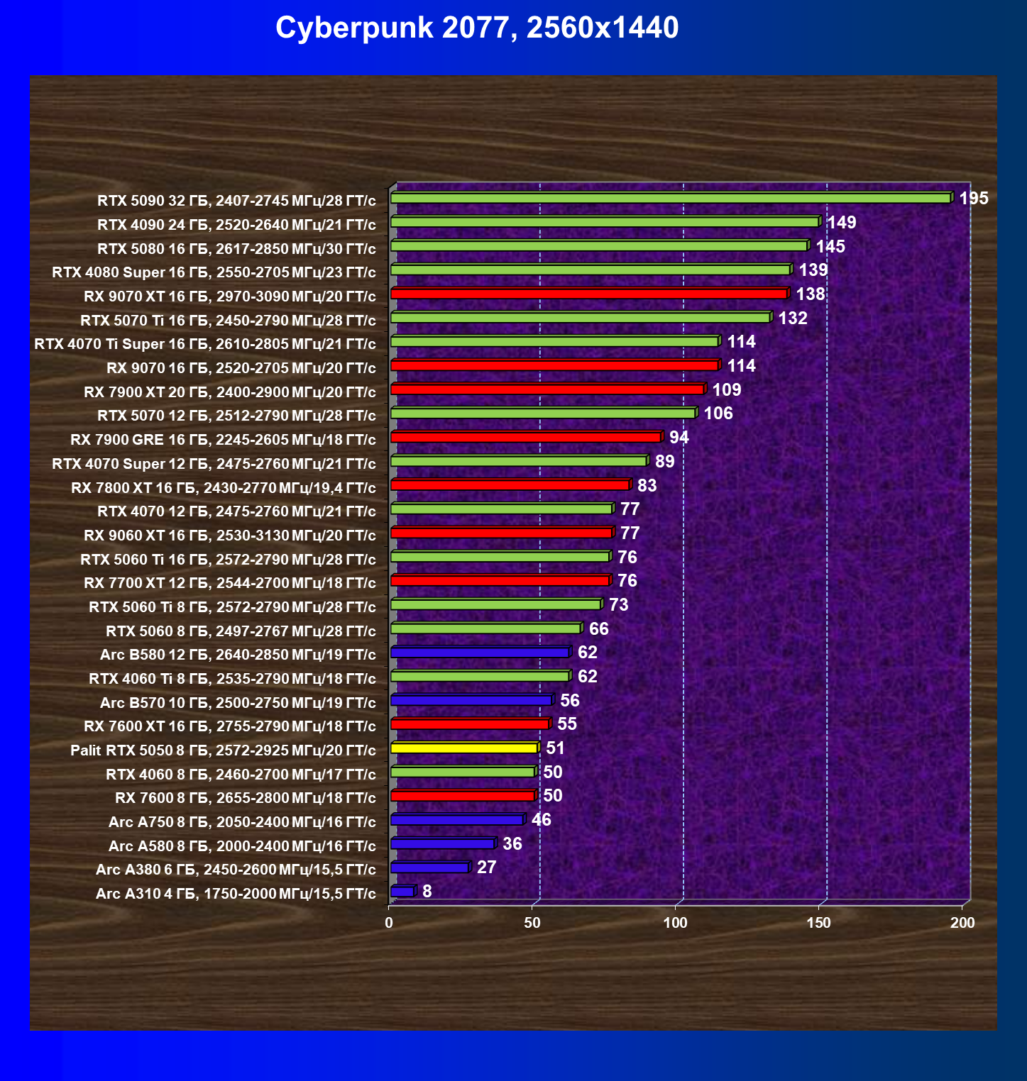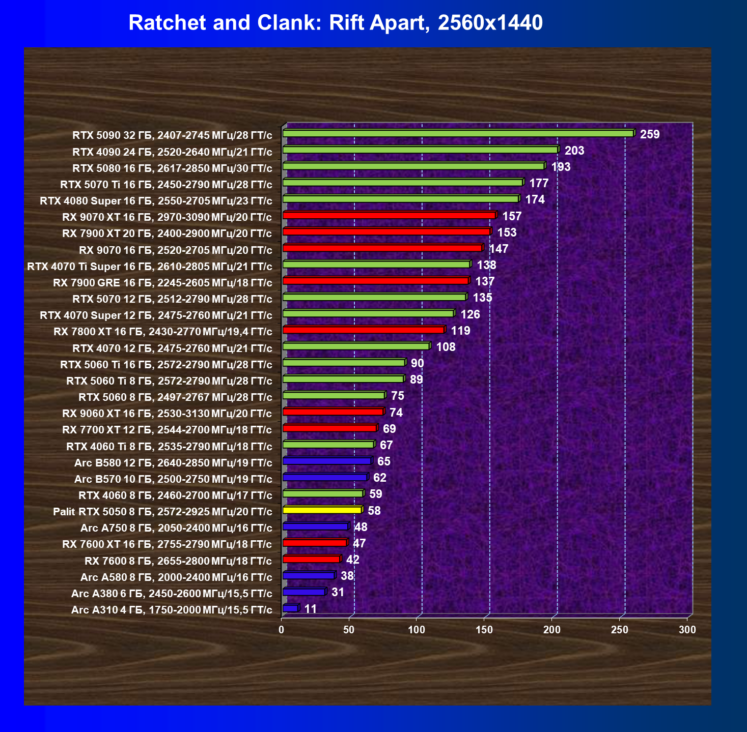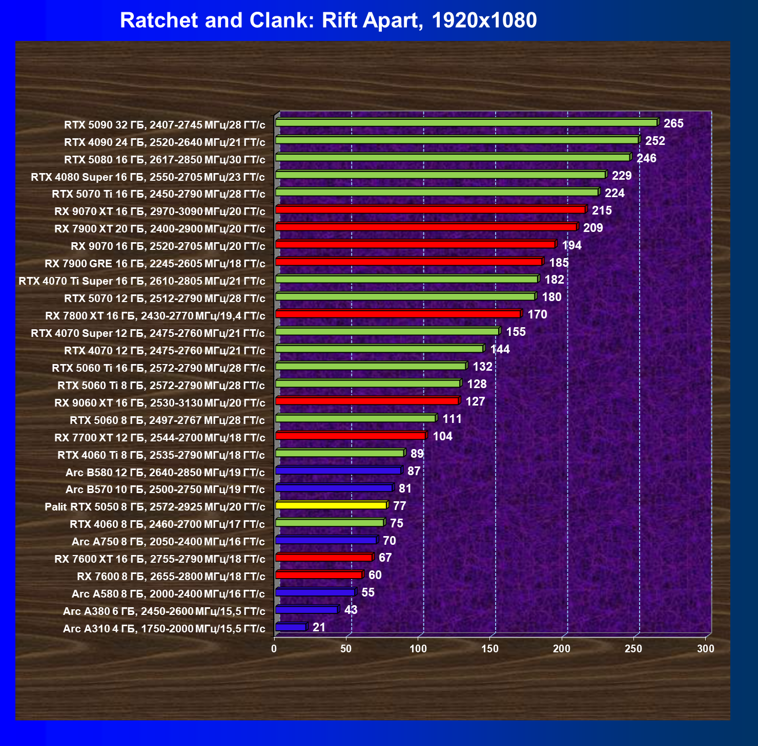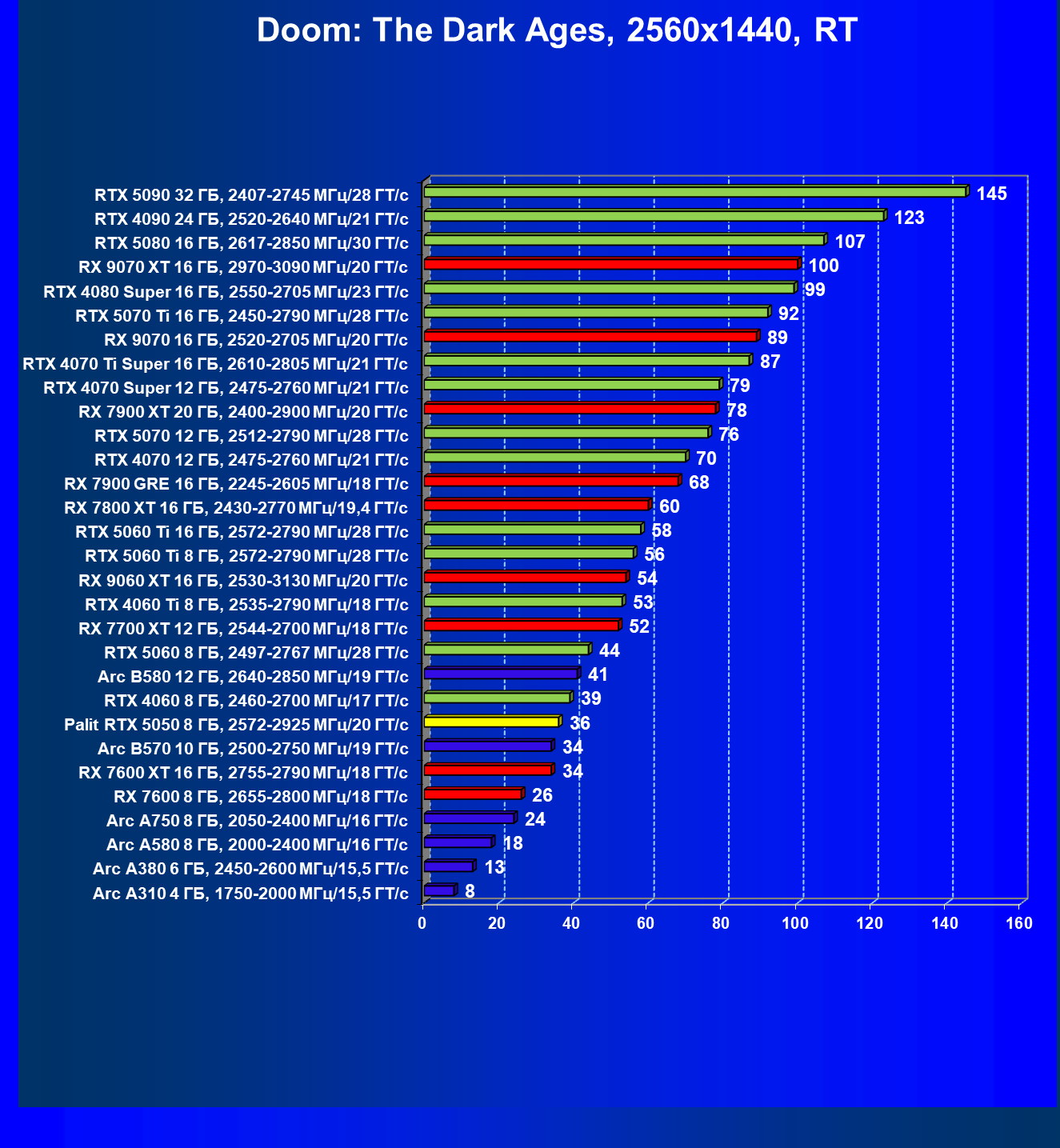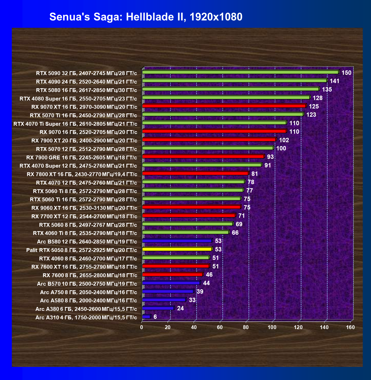 | 10 | Palit RTX 5050 8 ГБ, 2572—2925 МГц/20 ГТ/с | 149 | 447 | 30 000 |