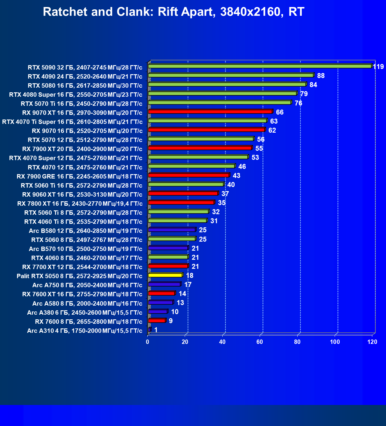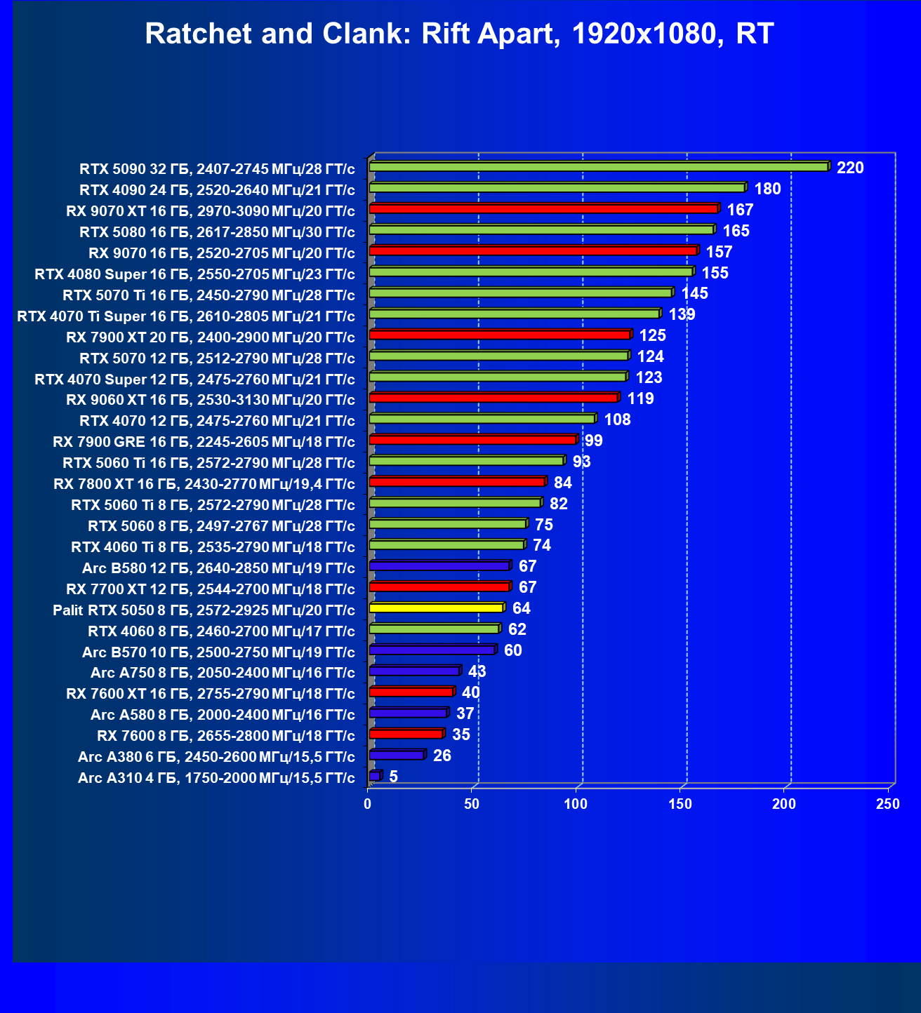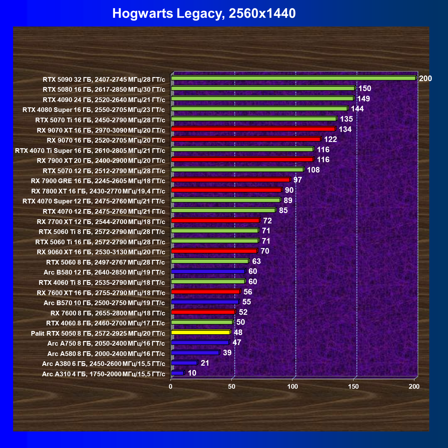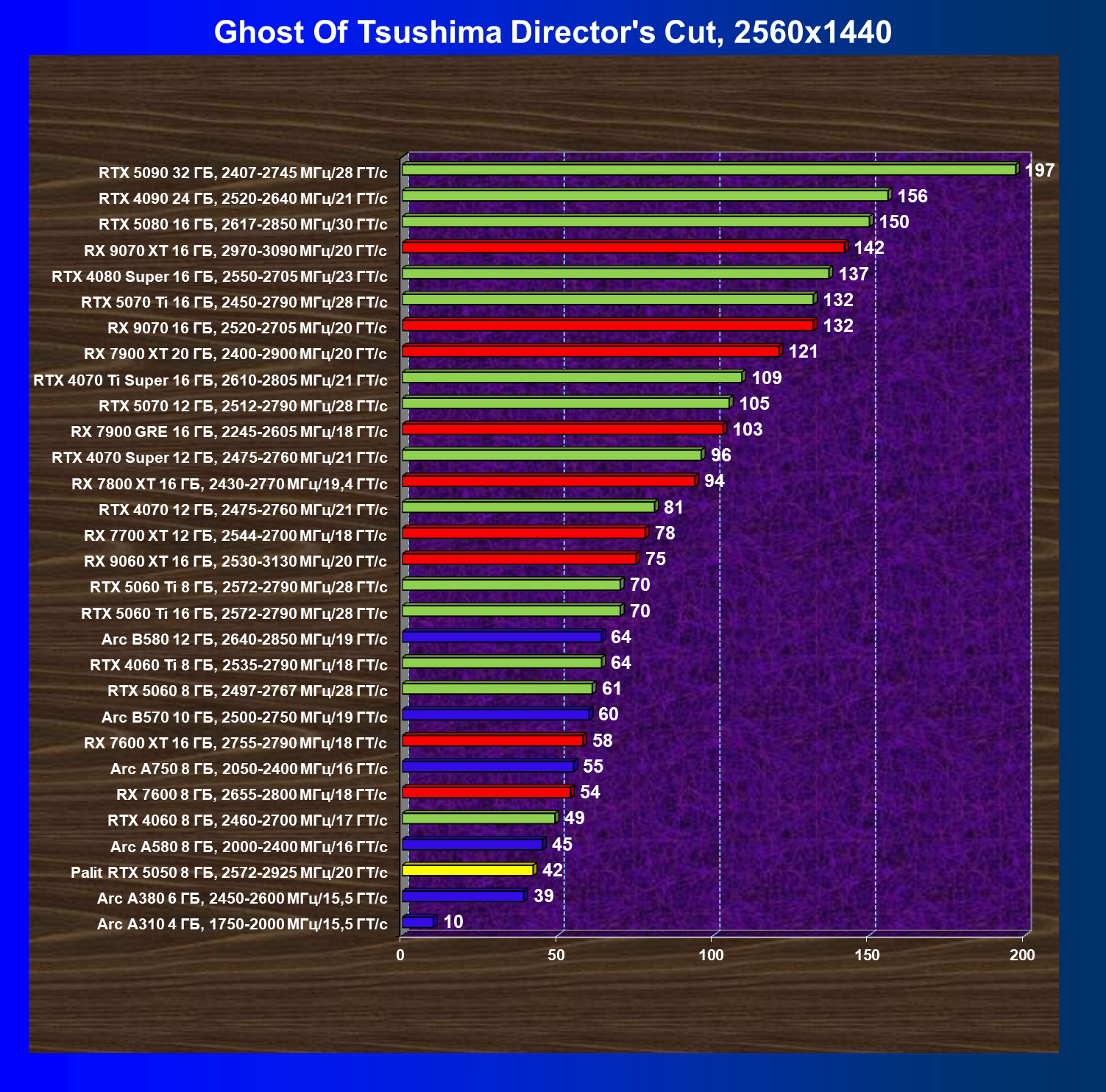 | 10 | Palit RTX 5050 8 ГБ, 2572—2925 МГц/20 ГТ/с | 149 | 447 | 30 000 |